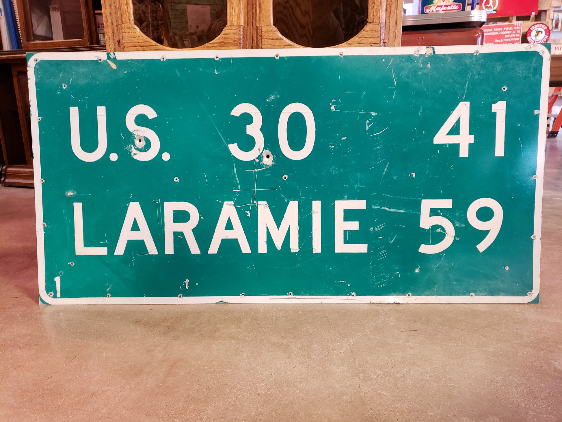 US Hwy 30 and Laramie Wyoming highway sign 24 x 48 inches. This is a genuine Wyoming highway sign, with the dings and dents expected from years of faithful service on the prairie. Grab a piece of Wyoming with this awesome sign!