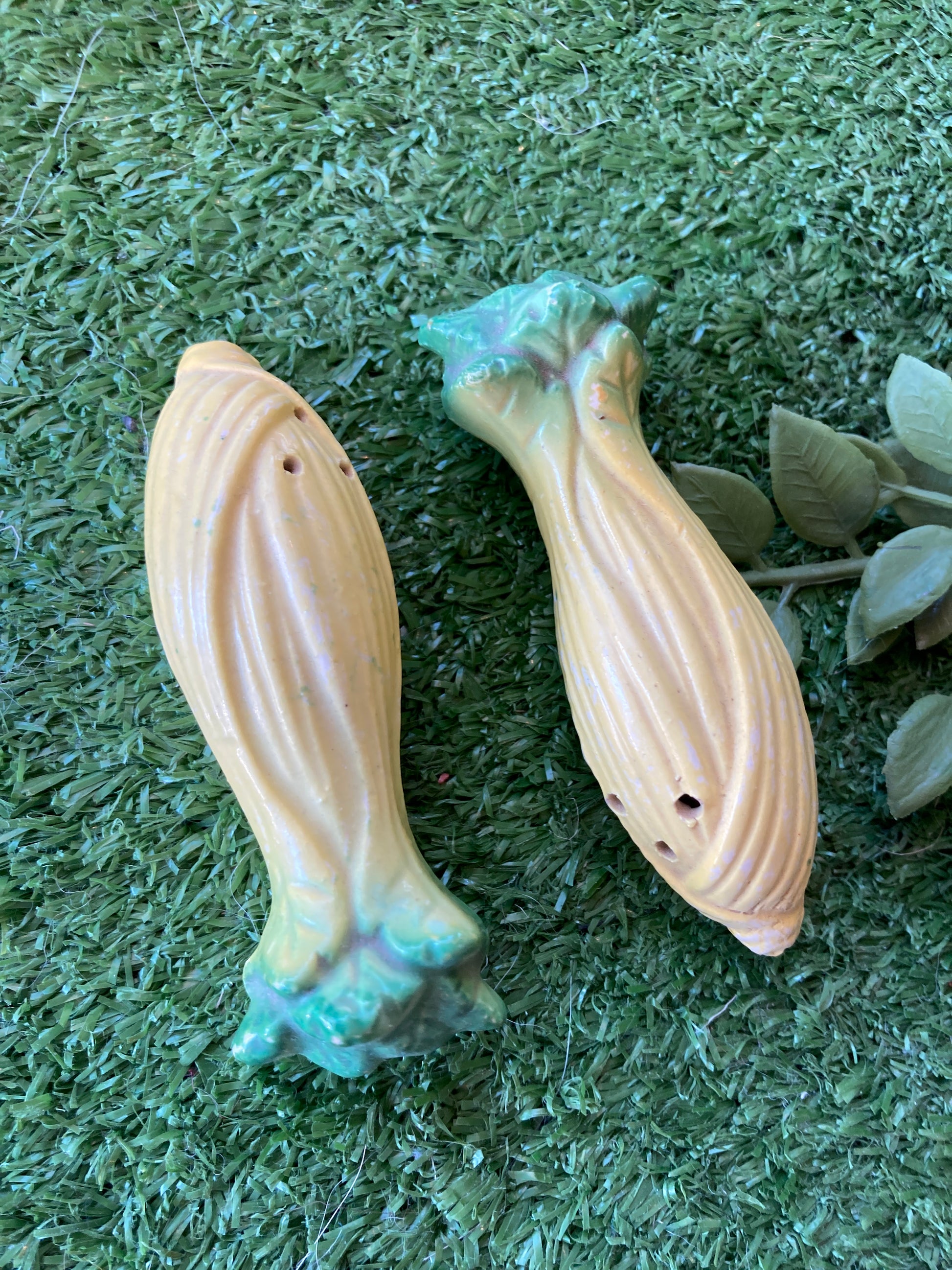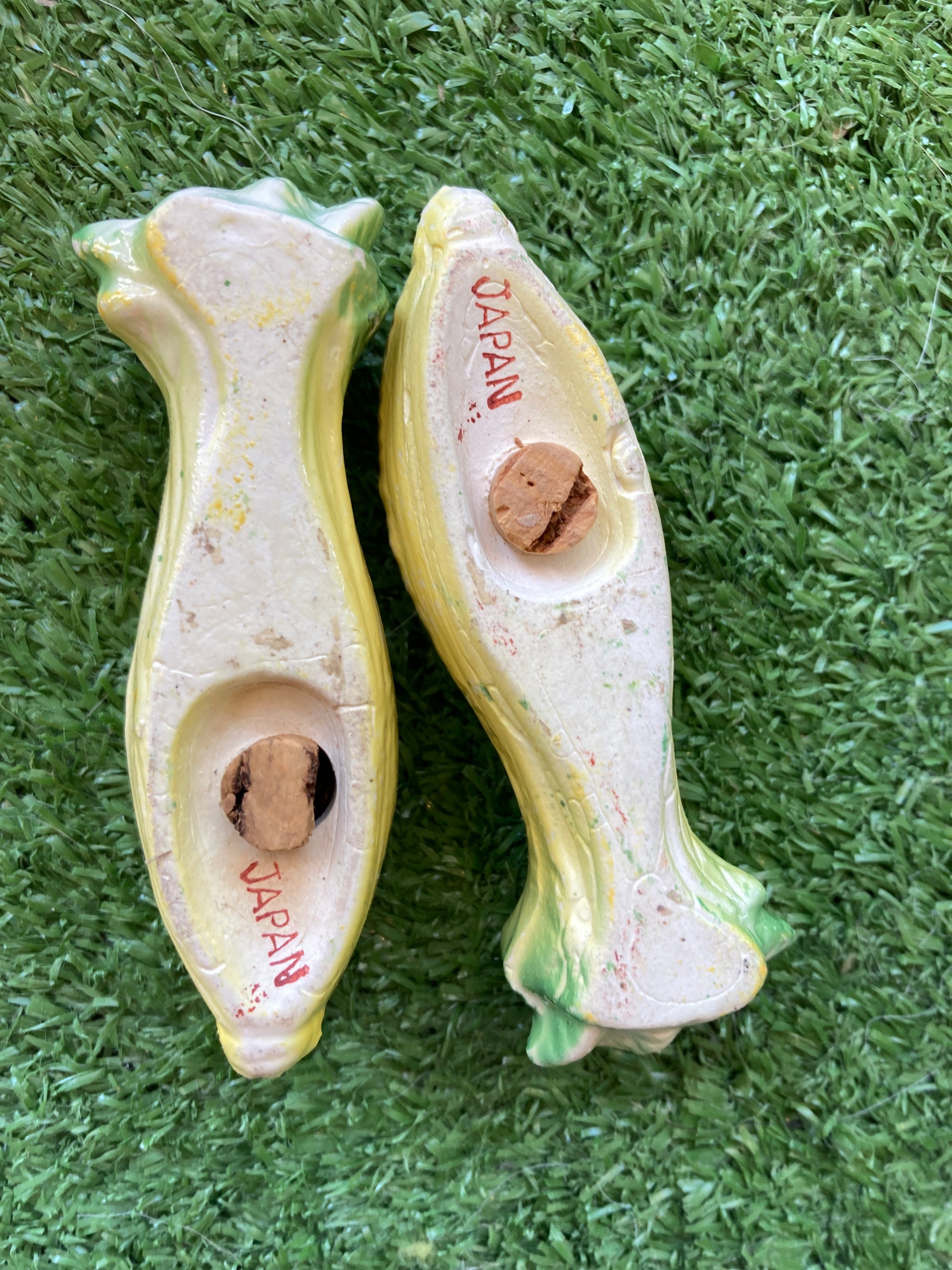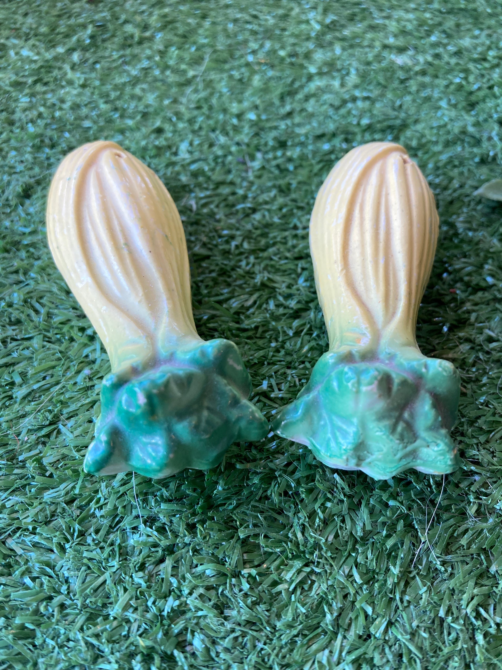 Leeks salt & pepper shakers made in Japan and are 3 inches long. In fair used condition.