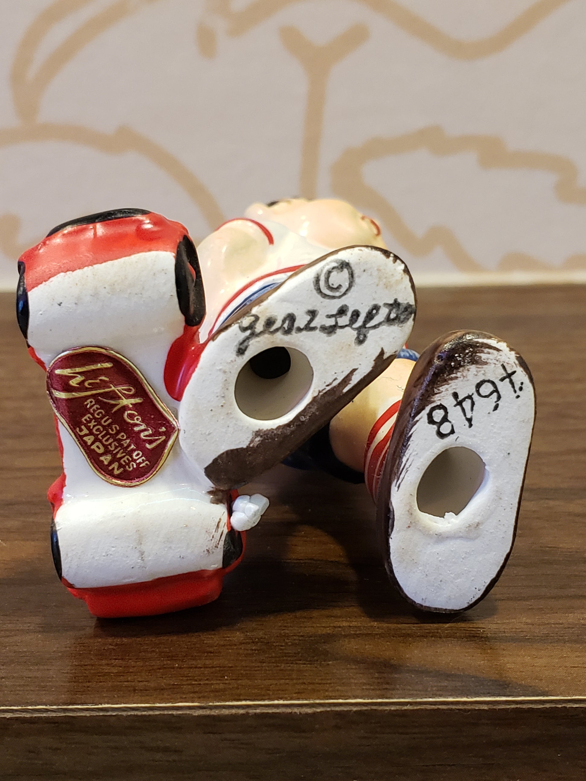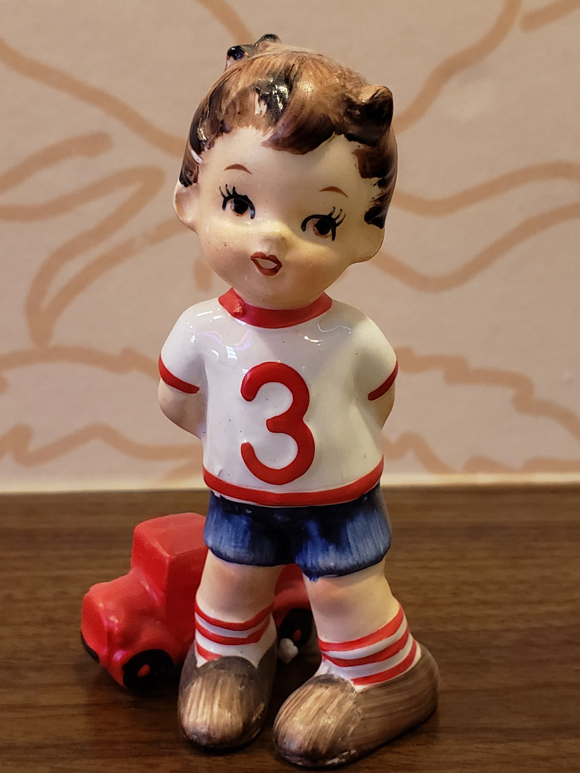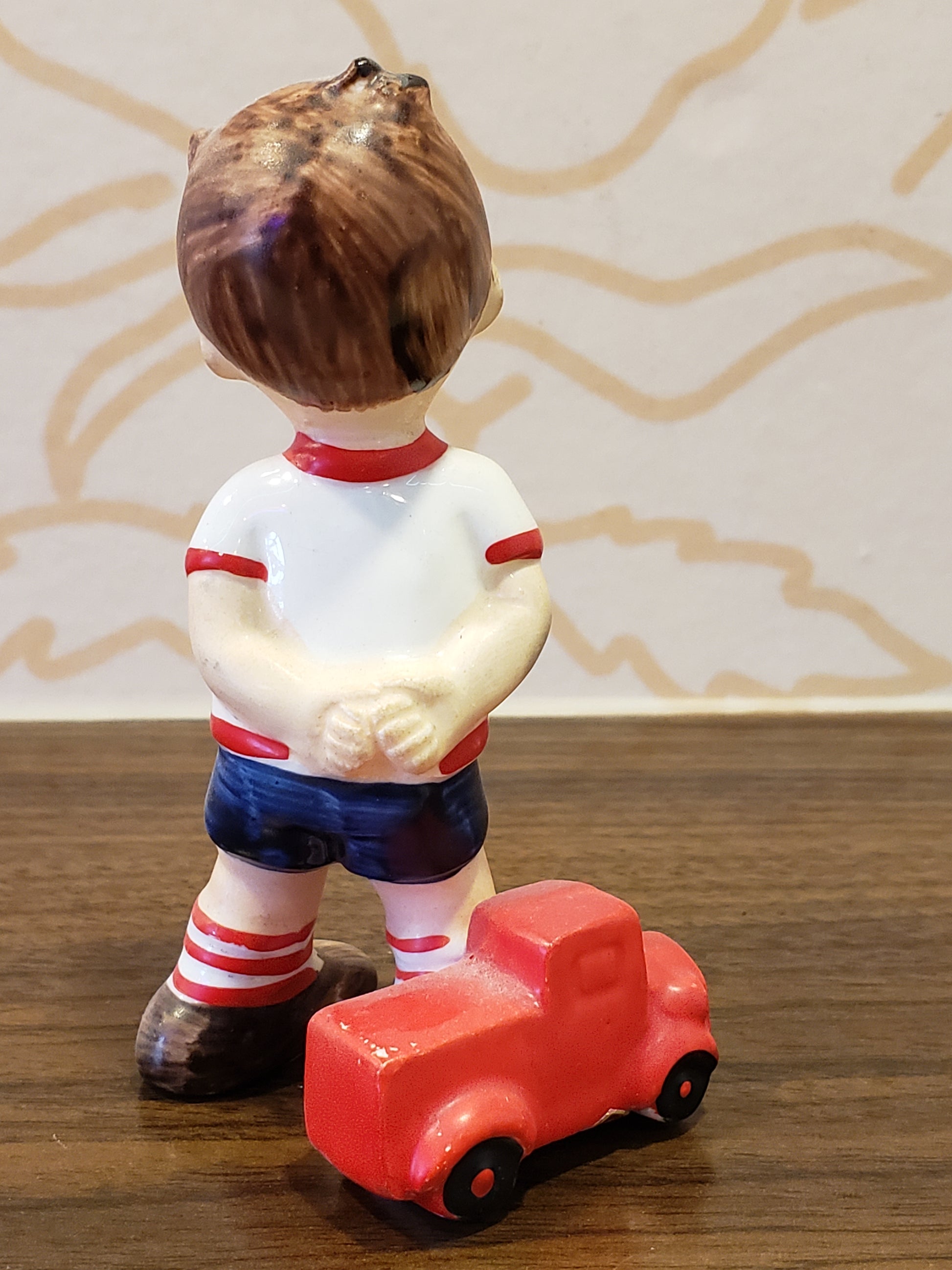 Celebrate the third birthday of your little one with this adorable Lefton Birthday Boy figurine! Made of high-quality porcelain, it features a cute boy holding a bright red toy truck. Perfect for a playful touch to any party or room decor. Fair vintage condition.