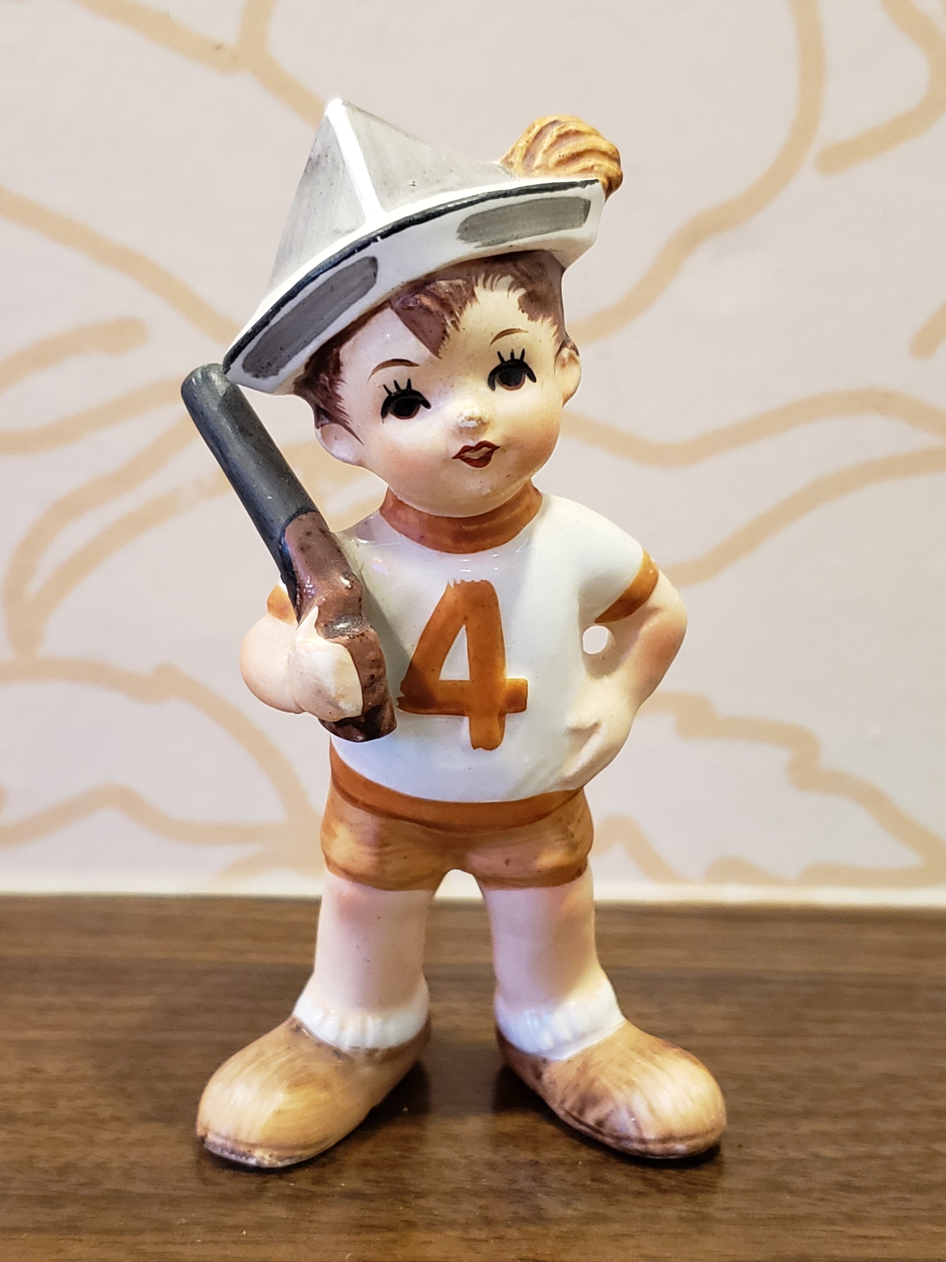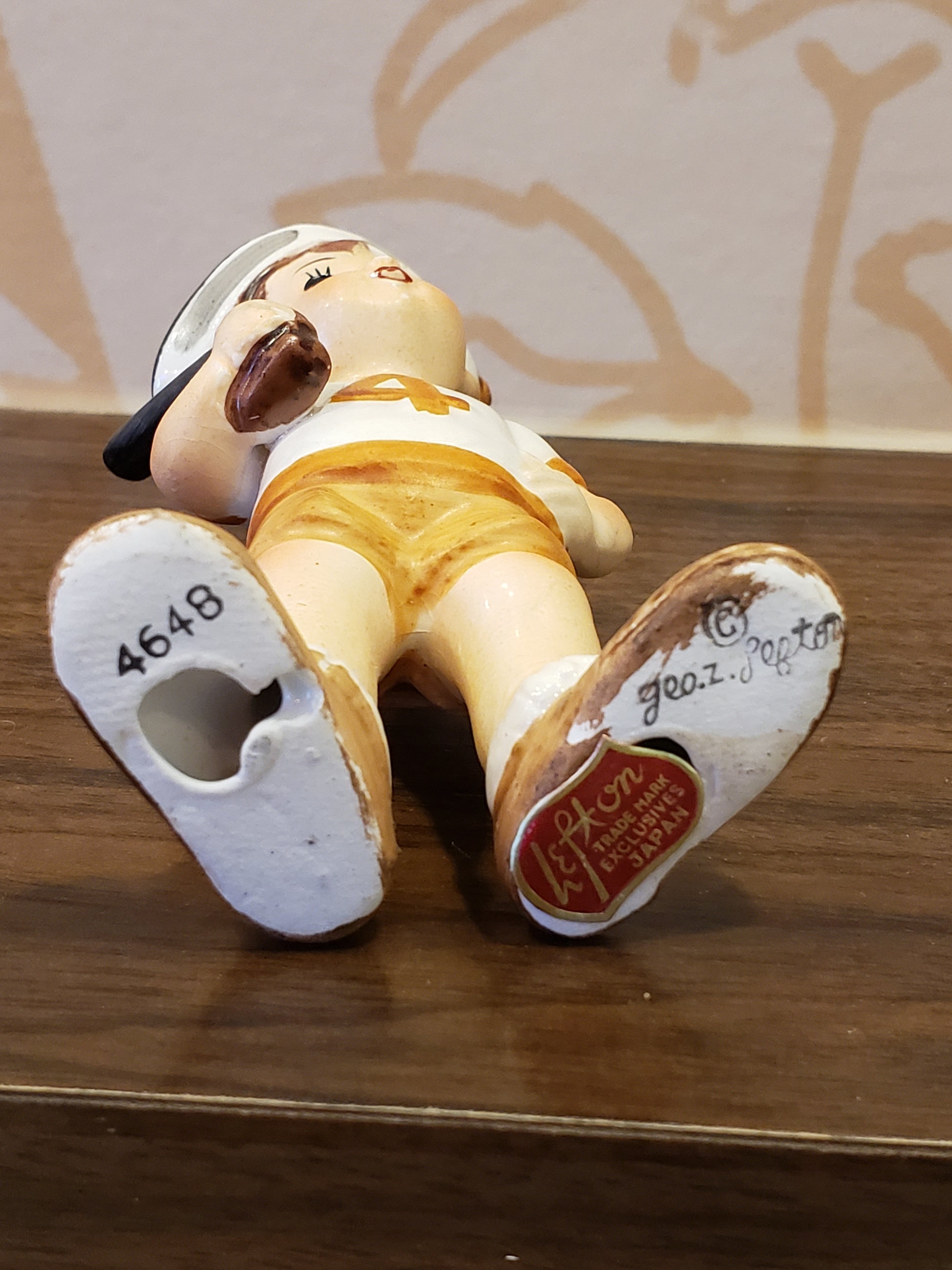 Ahoy, matey! Celebrate your little one's big day with this charming Lefton Birthday Boy Figurine (age 4). Dressed in his pirate hat and wielding a toy gun, this precious porcelain figurine is the perfect cake topper. Aye, aye, captain! This adorable collectible is in fair vintage condition.