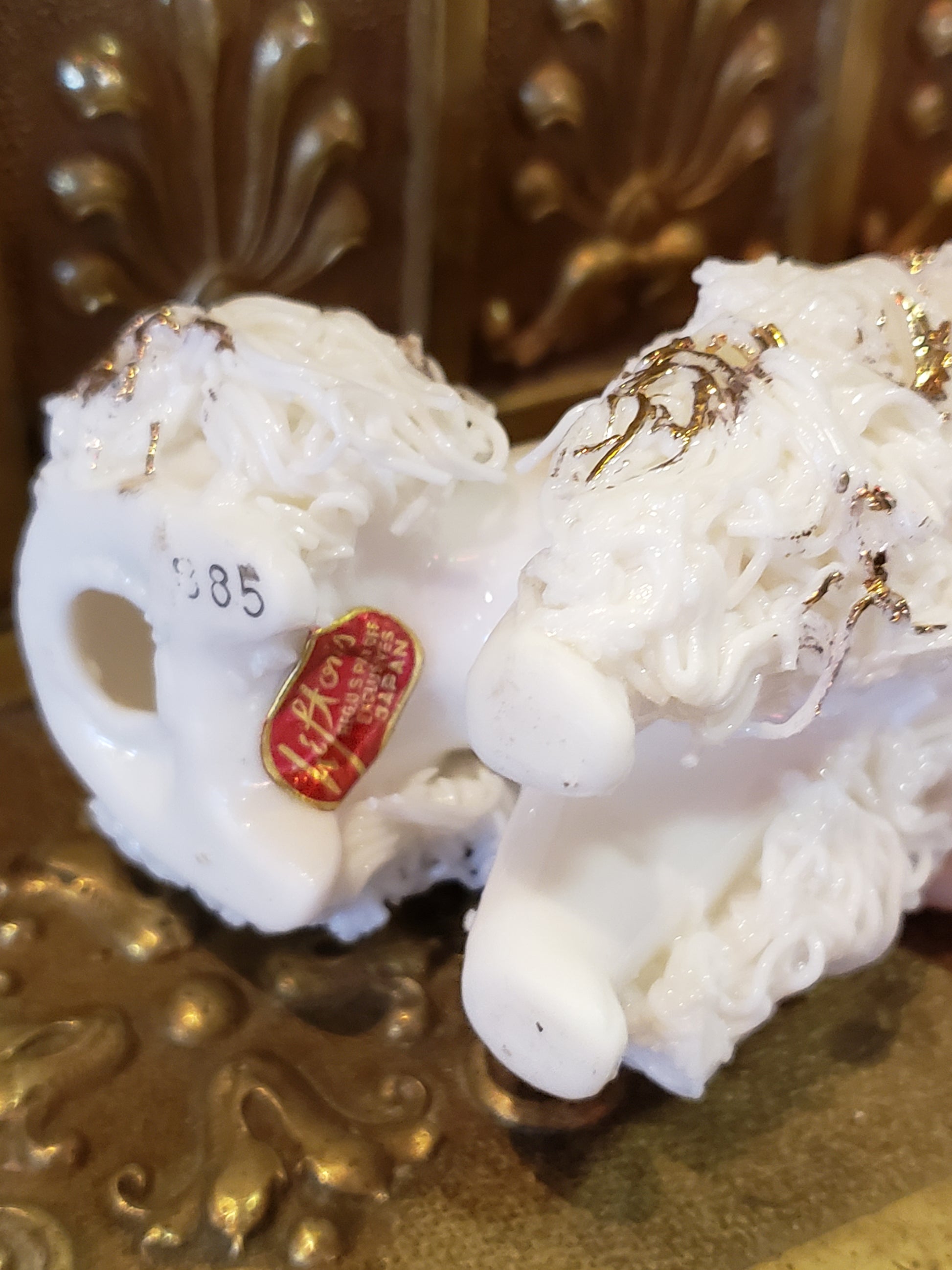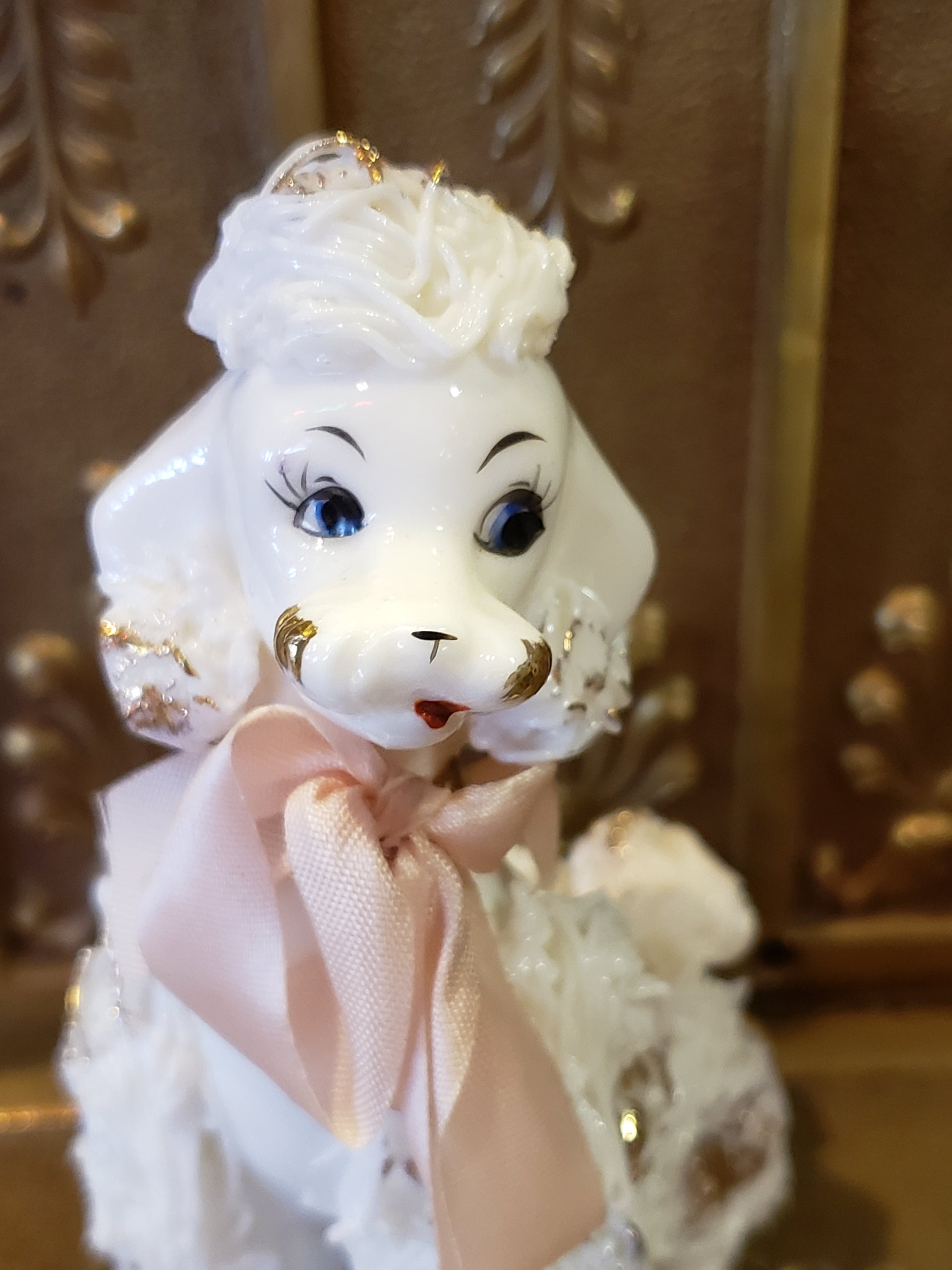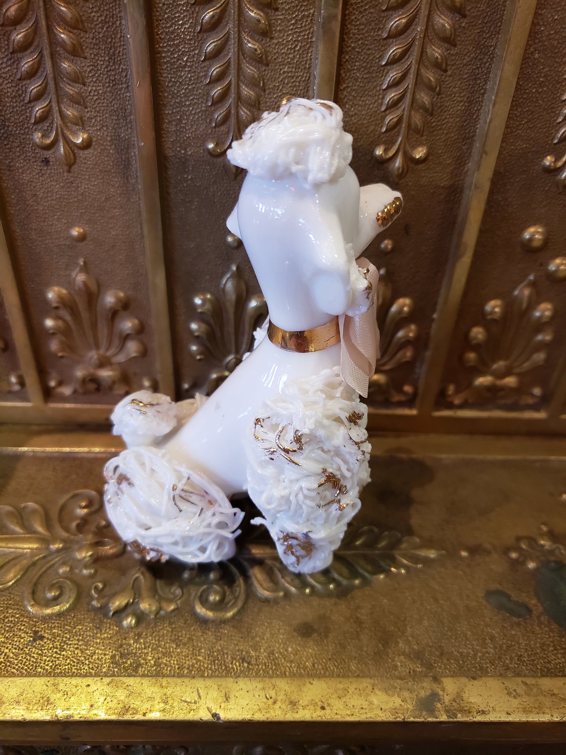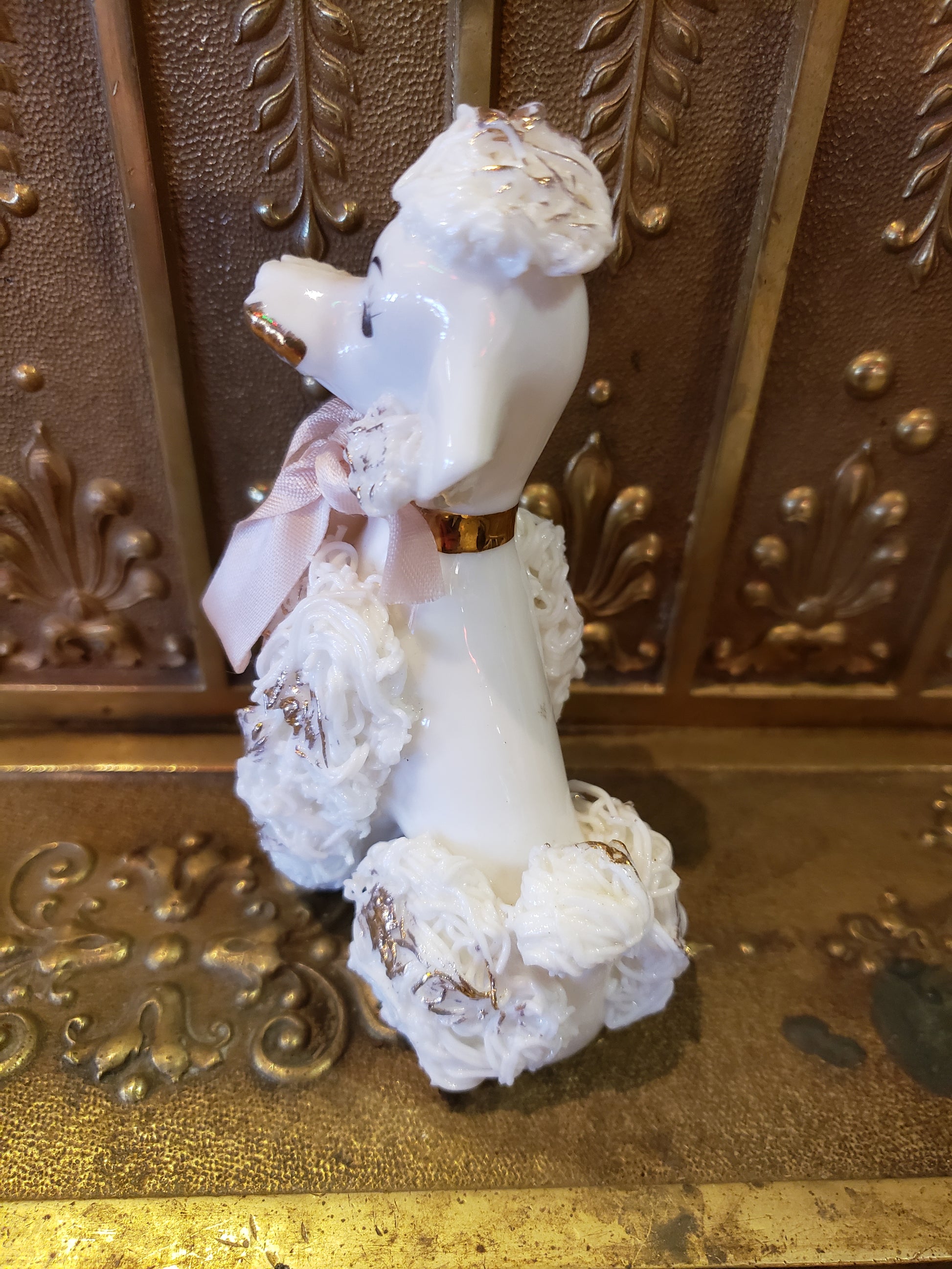 This Lefton Spaghetti Poodle is a highly sought-after collectible with porcelain "fur" shaped like spaghetti and hand painted golden accents. . Its unique design features a white poodle with a cute pink fabric bow, adding a touch of whimsy to any space. A must-have for any collector or dog lover. Add to your collection or give as a special gift. It still has the Lefton sticker and has number 885 on the bottom.