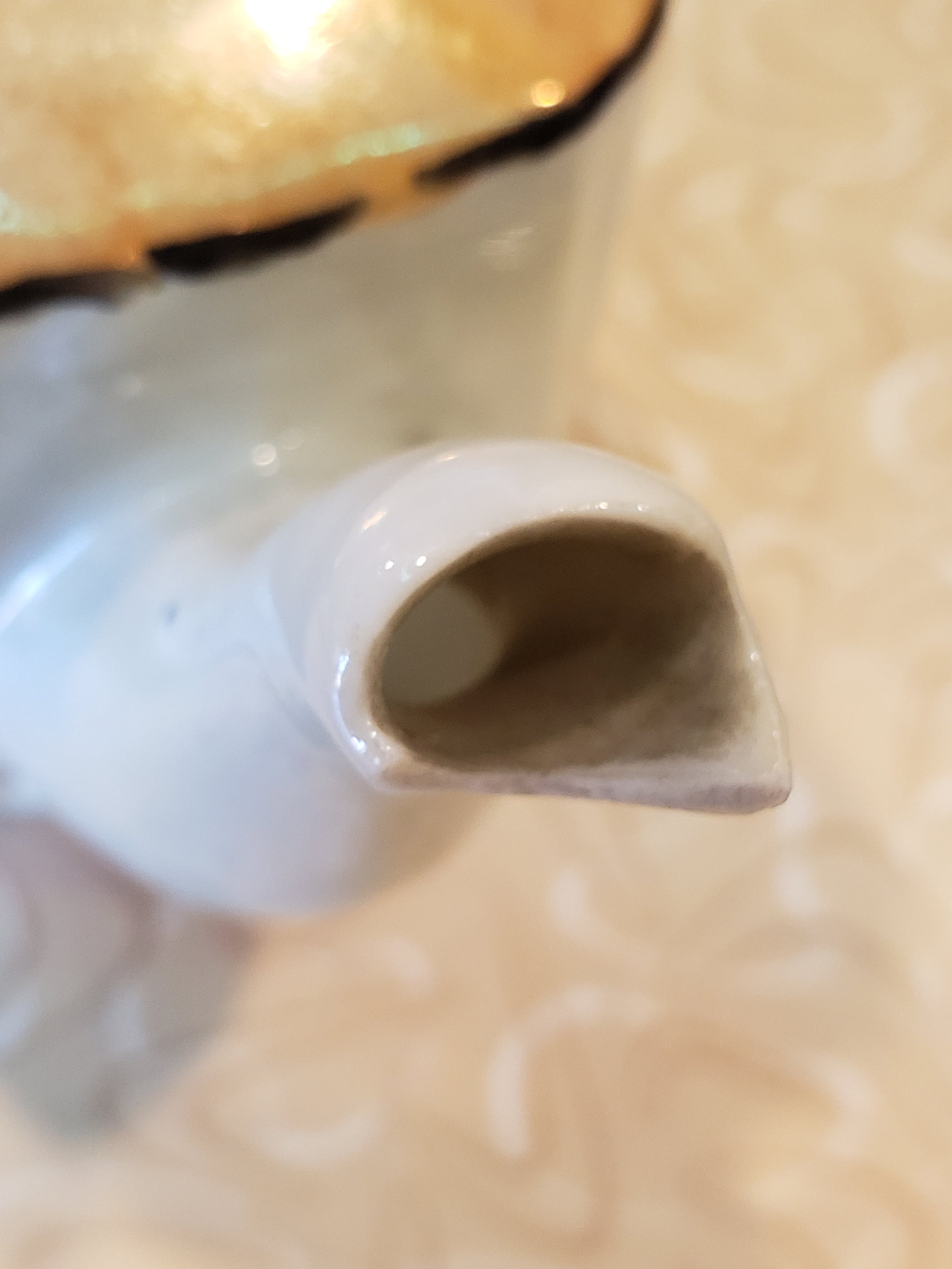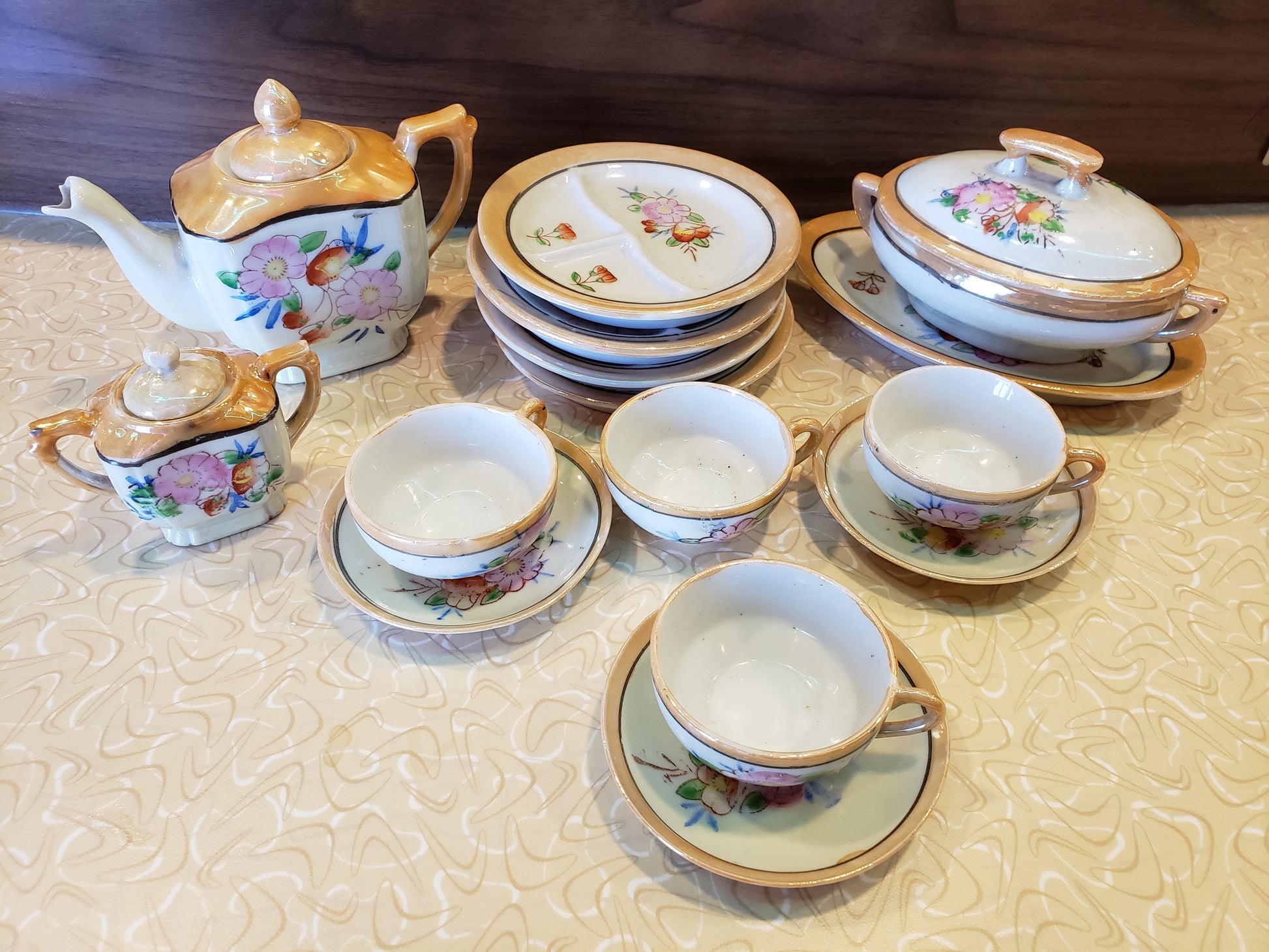 This charming porcelain 15-piece mini tea set, made in Japan, features a vintage lusterware design. The set includes 4 divided plates, 3 saucers, 4 teacups, a teapot with lid, a creamer with lid, and a sugar bowl with platter and lid. Perfect for a pretend tea party with friends! The lid on the sugar bowl is glued, and the tip of the tea pot is chipped off. Pretty floral set with lustrous peach colored details.