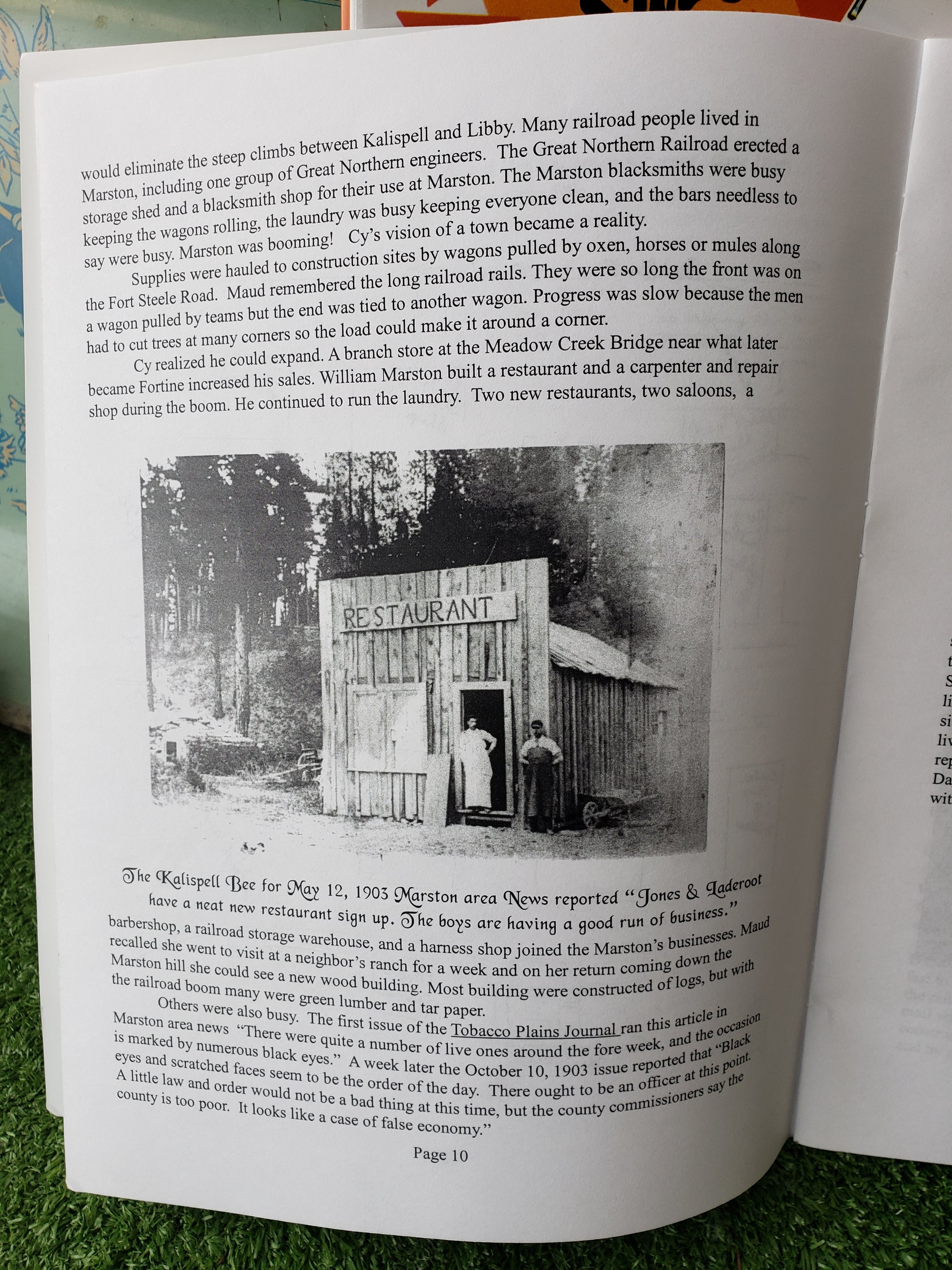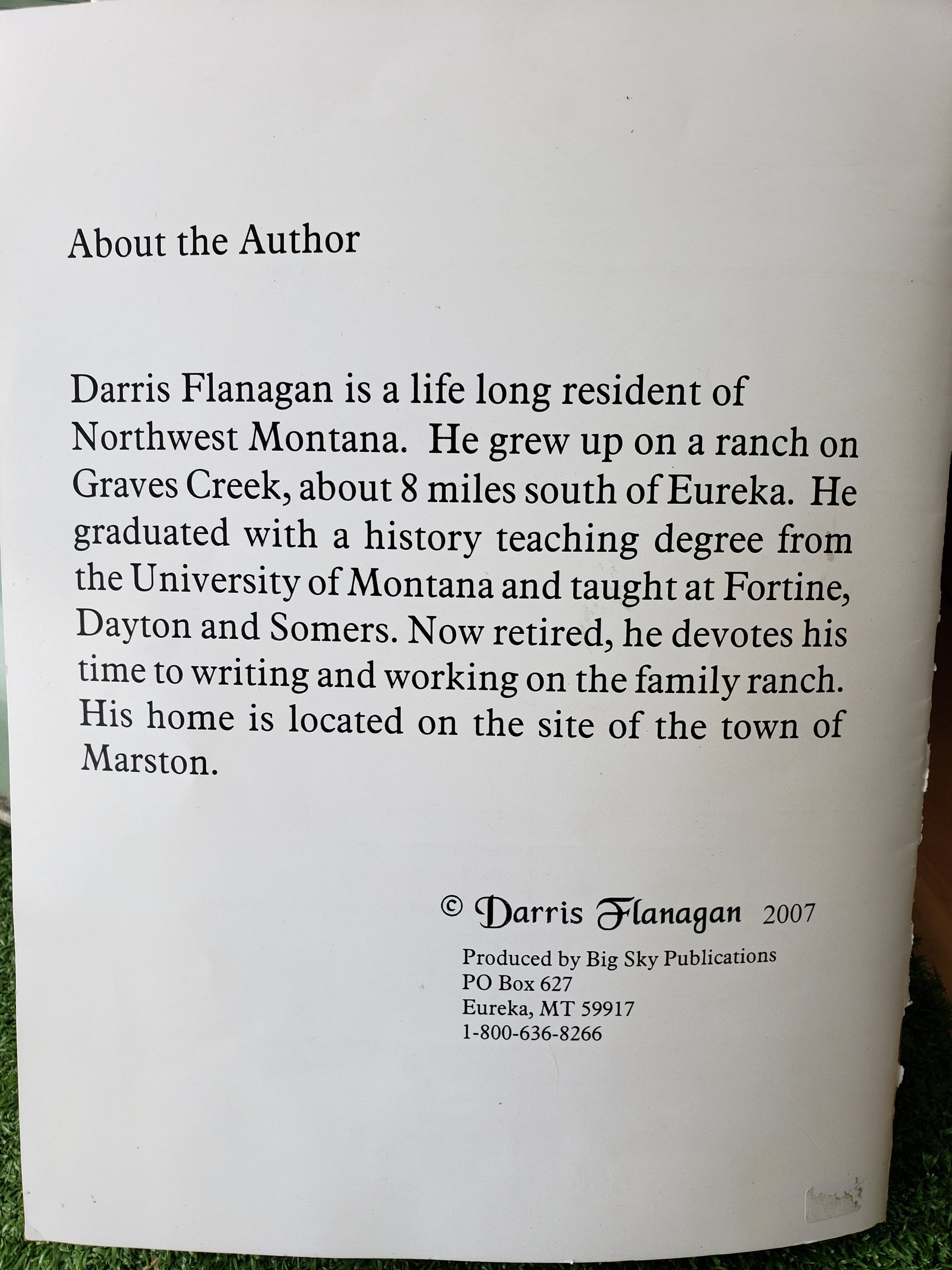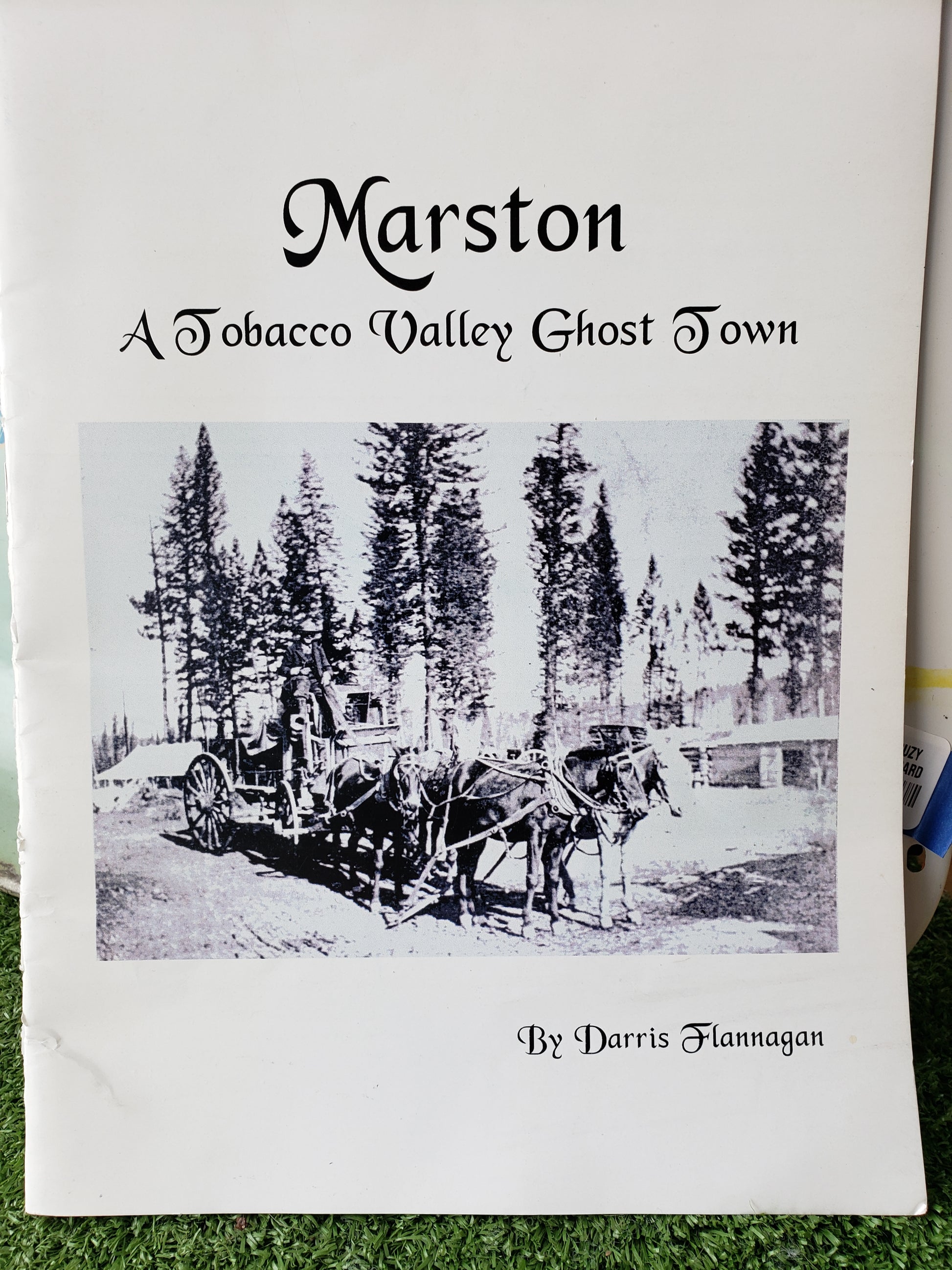 Marston, A Tobacco Valley Ghost Town by Darris Flannagan. This is a 28 page paper book book about the town of Marston, Montana which was near Eureka Montana. It contains copies of lots of letters and photographs of early pioneers and their stories. Interesting history book in fair used condition. This is an autographed copy!