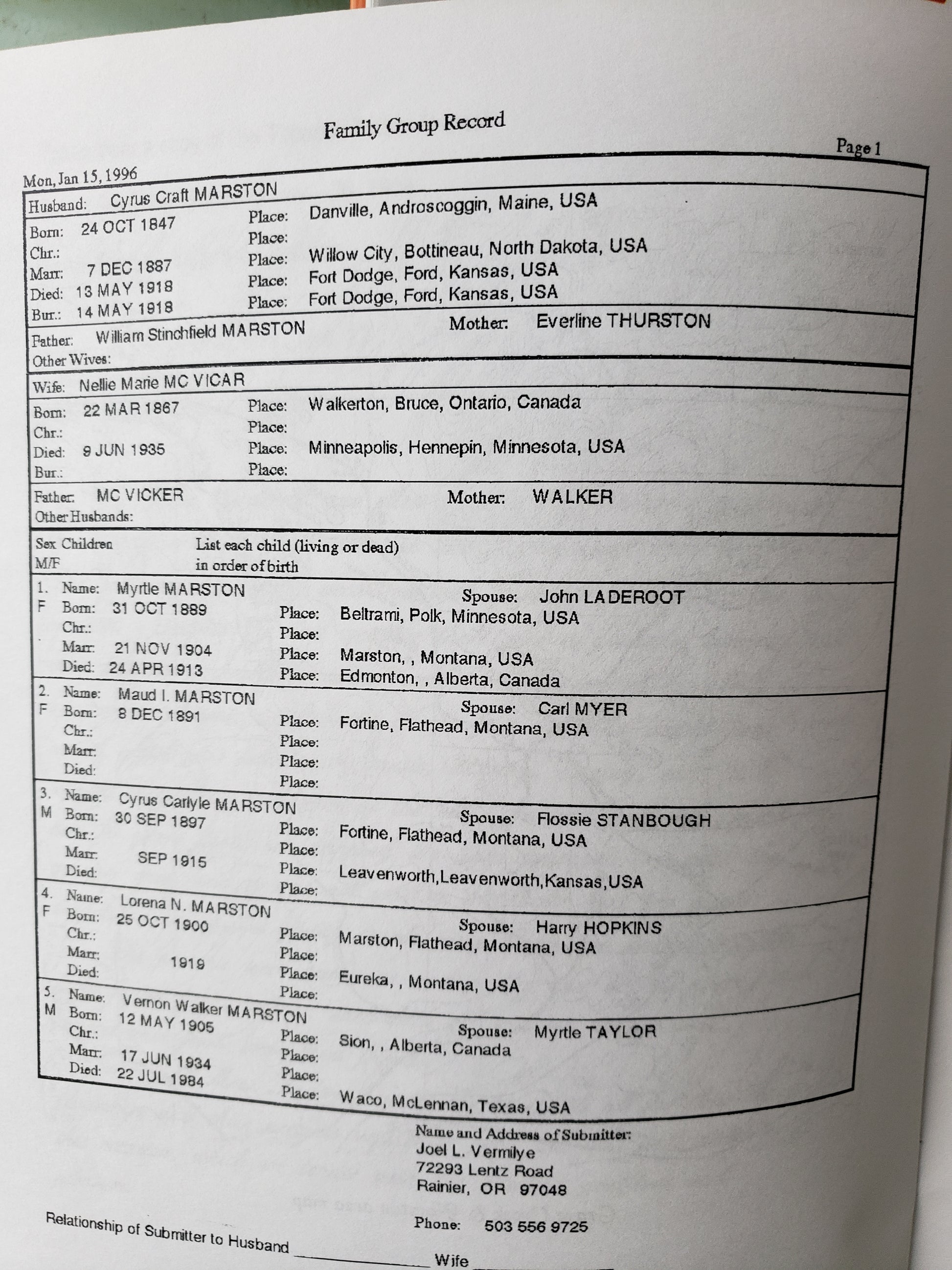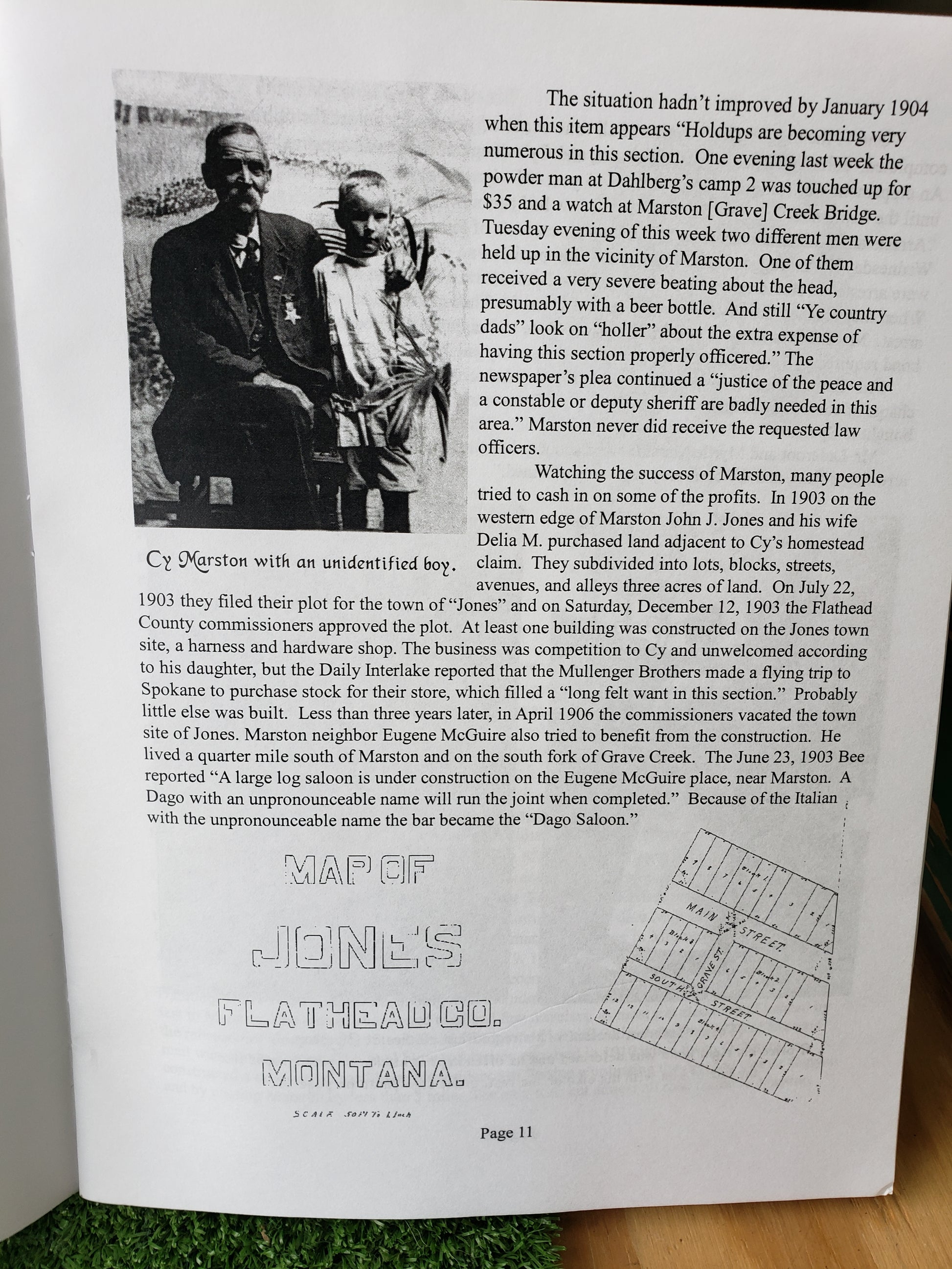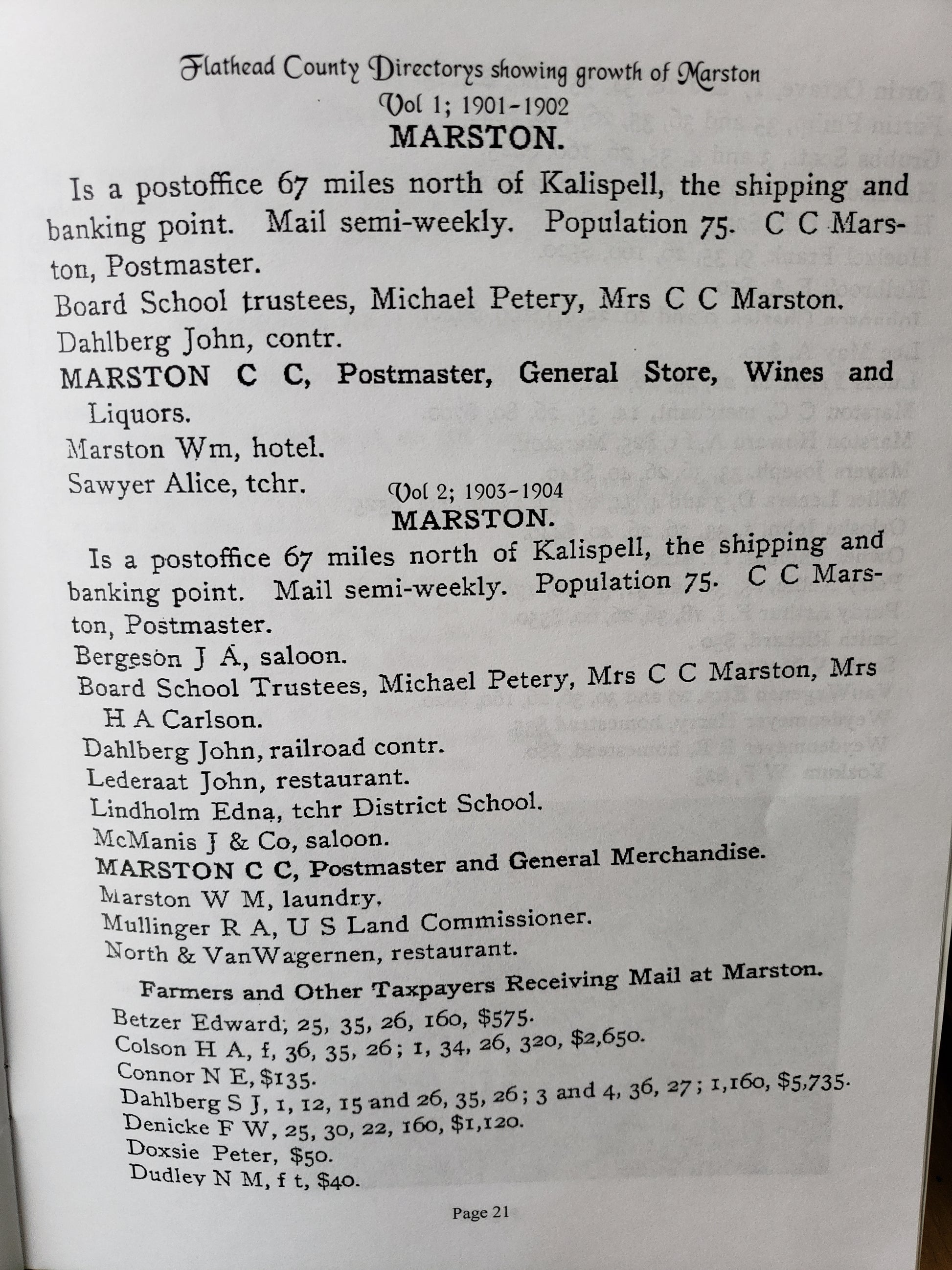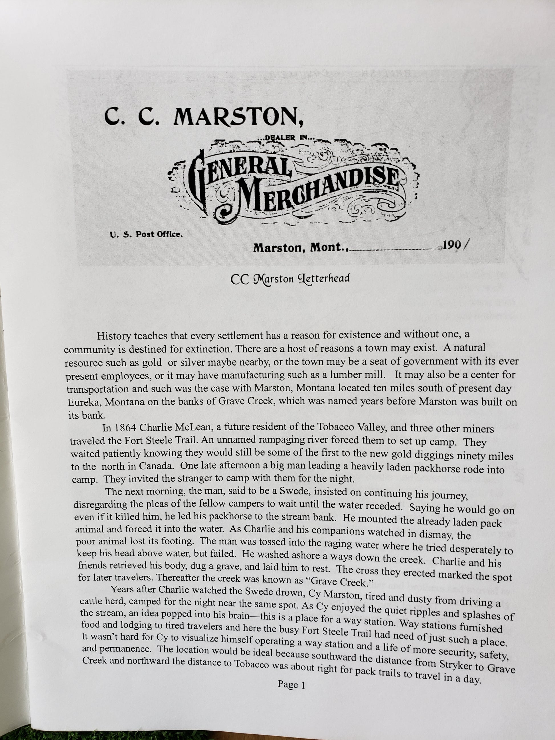 Marston, A Tobacco Valley Ghost Town by Darris Flannagan. This is a 28 page paper book book about the town of Marston, Montana which was near Eureka Montana. It contains copies of lots of letters and photographs of early pioneers and their stories. Interesting history book in fair used condition. This is an autographed copy!