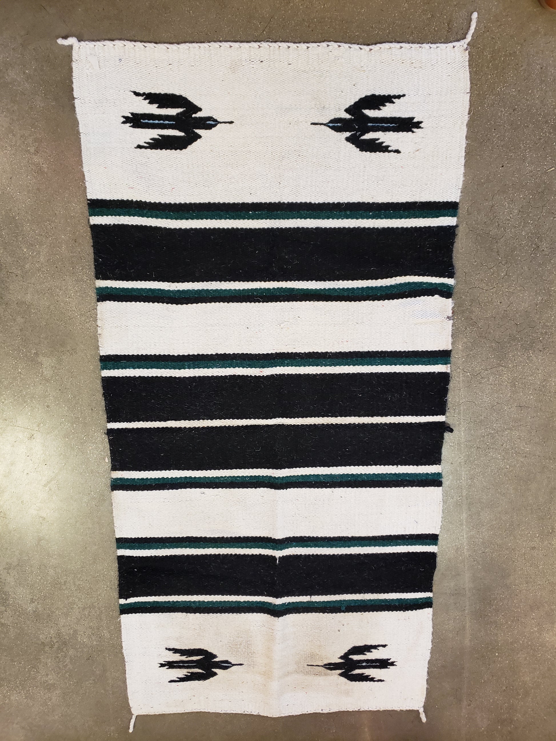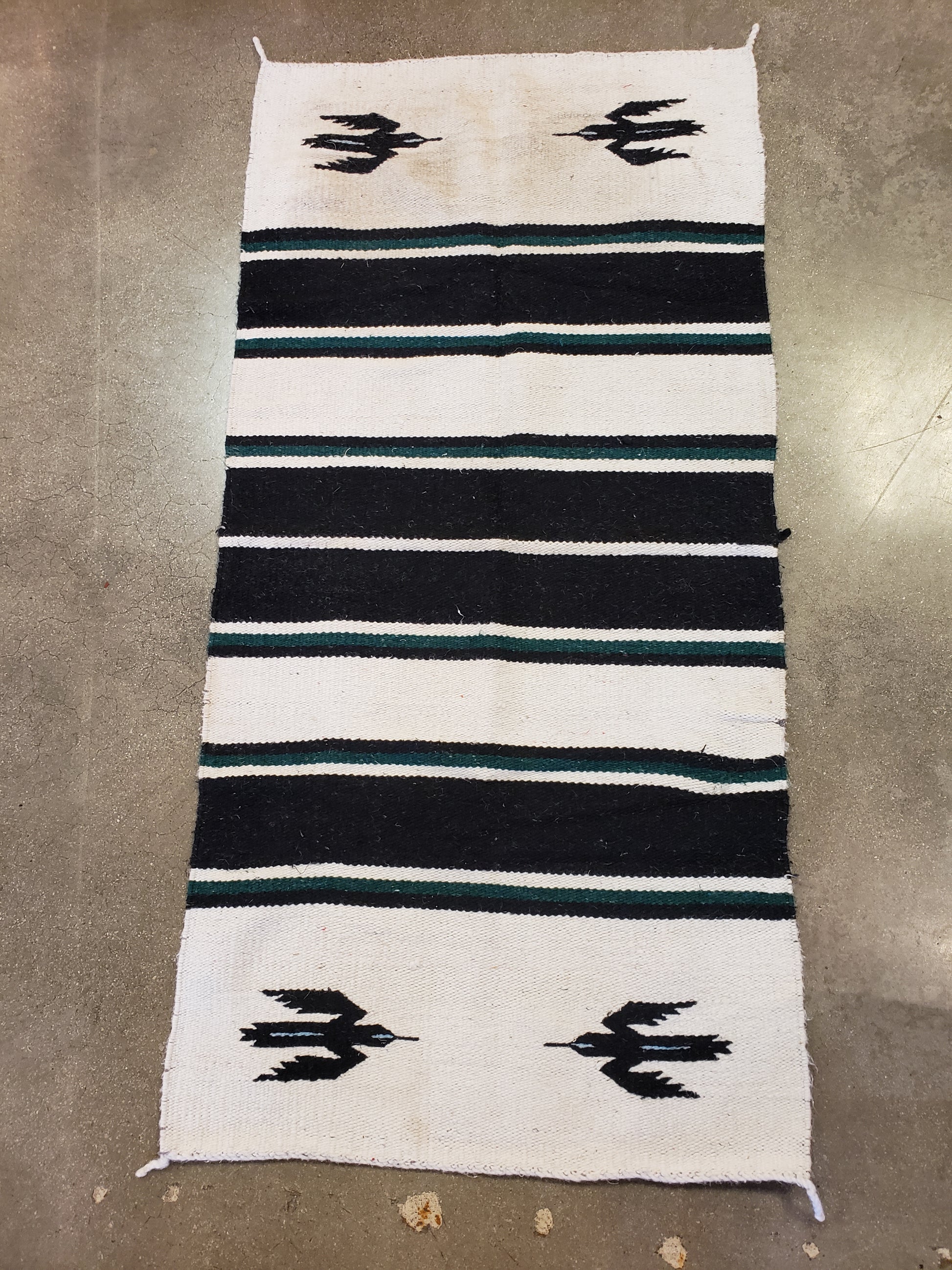 Mauricio's Vintage Horse Blanket features classic white, black, and green stripes highlighted by a distinctive bird design. Though previously owned and in need of cleaning, it offers a genuine piece of Western heritage, perfect for adding authentic rustic charm to your décor. Embrace a timeless artifact that tells a story and enhances your space with historical character. Measures 58 x 29 inches.