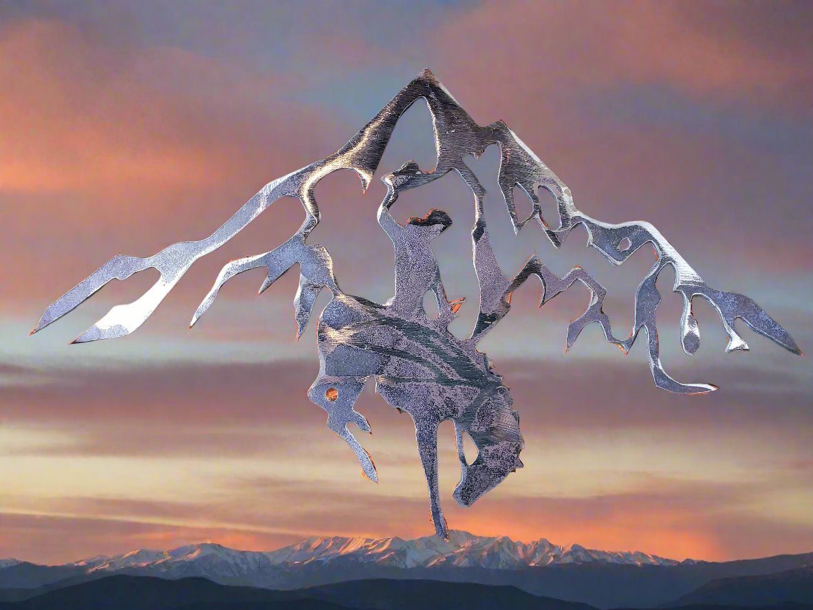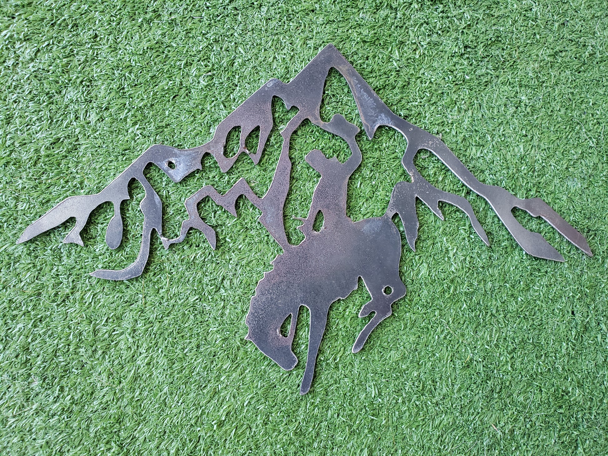Custom designed by Diverse Metals in Wyoming, this Bucking Horse and Rider silhouetted against a mountain is 12 inches wide and 7.5 inches tall. It has a beautiful, unique patina which should be displayed indoors to protect the finish.