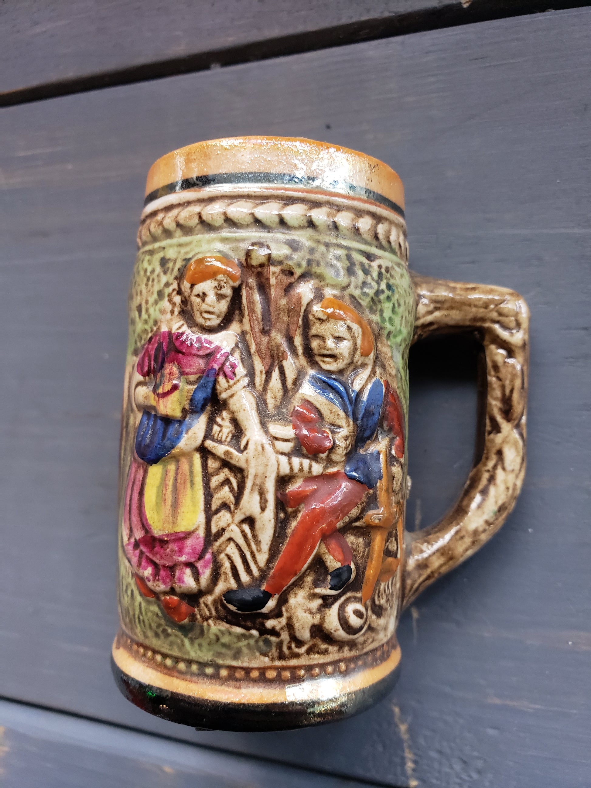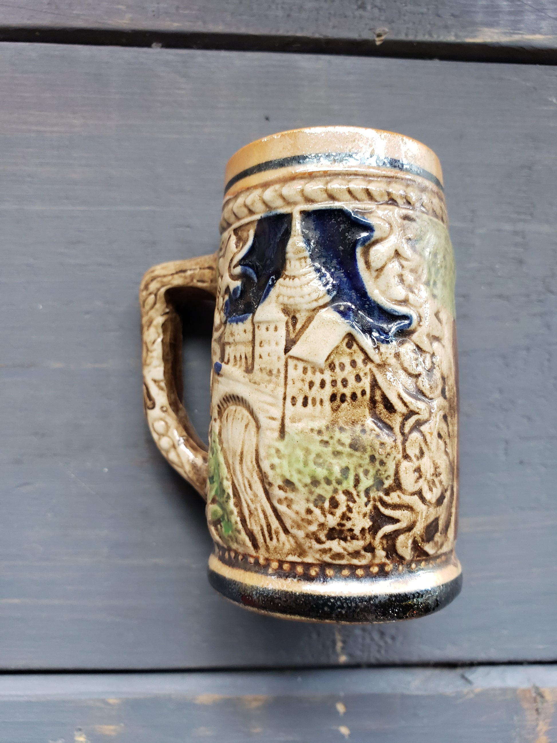 This charming Mid Century mini beer stein, standing just 3 inches tall, showcases a lustrous finish that beautifully highlights its detailed castle, bridge, and pub scene. Perfect for collectors or as a unique gift, it captures nostalgic charm in a compact size, adding a touch of elegance and history to any display. Fair vintage condition.