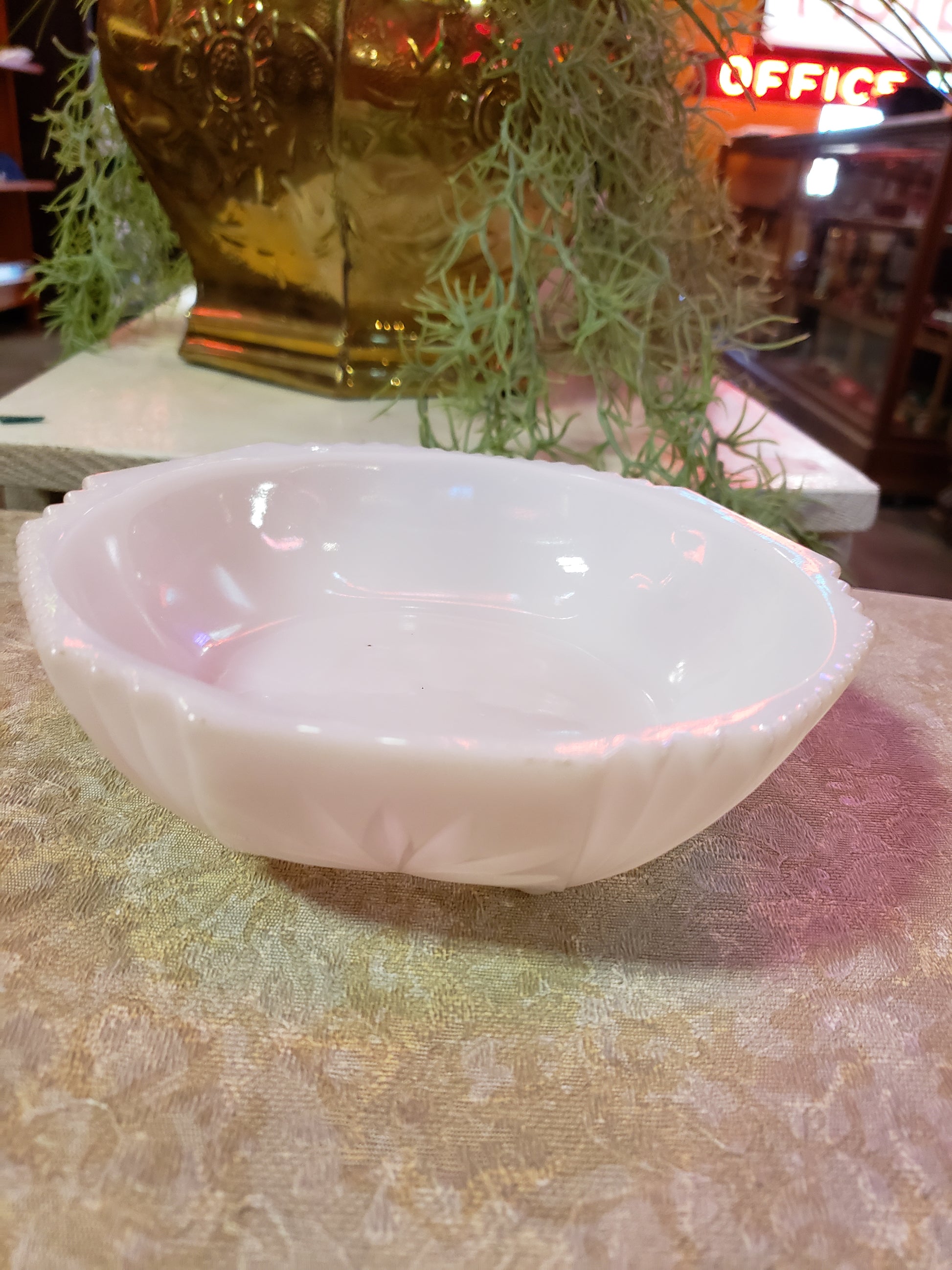 Indulge in luxury with our Milk Glass Candy Dish. Made of elegant milk glass, this dish is the perfect addition to your home decor. Its delicate design adds sophistication to any room, while the spacious size allows for easy storage of your favorite sweets. Elevate your candy experience today. There is a small chip on one side, otherwise it is in fair used condition.