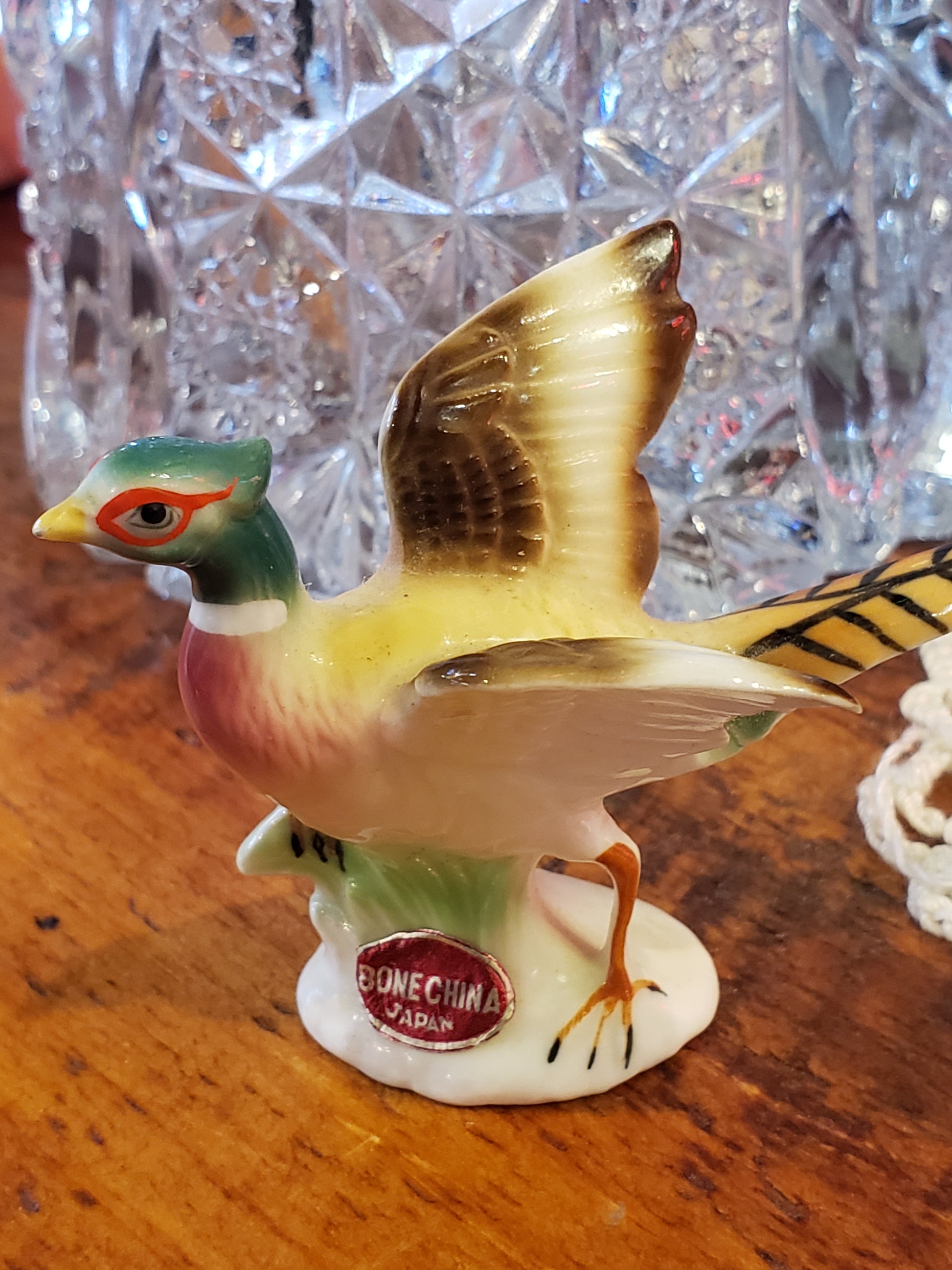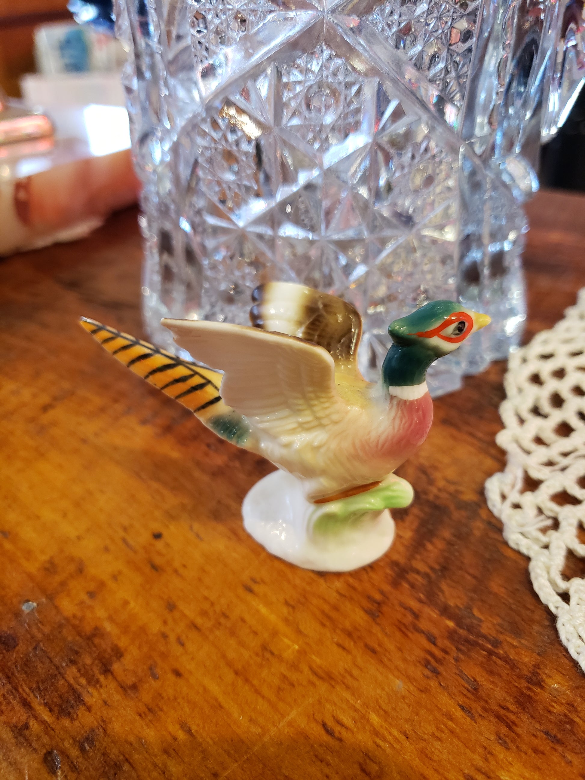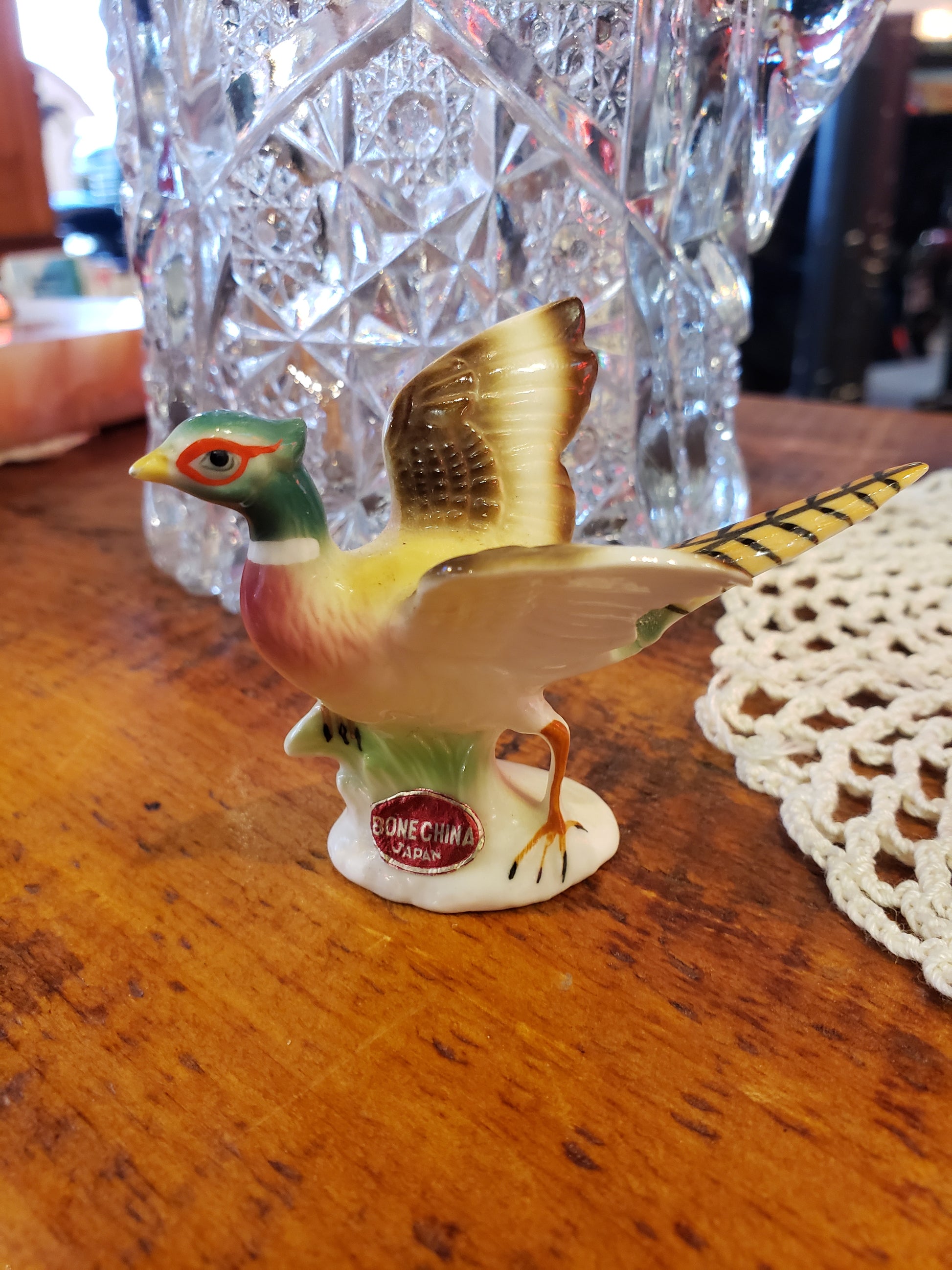 Crafted from fine bone china, this mini pheasant figurine boasts vintage charm. Its delicate design and quality material make it a must-have for collectors and natural decor enthusiasts alike. Highly detailed colorful pheasant catches your eye as it appears ready to take off with its' upstretched wings. It stands a tad over 2 inches tall and still has the Bone China sticker. Fair vintage condition.