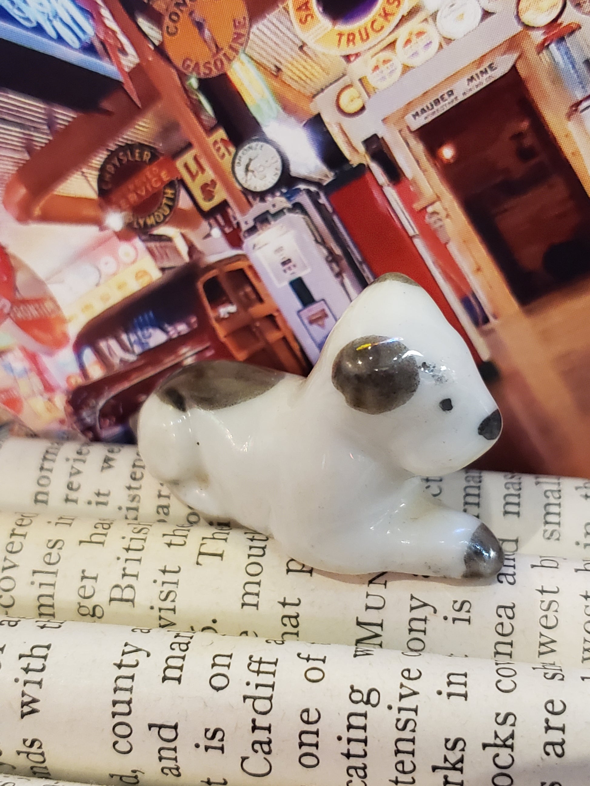 Experience timeless charm with our vintage miniature porcelain spotted dog. Perfect for dog lovers and collectors alike, this hand-painted piece will add a touch of nostalgia to any home. Crafted with intricate details, it's a must-have for any dog figurine collection. Own a piece of history today! 1 5/8 inches long, white with gray spots. Fair vintage condition.