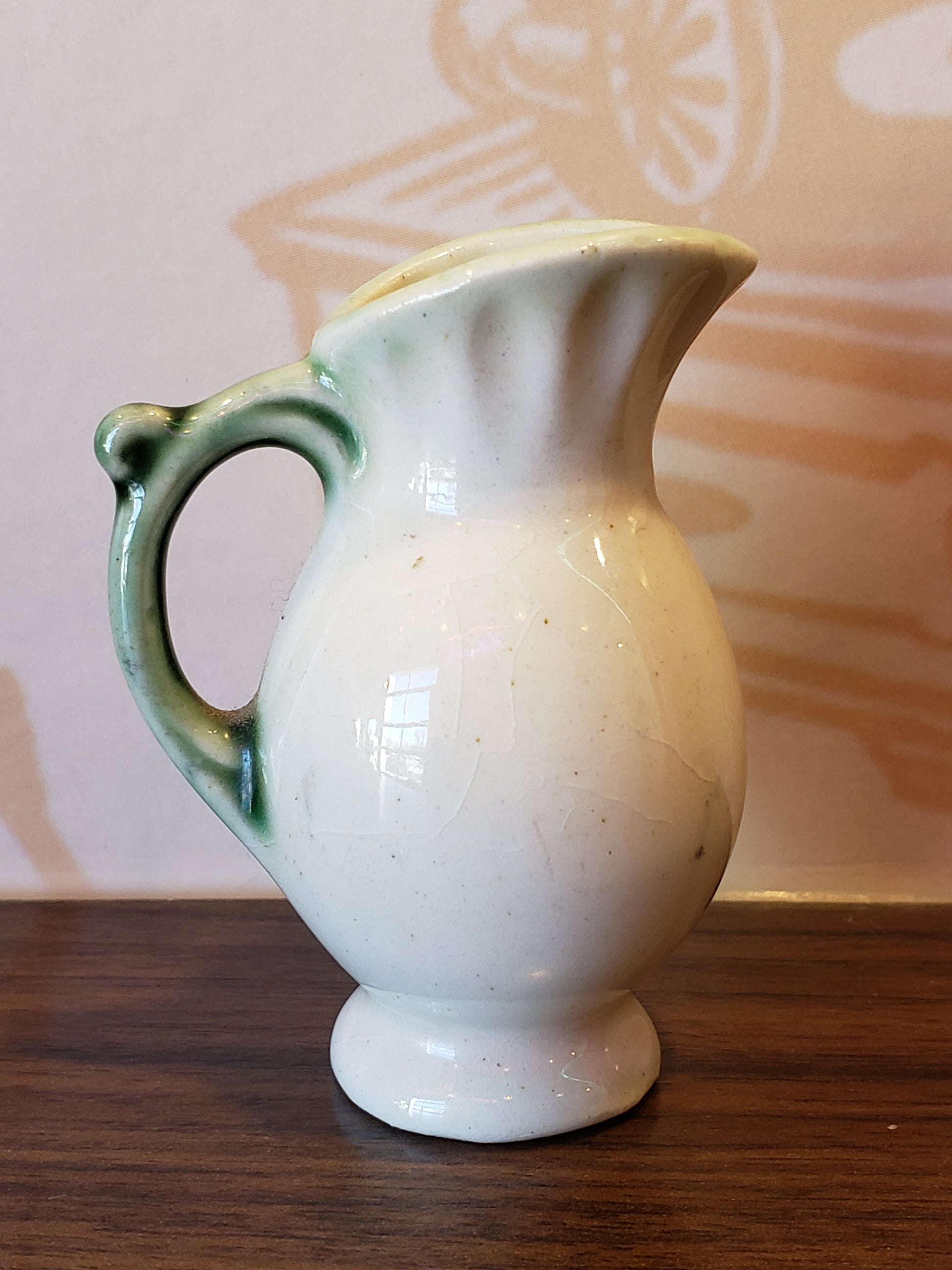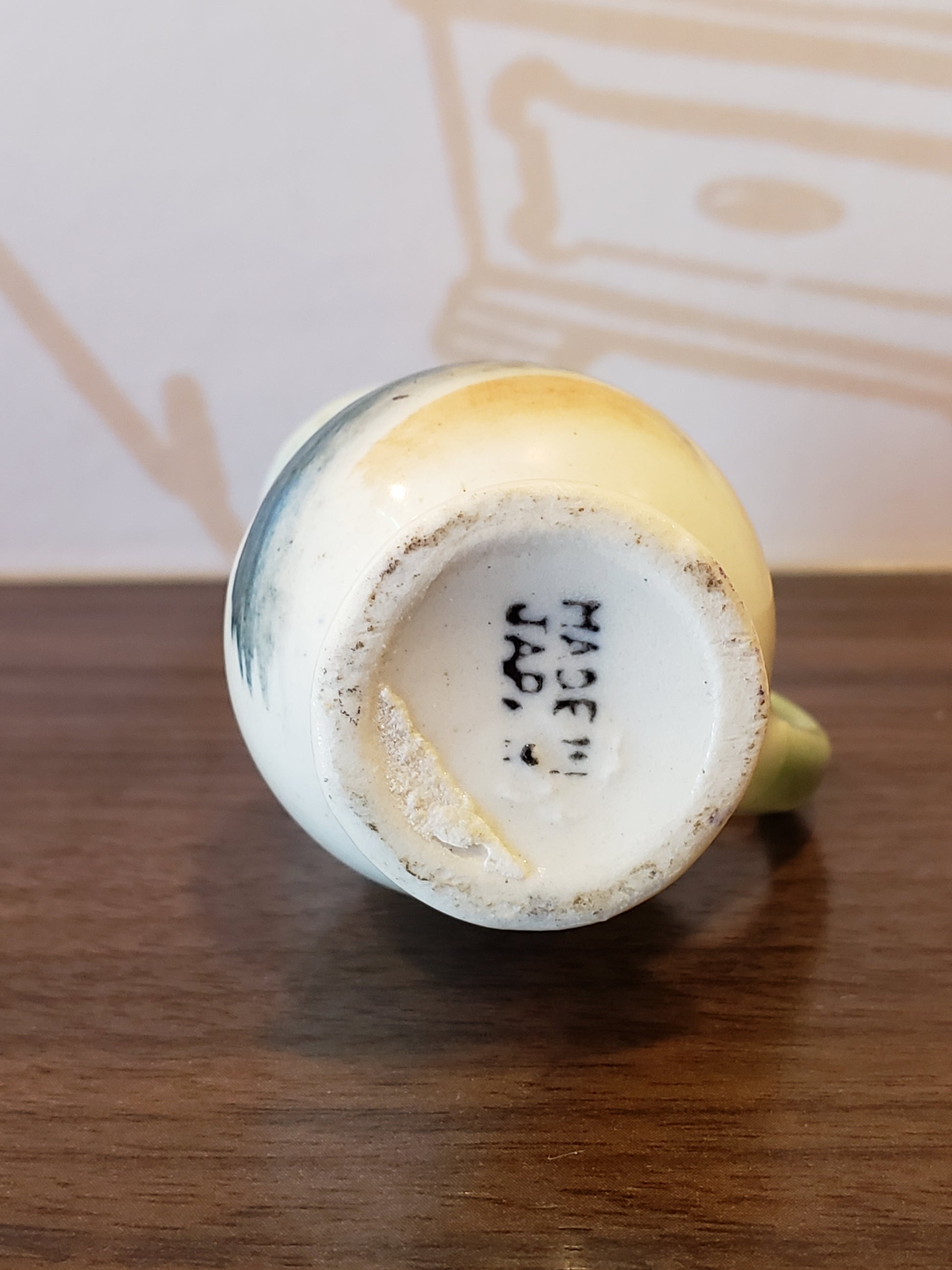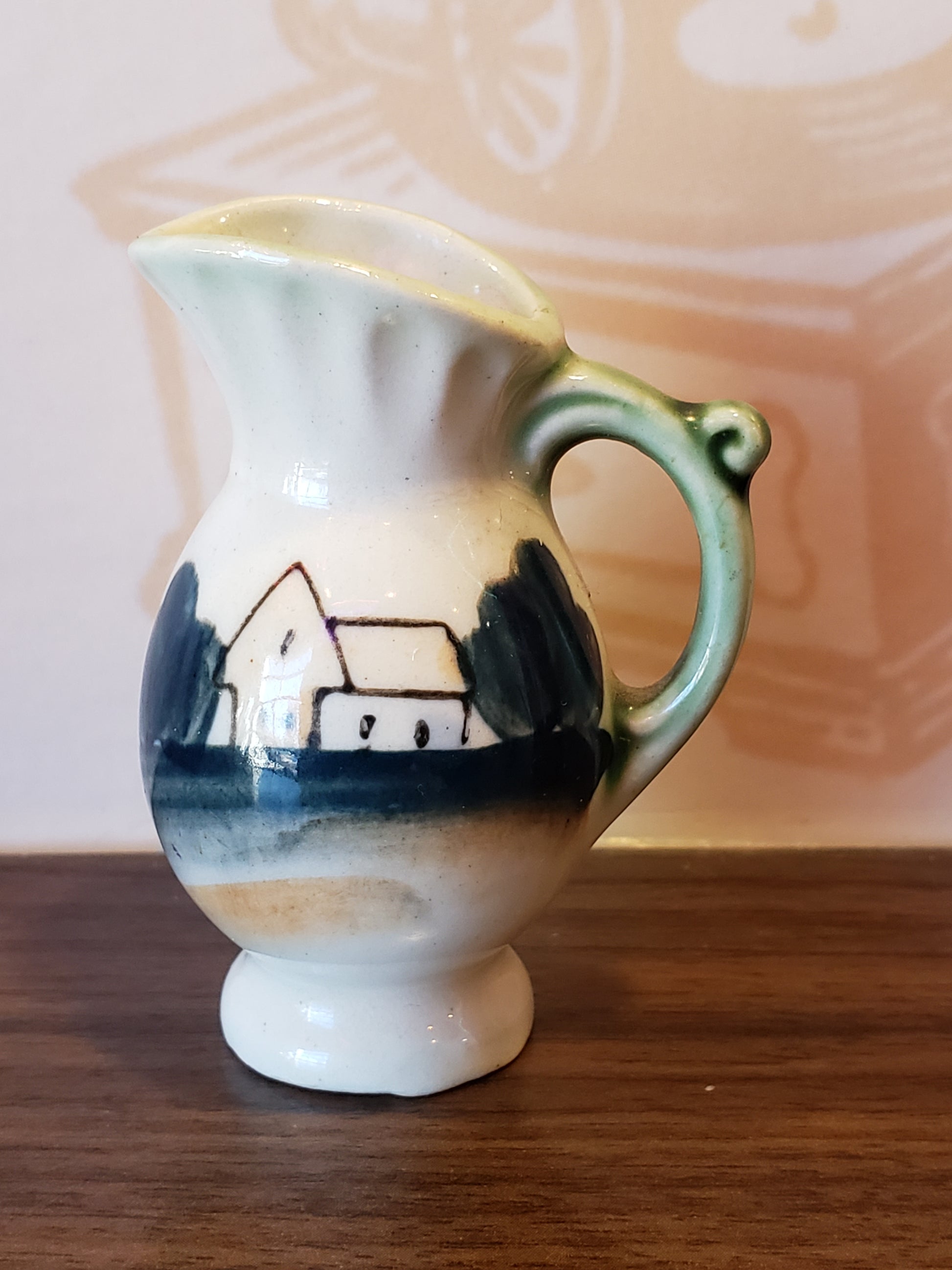 Serve up some charm with this mini pottery pitcher featuring a delightful home scene painted on its surface. Perfect for adding a touch of whimsy to any home decor or as a unique gift for a friend with a playful personality. 2.5 inches tall with a pretty glazed finish. Fair vintage condition.