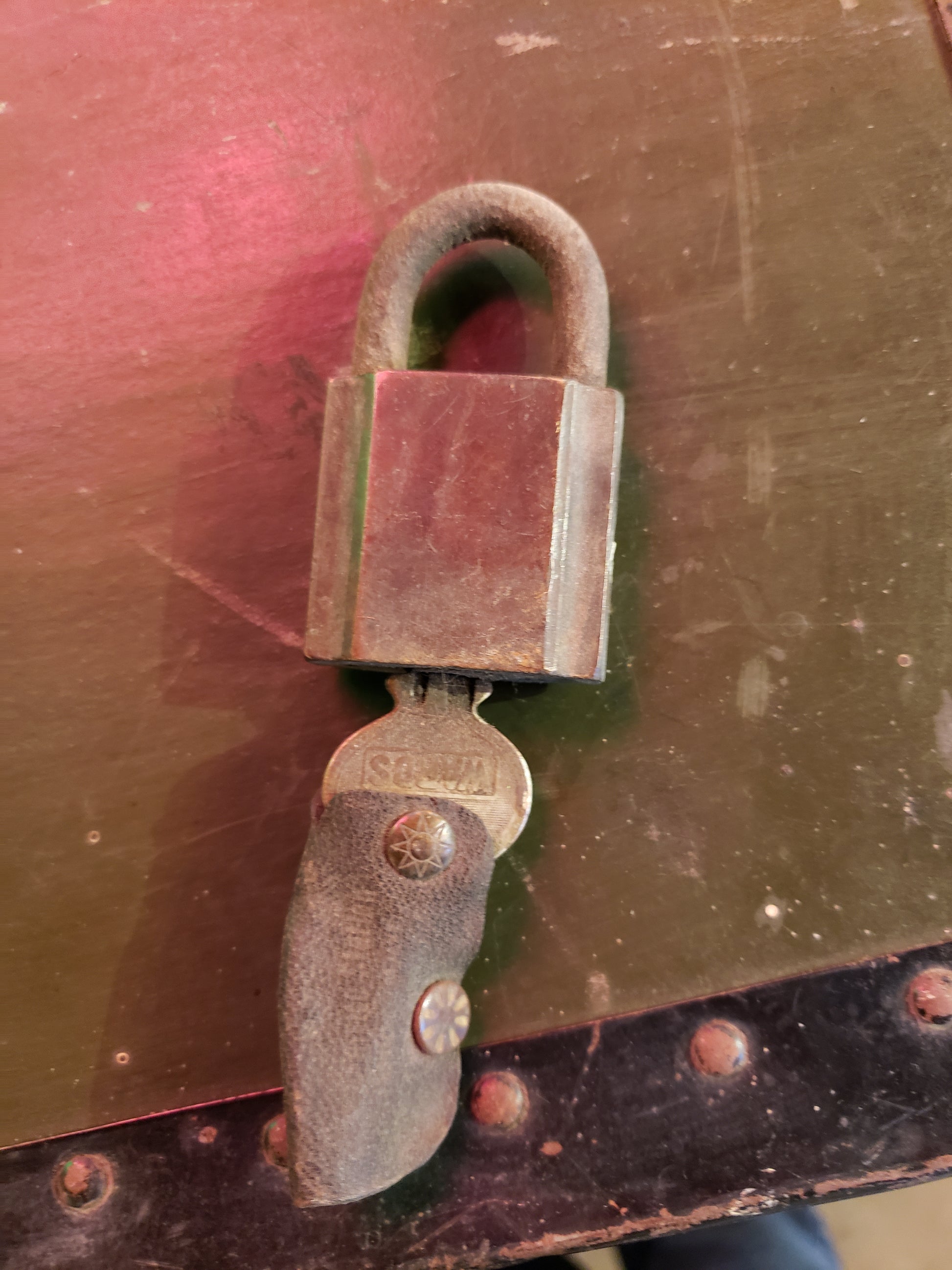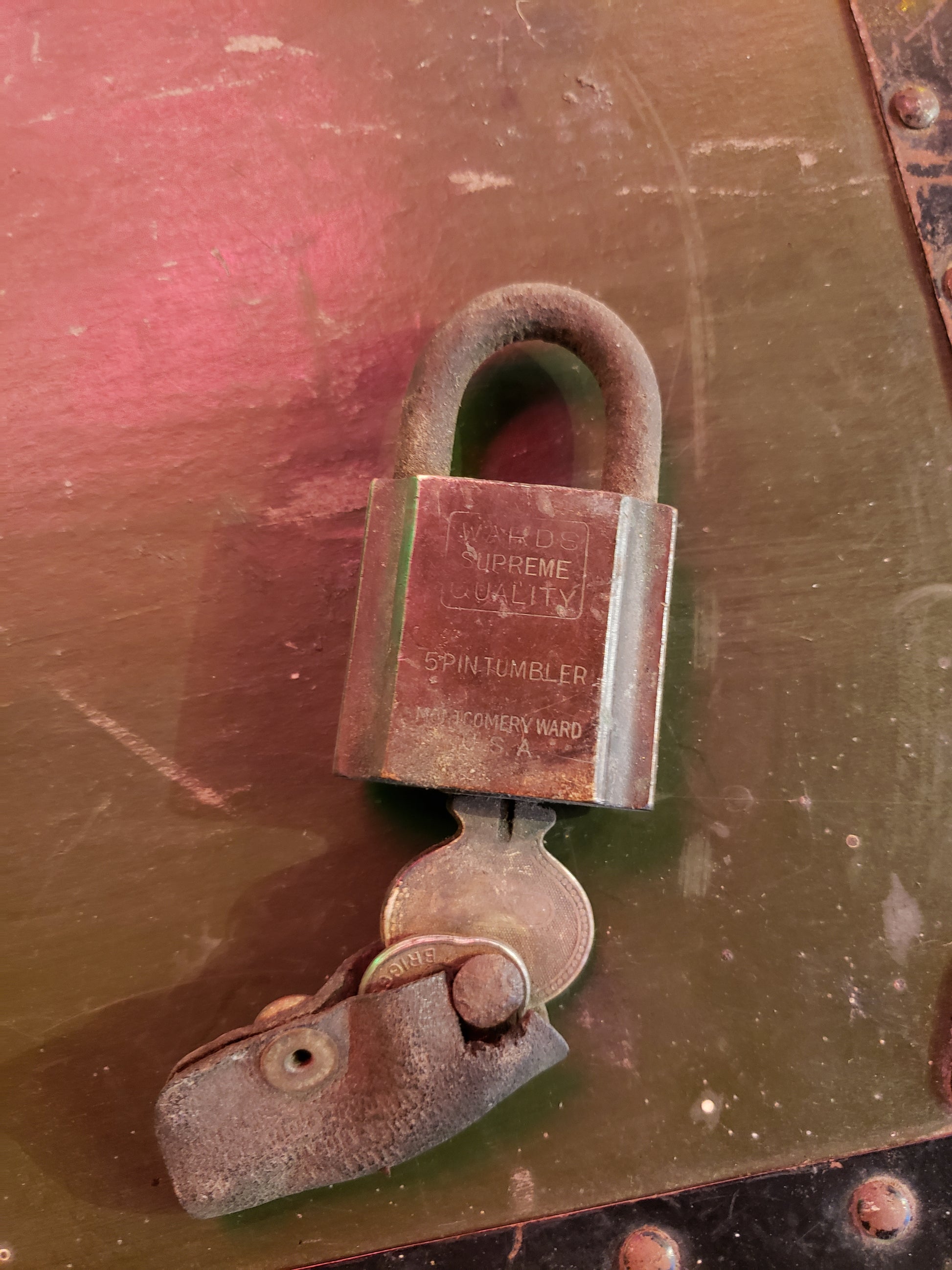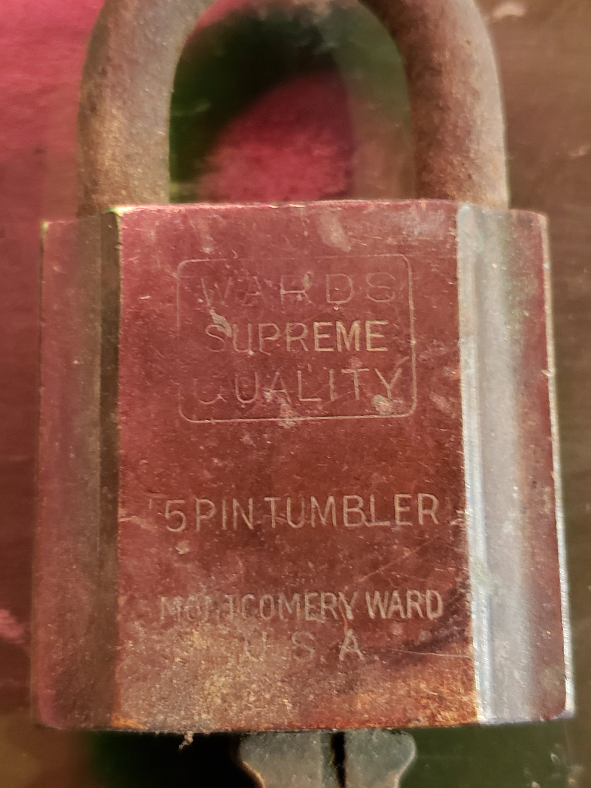 Collectible Montgomery Wards Vintage lock with two keys and a leather fob. Embossed "Wards Supreme Quality" Spin Tumbler Montgomery Ward USA. Rusty, lock does open though.