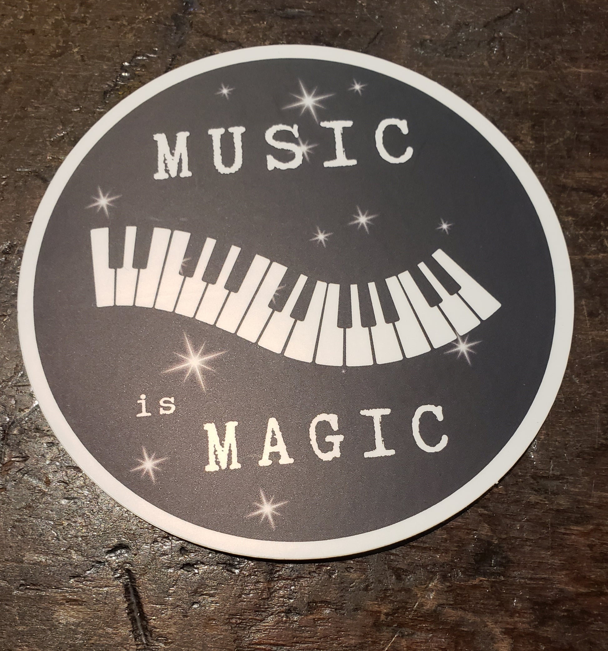 Music is Magic decal is 4 inches in diameter. Made in Wyoming by Denica Shell Arts. Features a piano keyboard with starburst accents. Great gift for the musician in your life.