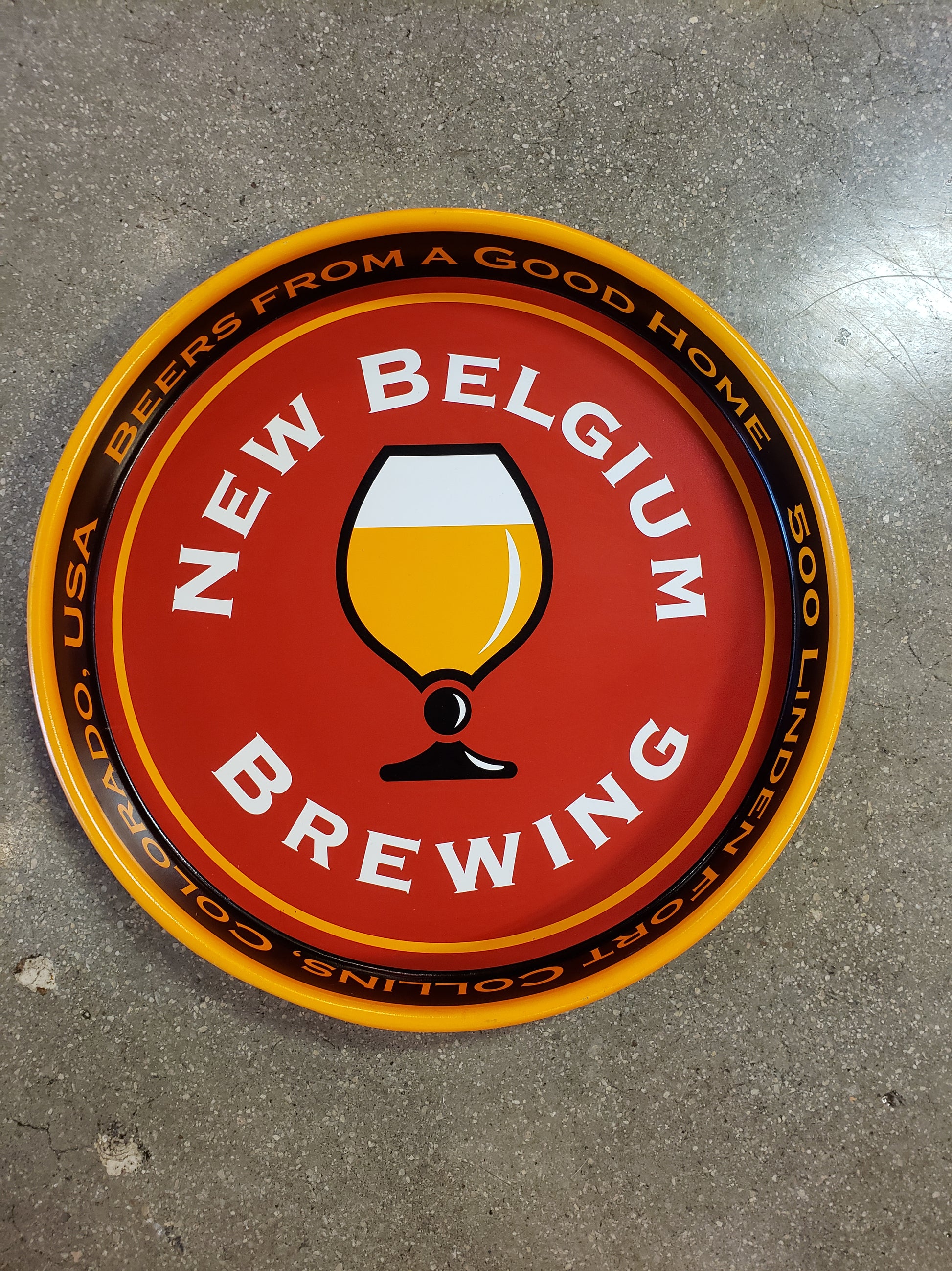 Round Metal Beer Tray advertising New Belgium Brewing, 13 inches in diameter. 1 5/8 inches deep. The base and lower rim has some scratches from being used, this tray is in fair condition.