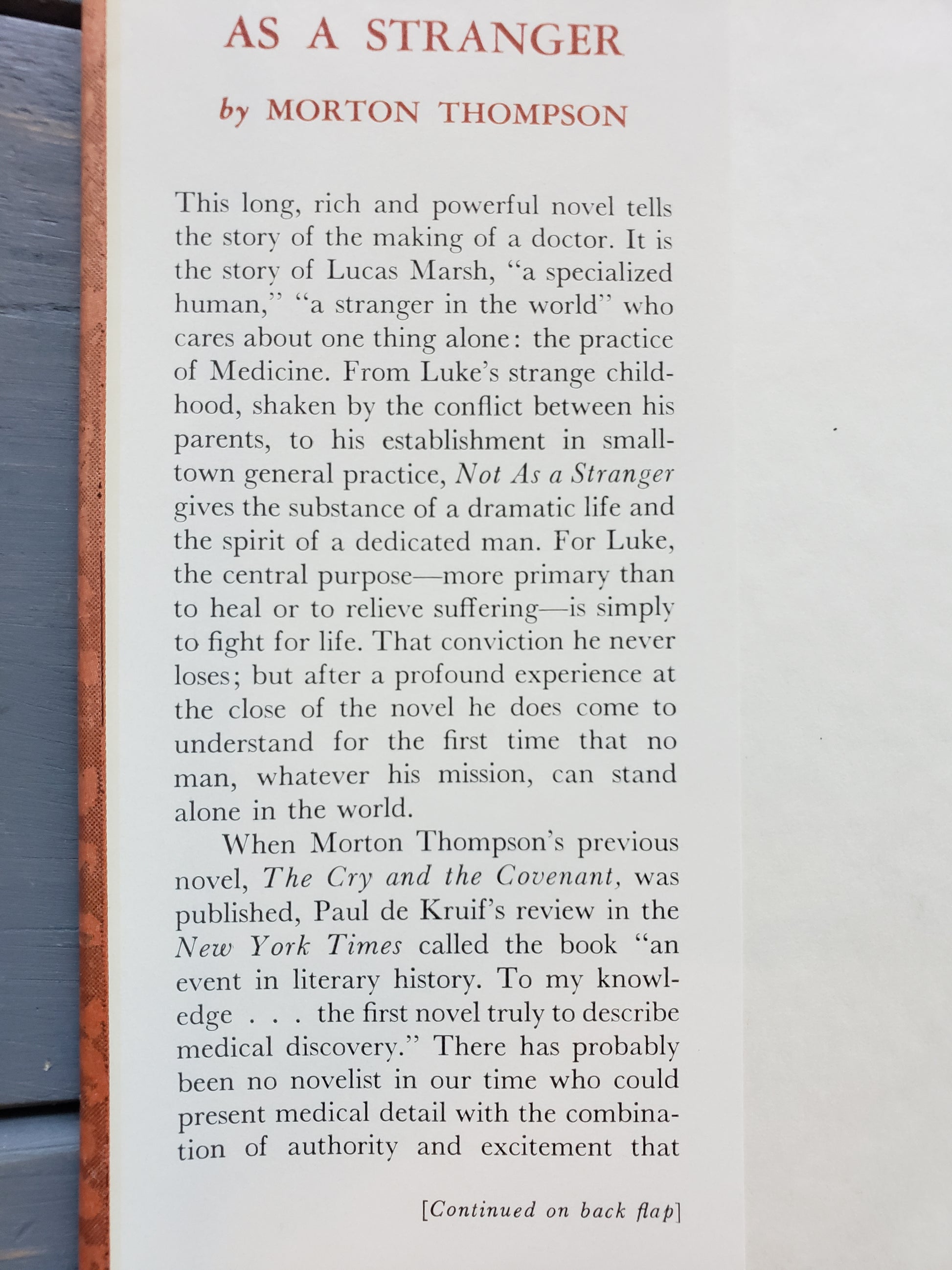 Not as a Stranger by Morton Thompson (1954) offers a compelling and heartfelt exploration of the medical world through vivid storytelling. This edition transports readers to the challenges and triumphs faced by doctors and patients alike, fostering empathy and understanding. Perfect for anyone interested in human resilience and the complexities of healthcare, it provides insight that is both informative and emotionally enriching. fair vintage condition.