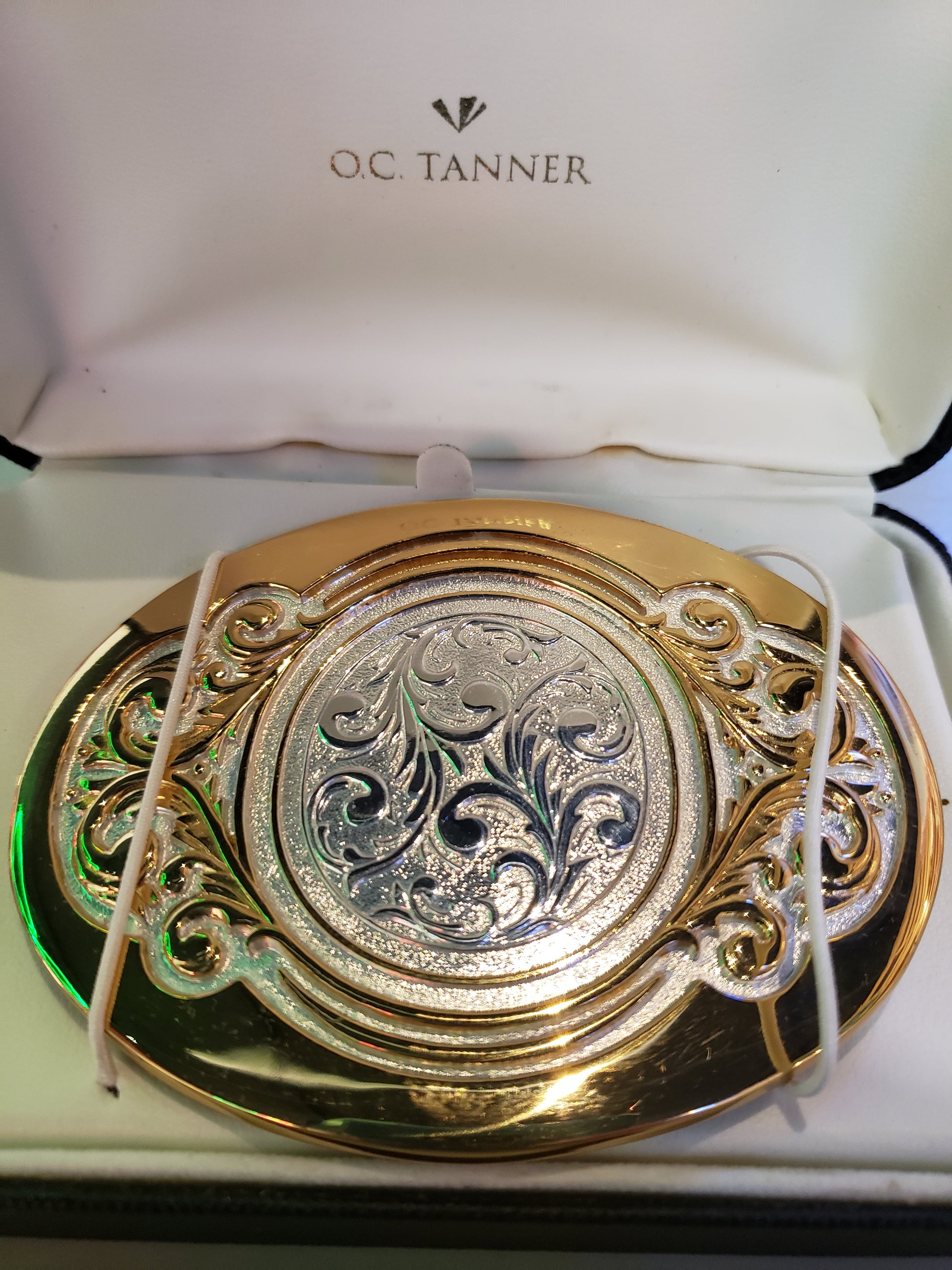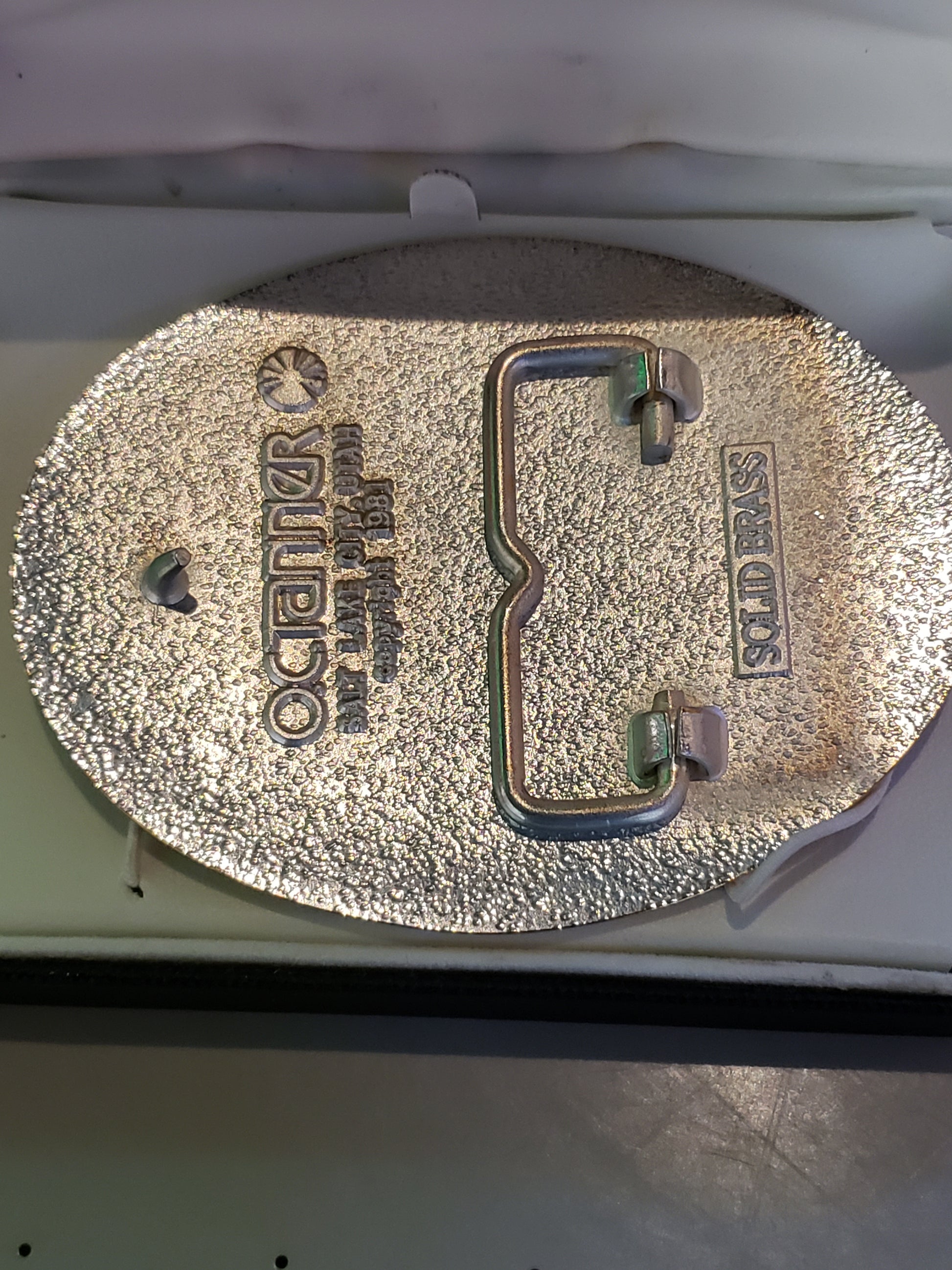 Crafted from solid brass in 1981, this OC Tanner belt buckle combines timeless durability with classic style. Its sturdy construction ensures long-lasting wear, while the vintage design adds a distinctive touch to any outfit. Perfect for collectors or those seeking a unique accessory that stands out with heritage and quality. Fair pre owned condition.
