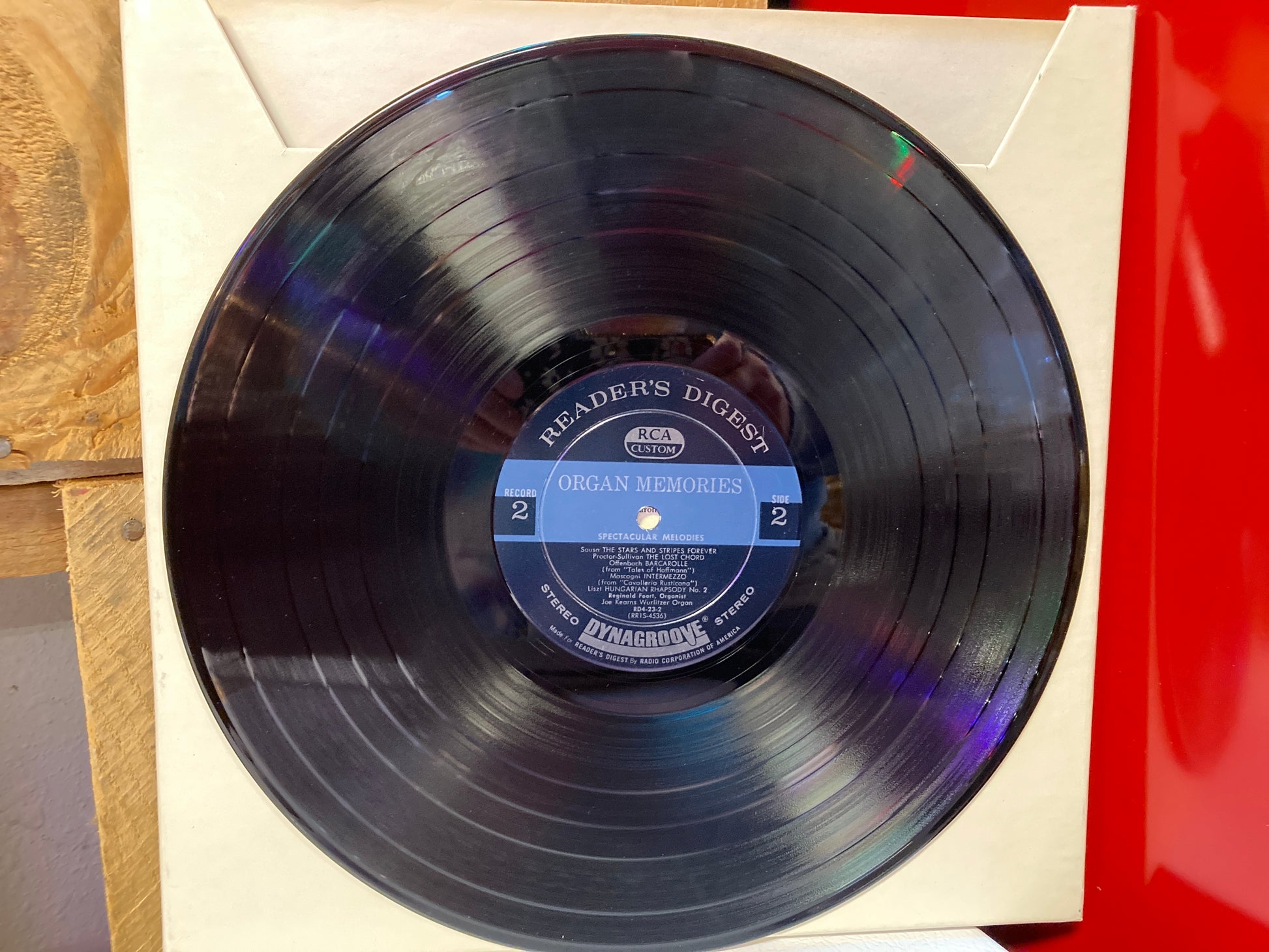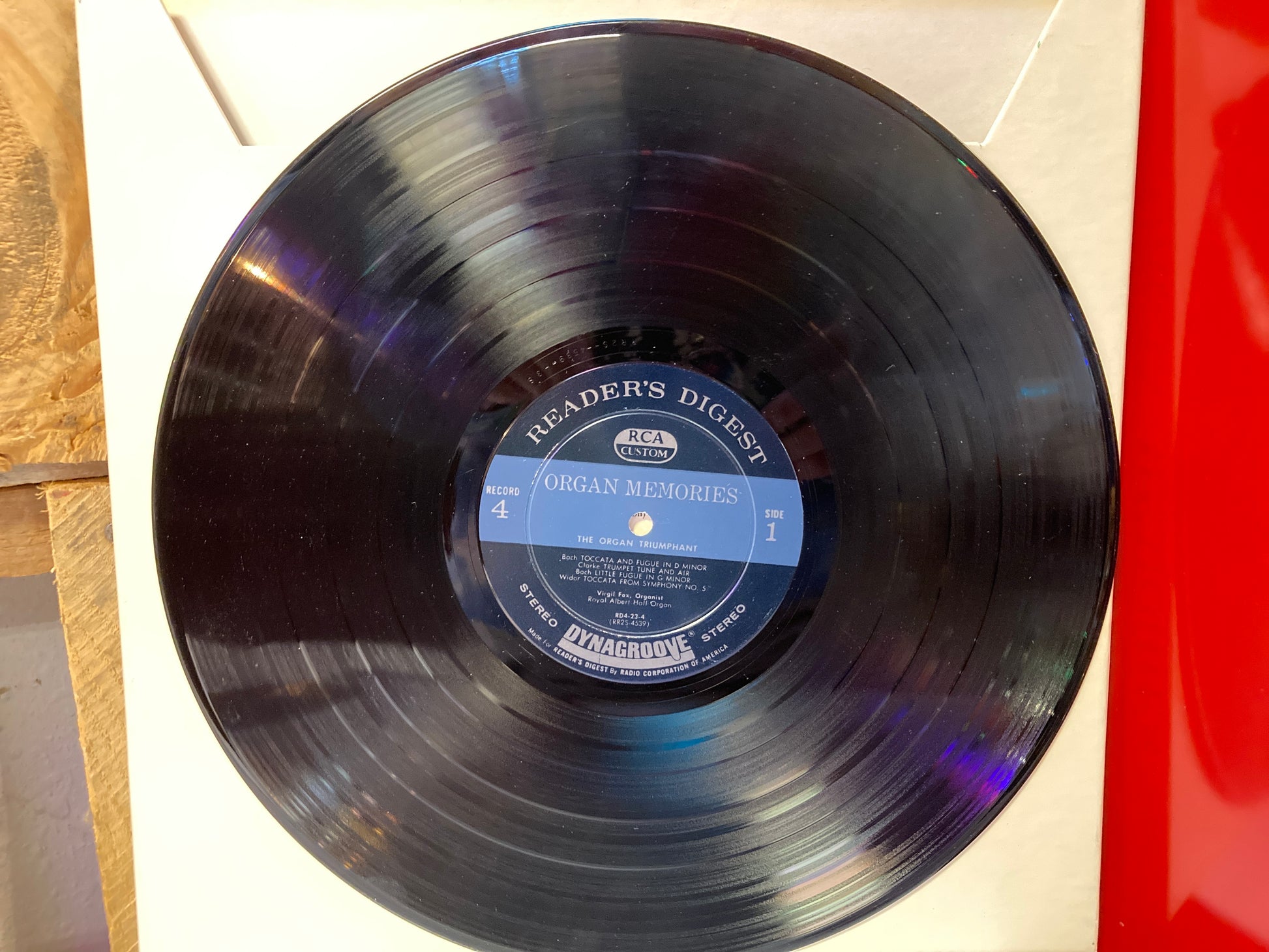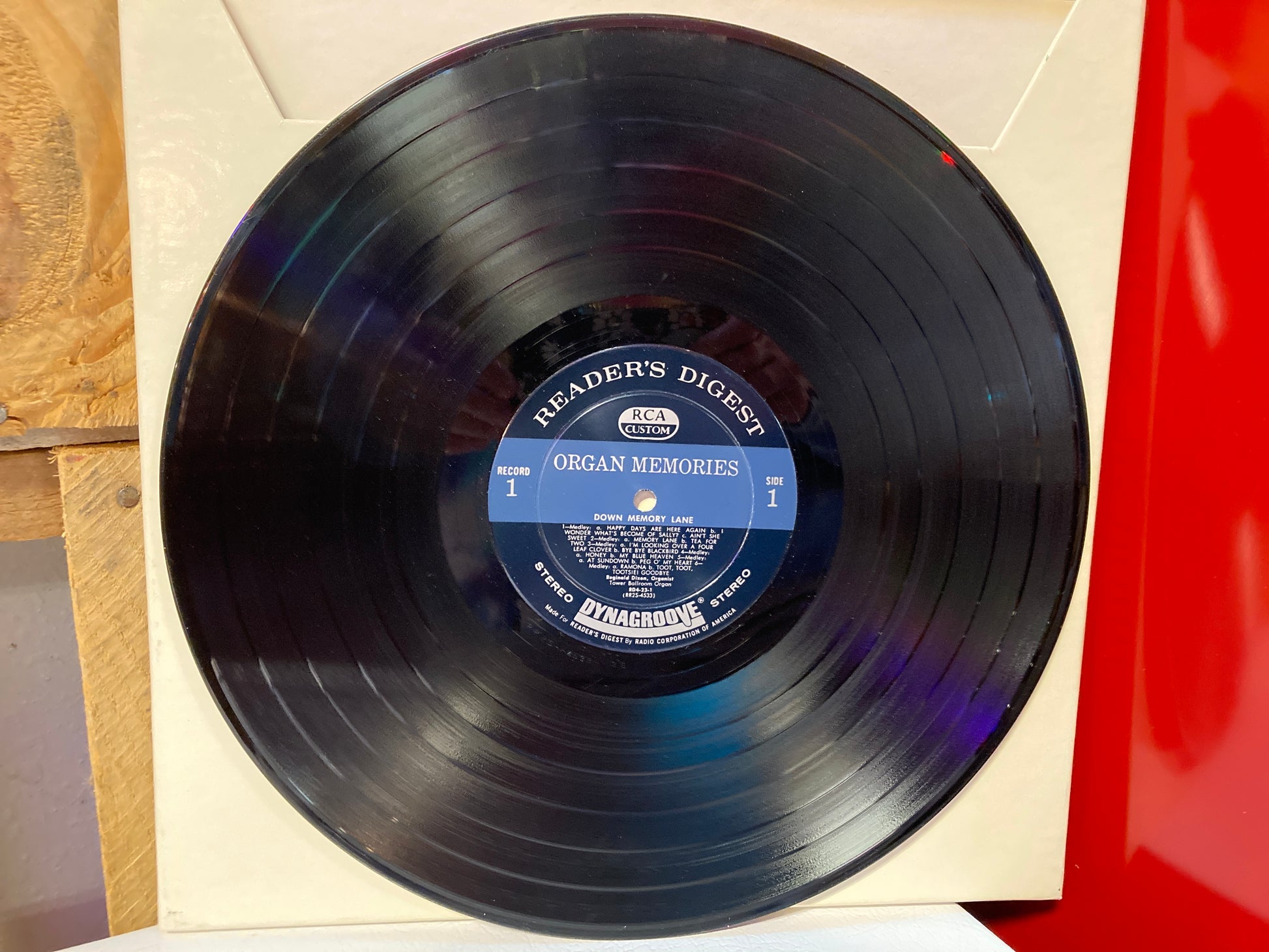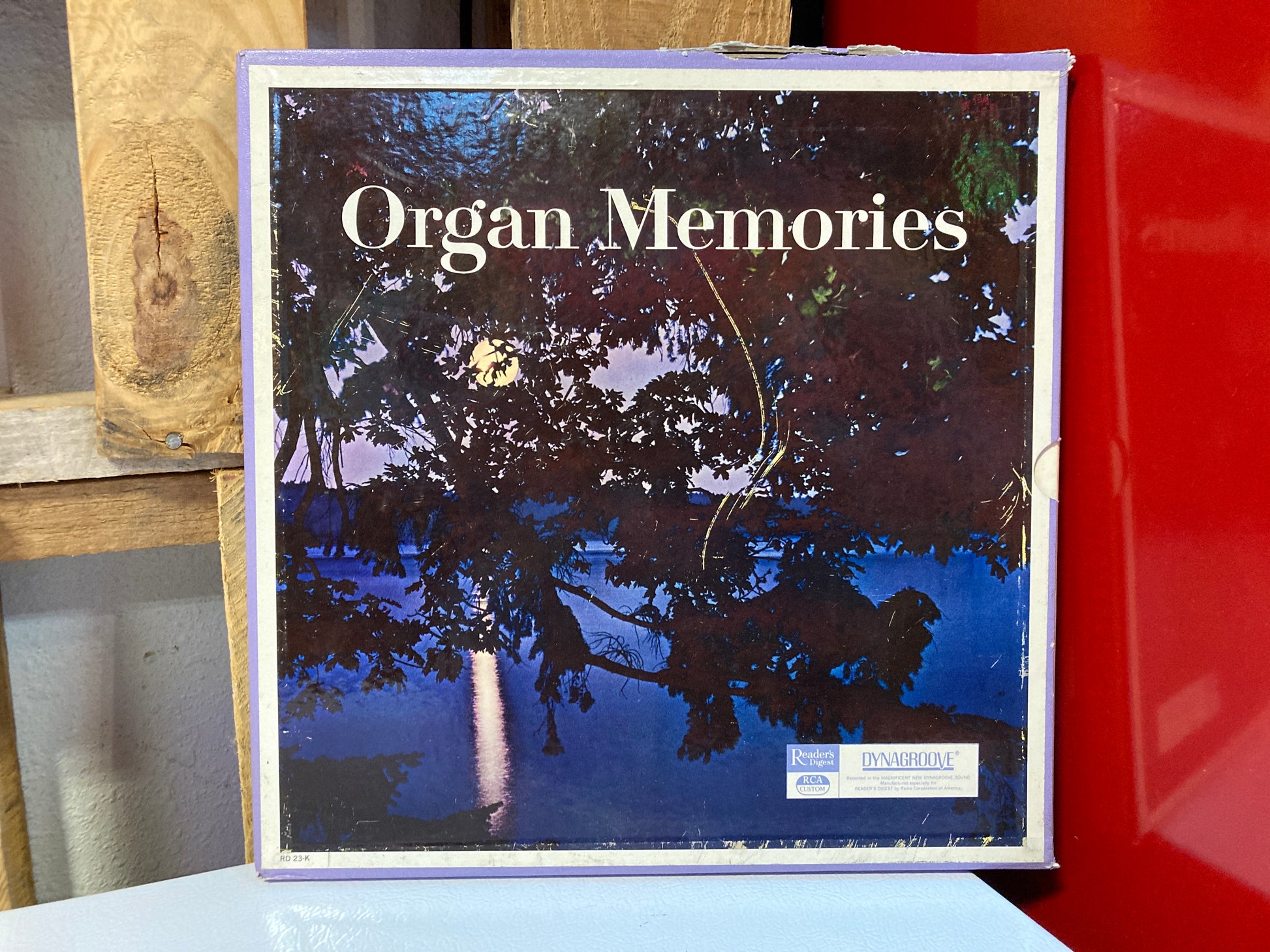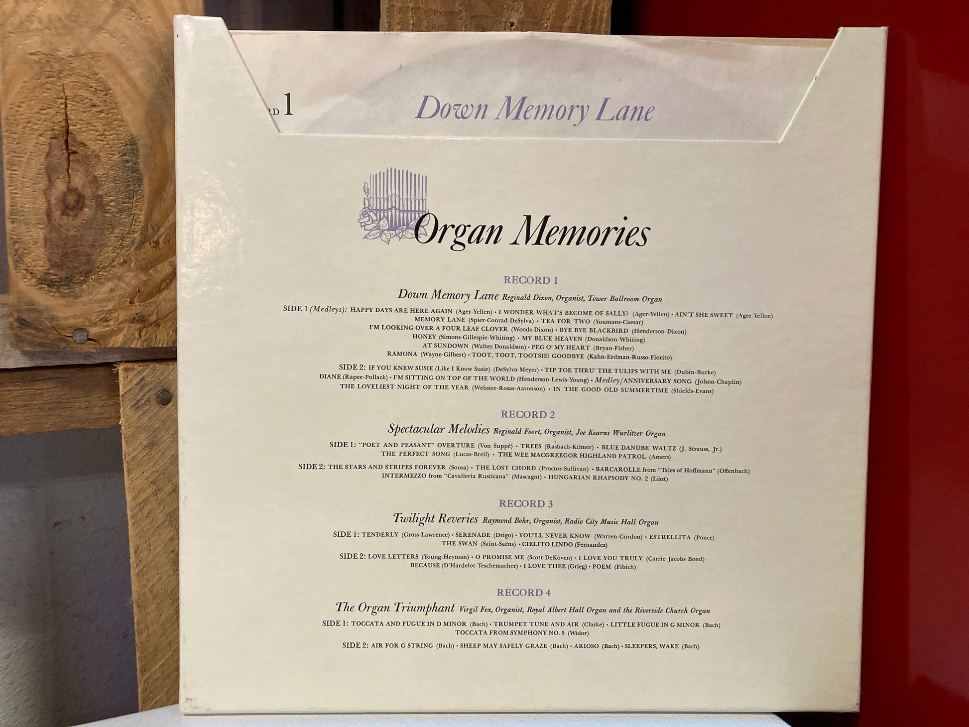 Organ Memories 4 record box set. 1. Down memory lane 2. Spectacular Melodies 3. Twilight Reveries 4. The Organ Triumphant. In fair used condition, Box is worn, vinyl is in great shape. Collectors item.