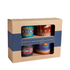 Set of four 12-oz. sturdy ceramic mugs featuring patterns drawn from our American College Fund blanket designs. Gift boxed.