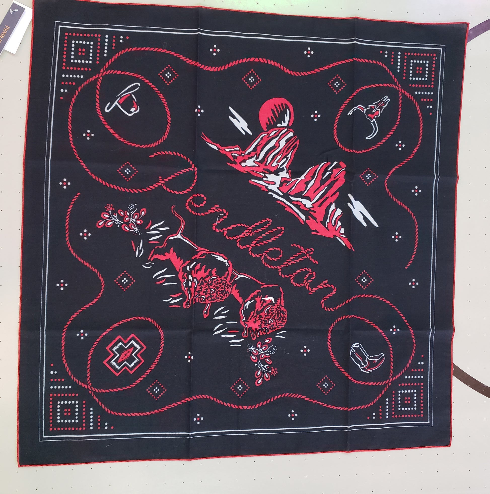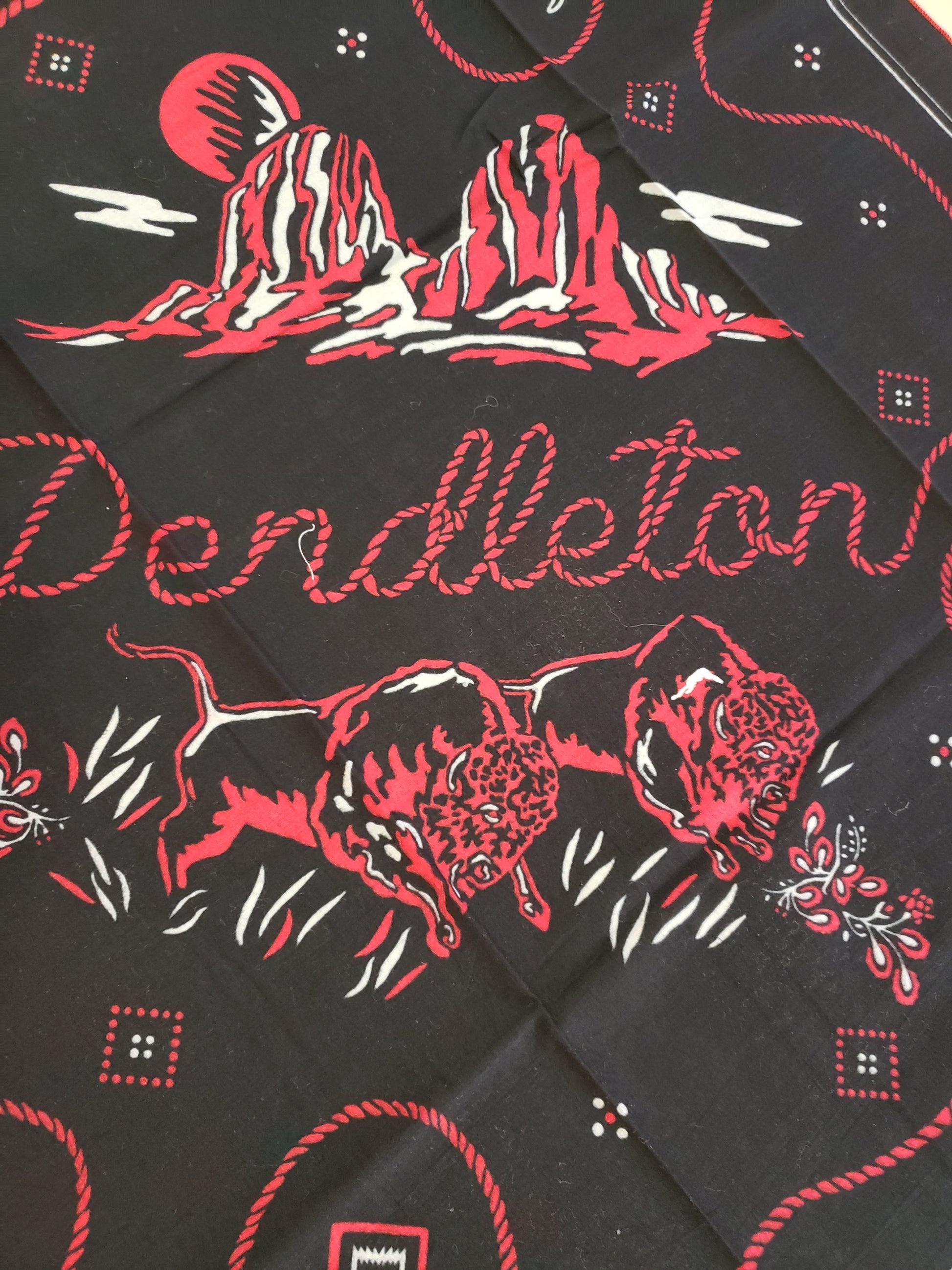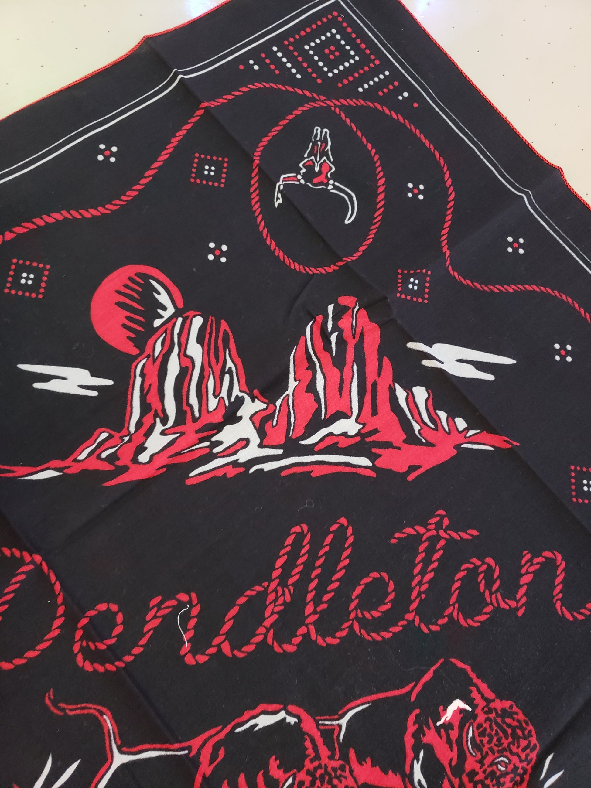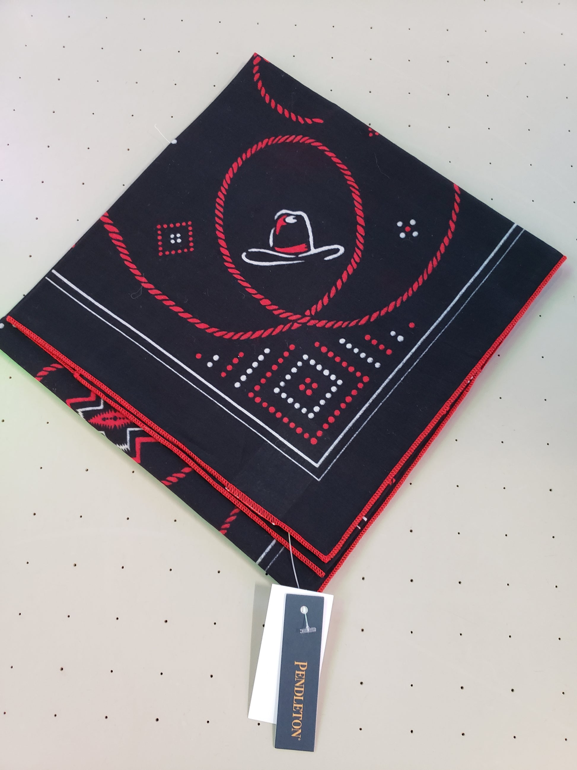 Western Style in black, red and white! Black bandana had buffalo, buttes and cowboy hats with PENDLETON written across the middle. It measures 25 x 25 inches and is edged in red. A colorful addition to your wardrobe with a definite nod to the Western Lifestyle. Made from 100% recycled cotton.