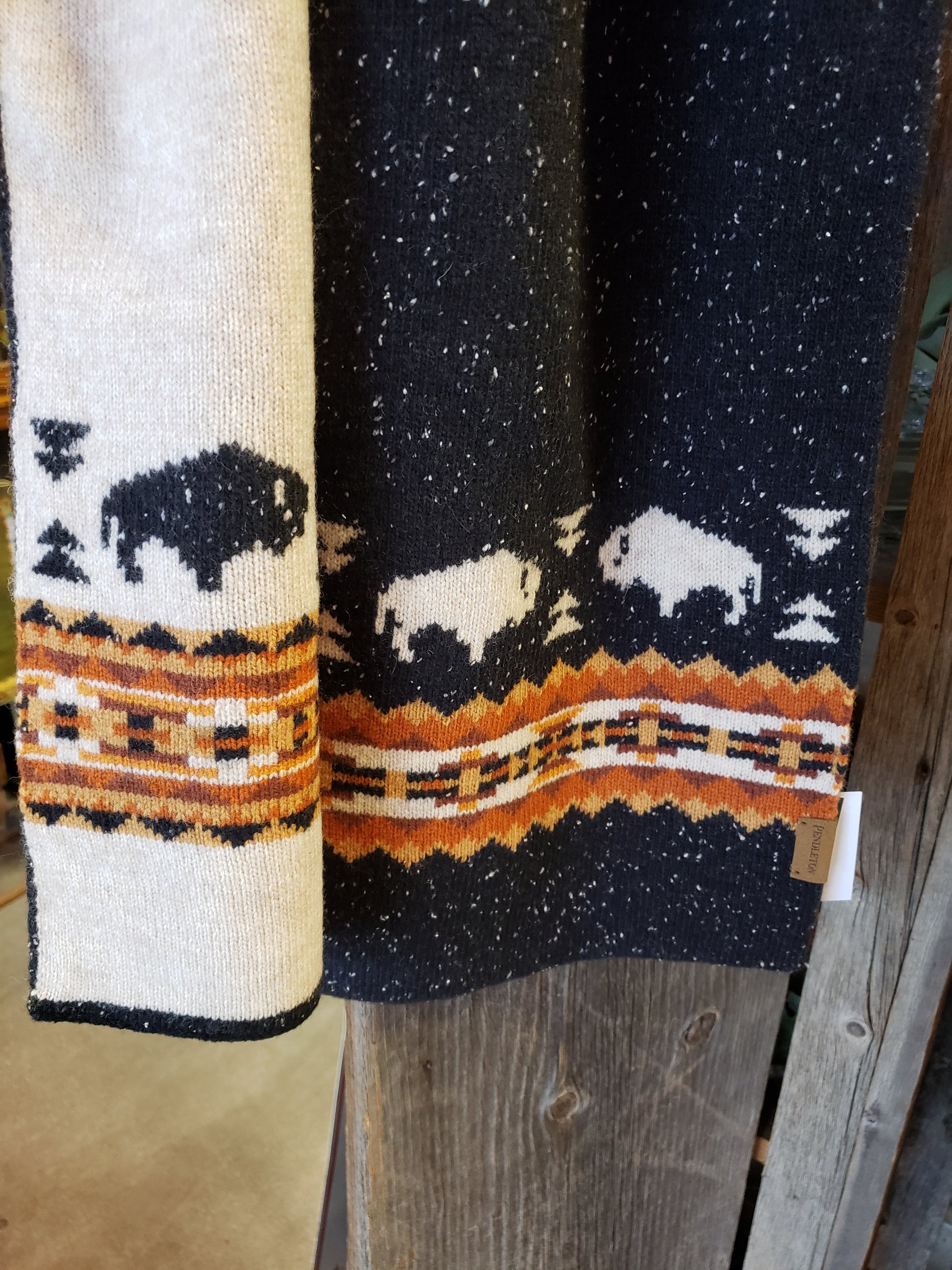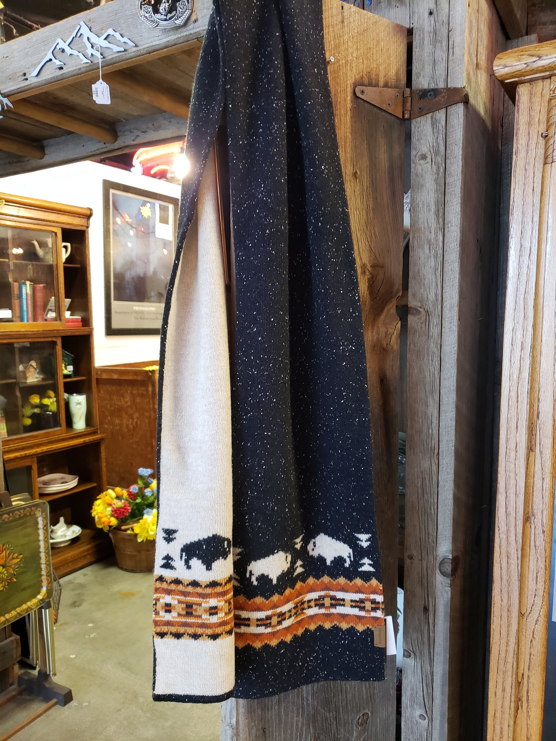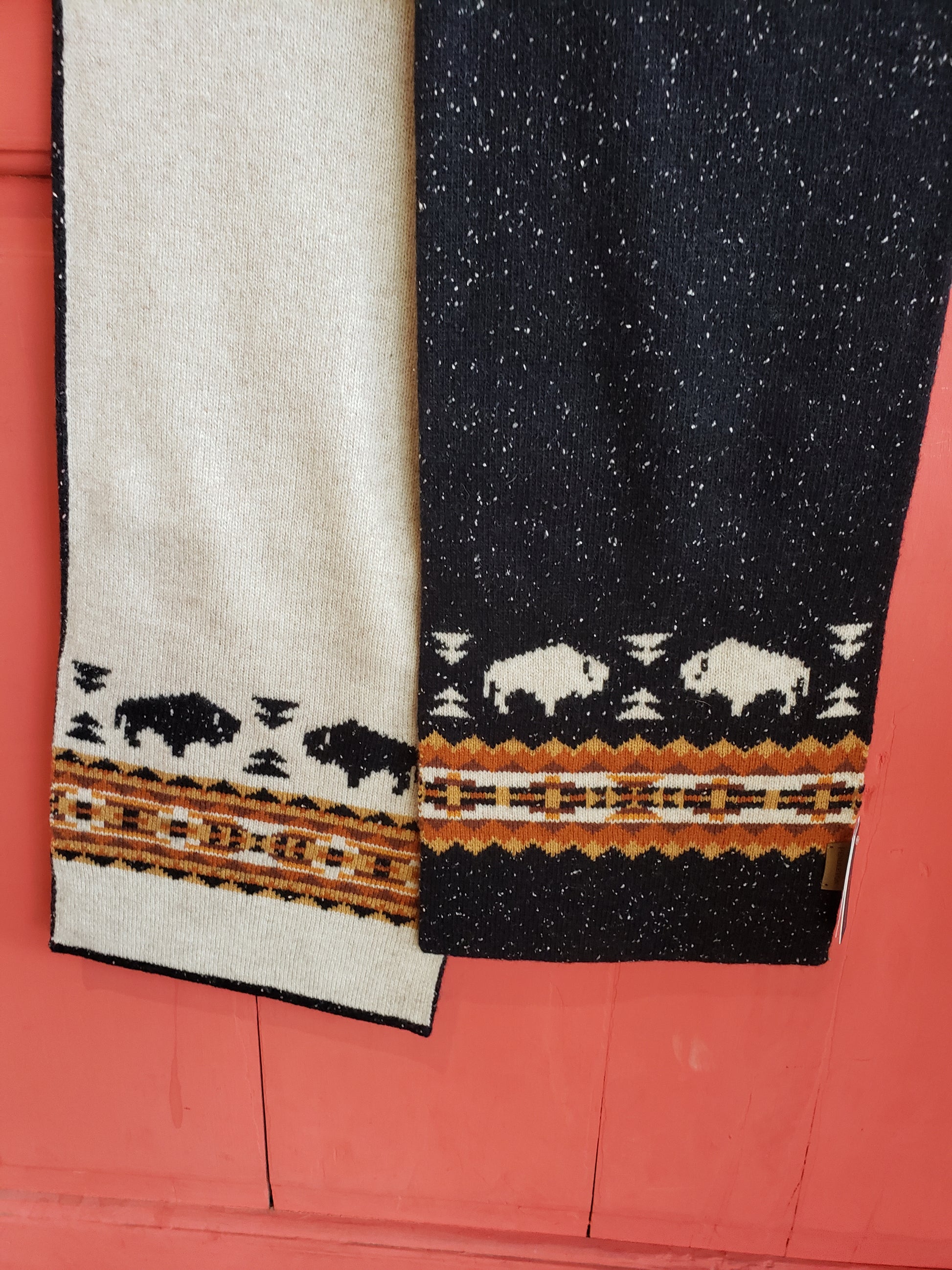 Cozy winter scarf in a distinctive Pendleton pattern, knit from warm, durable lambs wool with a touch of nylon for added resiliency. Reversible! Black with cream flecks and buffalo on one side, Cream with Black Buffalo on the reverse side.