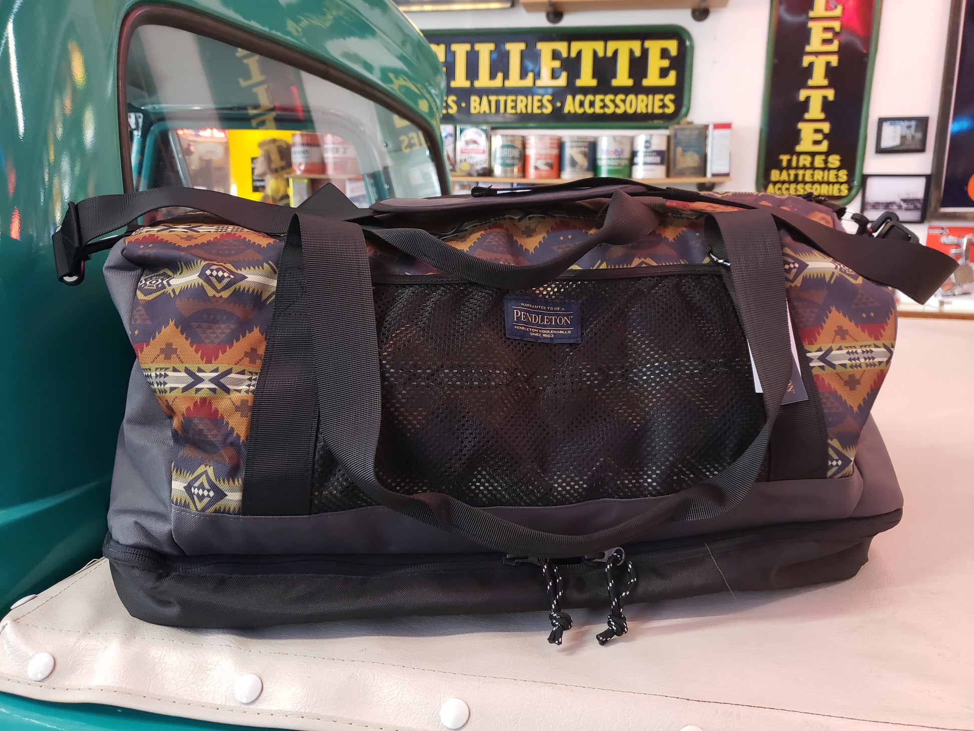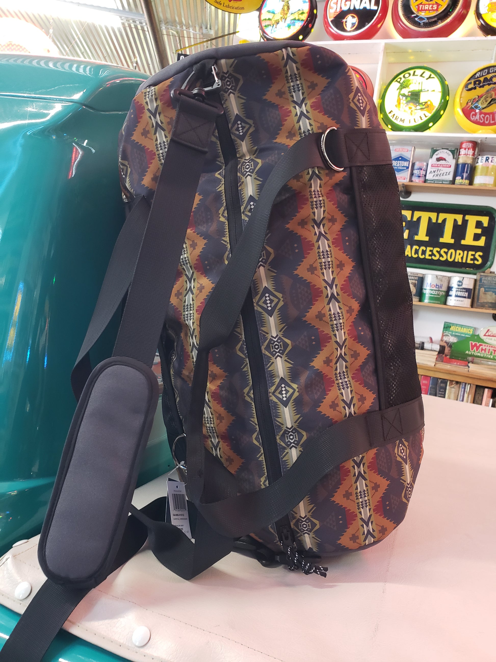 Pendleton Carryall Weekender in the Nehalem Grey pattern. A new carryall weekender tote in durable nylon with an exclusive Pendleton pattern. Adjustable/removable strap, two grab handles , and two mesh outer pockets. The bottom zips open to reveal a storage compartment handy for shoes, jackets and so forth. 21 inches long, 10 inches in diameter.