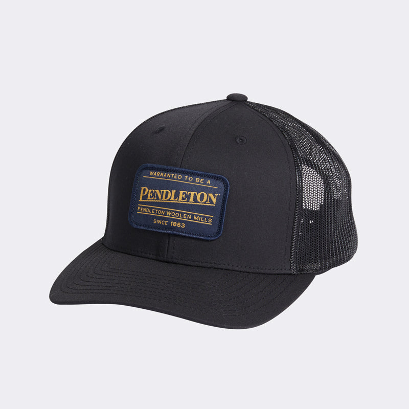 Six-panel cap with classic Pendleton patch on front, mesh back panels, medium curved brim and an adjustable snap-back closure.