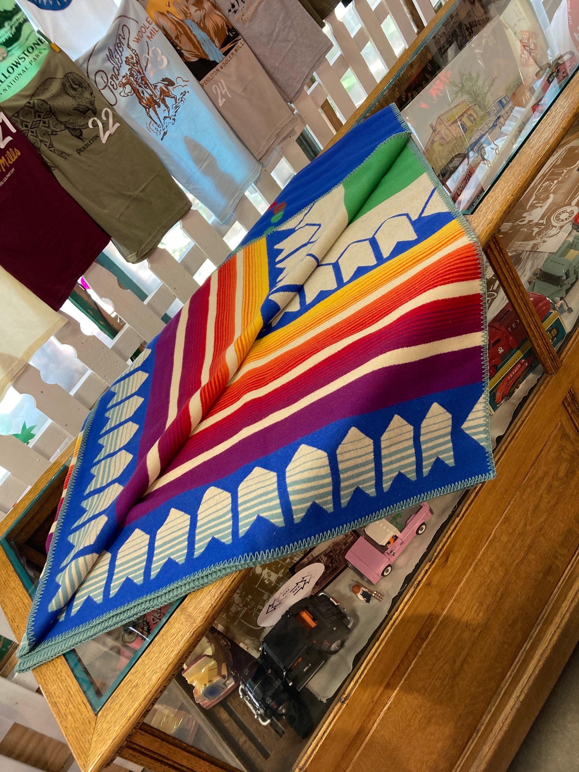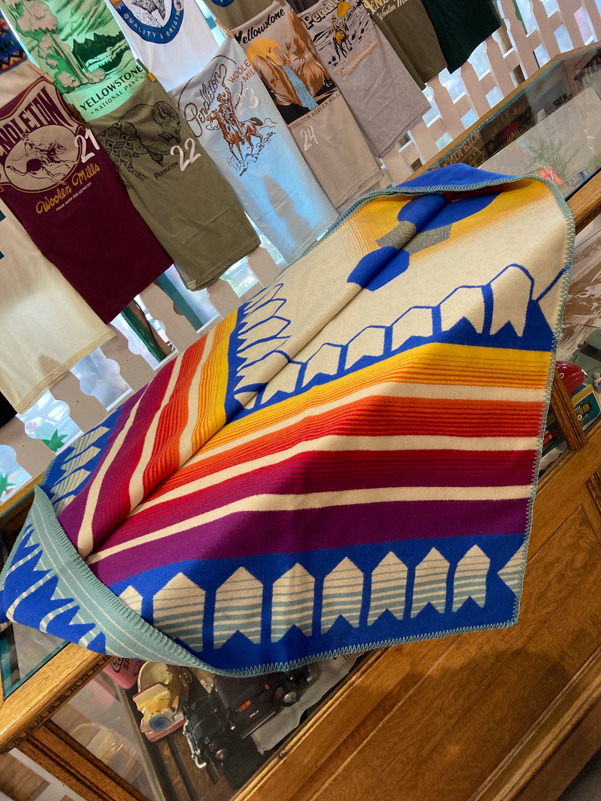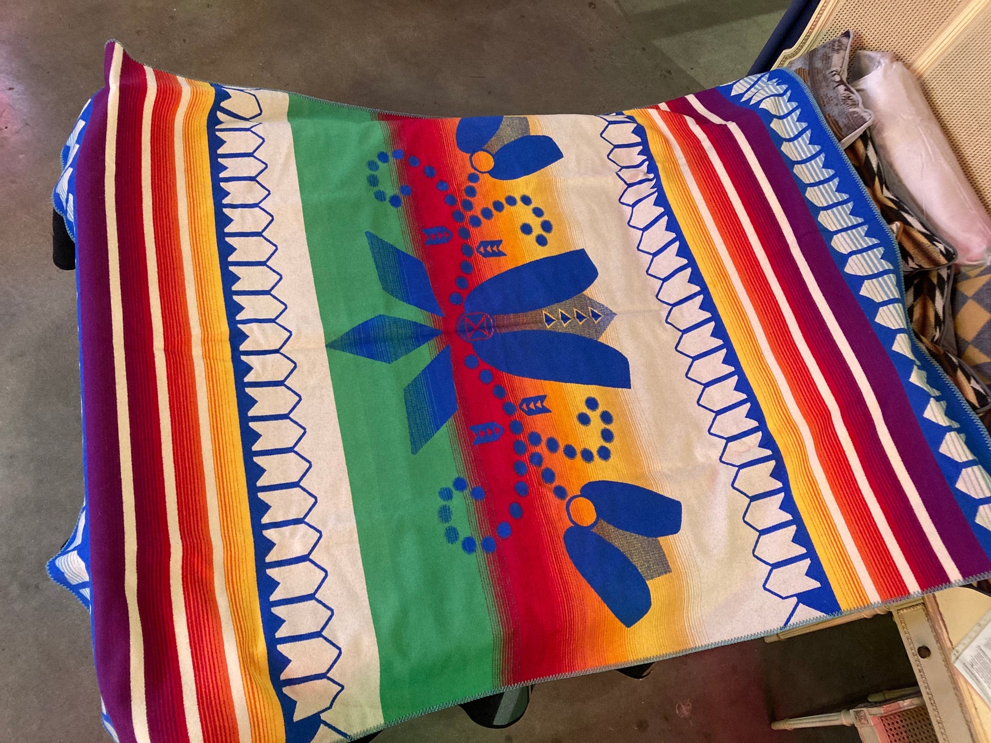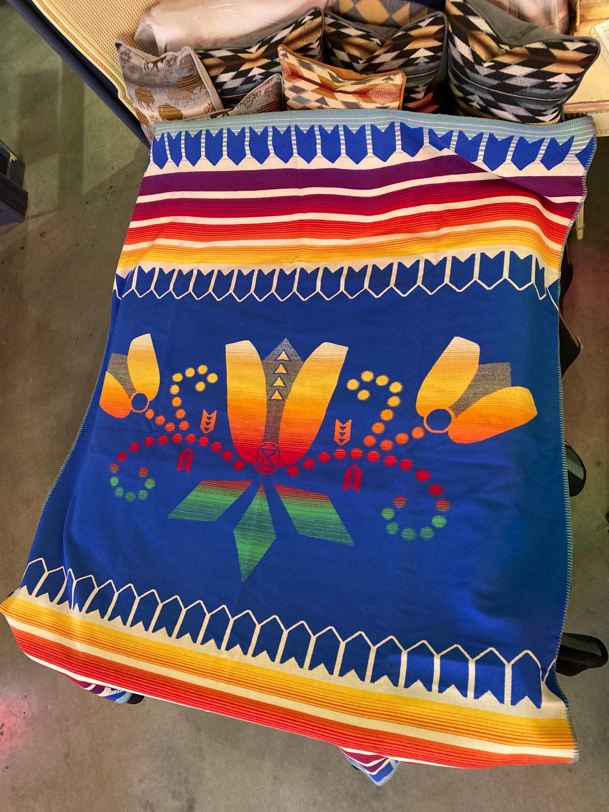 A made-in-USA wool blanket with a pattern of arrow shapes that symbolize finding a good path in life, acknowledging that every path holds pitfalls and dangers, as well as opportunity. In this design, artist Deshawna Anderson honors the loss of missing and murdered indigenous Native people. The hourglass shape at the base of the largest blossom represents life's spiritual journey through the most difficult circumstances.