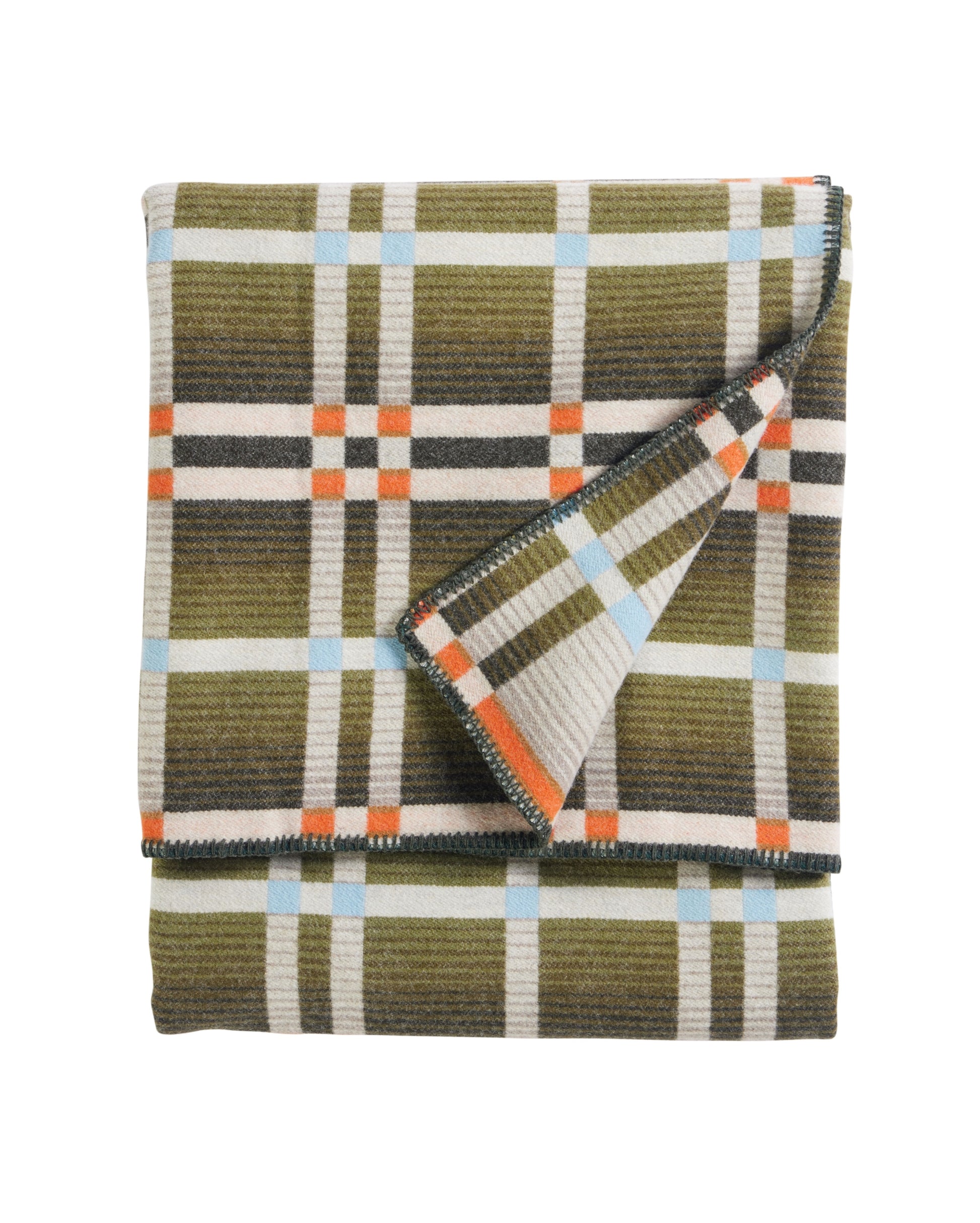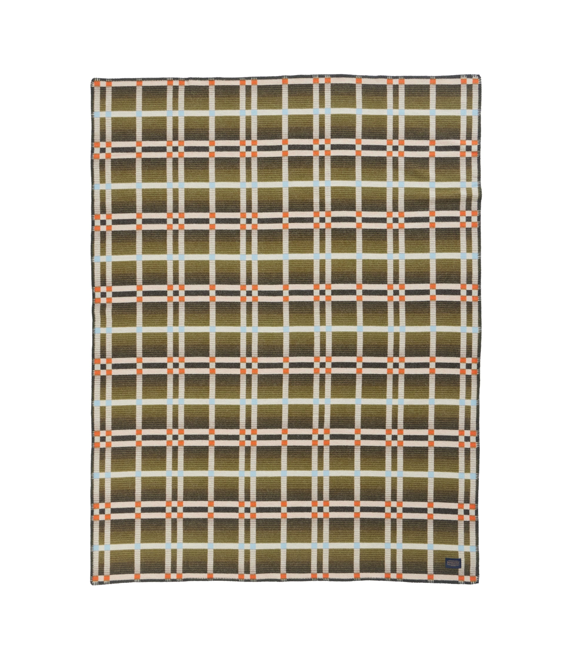 54 x 72 inches. The Four Square Throw is woven with double weave construction in Pendleton's USA mills, for a strong pattern on both sides, at home in rustic cabins and contemporary lofts. Ombre colors back a geometric pattern, with fun accent patterns at the intersections. Exclusive Pendleton pattern, designed and manufactured entirely in the USA. Whip stitched edging. 100% pure virgin wool, woven and made in the USA. Dry clean only.