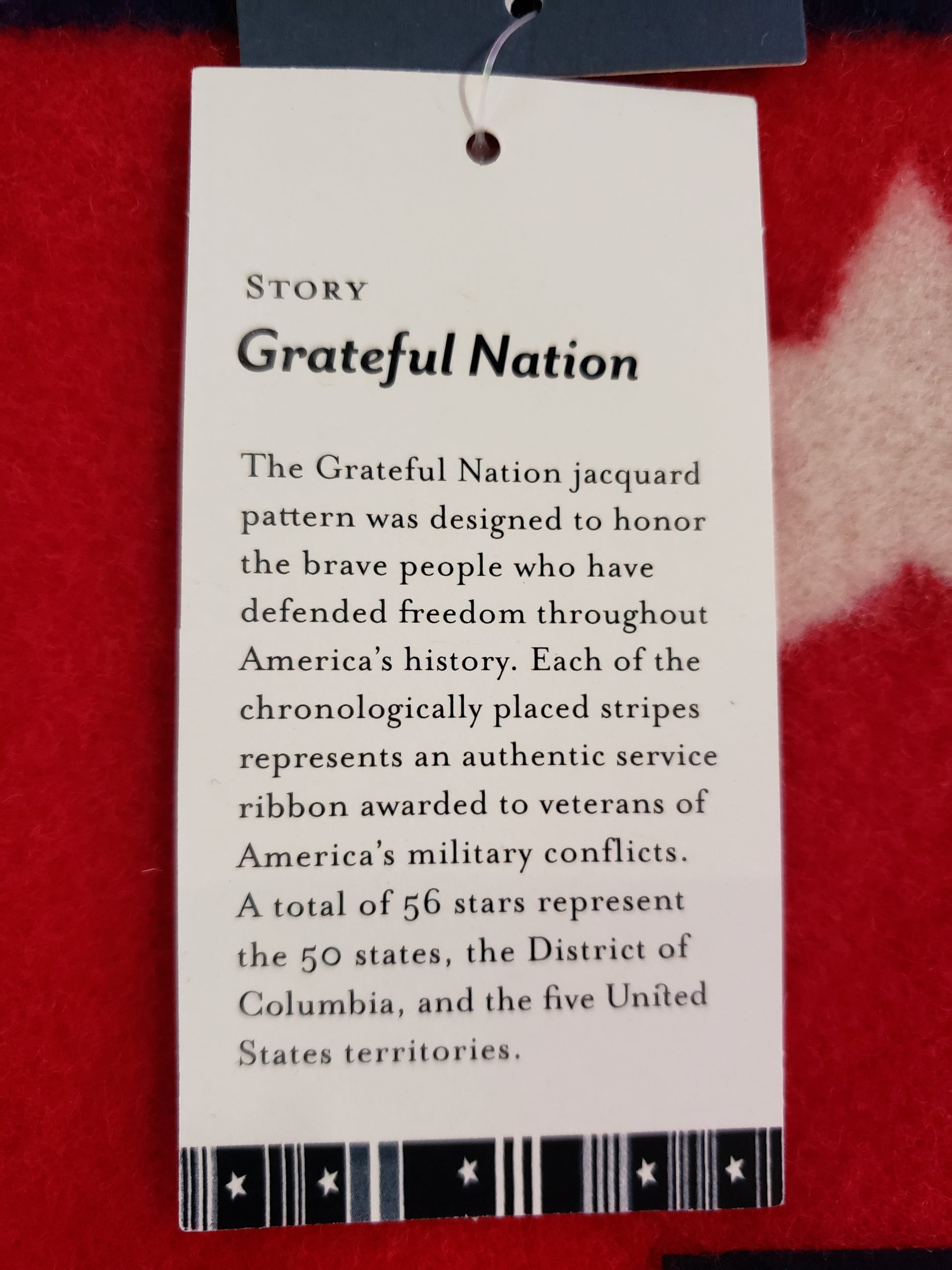 Pendleton's Grateful Nation pattern was designed to honor the brave people who have defended freedom throughout America's history., Each of the chronologically placed stripes represents an authentic service ribbon awarded to veterans of America's military conflicts. A total of 56 stars represent the 50 states, the District of Columbia, and the five United States Territories. 64 x 80 inches, 82% wool and 18% cotton. Very soft and cozy.