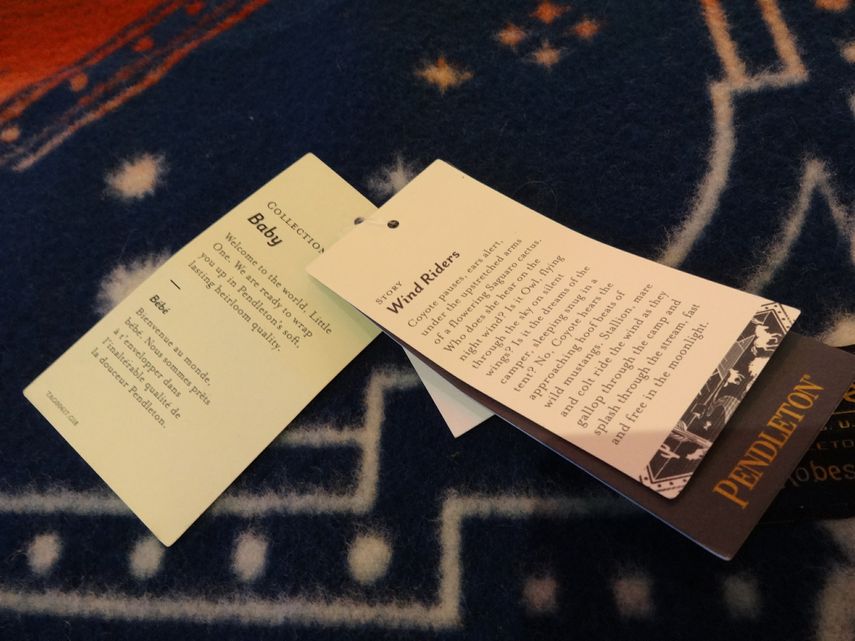 Pendleton Jacquard Crib Blanket, in the beautiful Wind Riders pattern. 32 x 44 inches, the perfect size for a crib or toddler bed. Made in USA. The story of Wind Riders is as follows: Coyote pauses, ears alert, under the upstretched arms of a flowering Saguaro cactus. Who does she hear on the night wind? Is it Owl, flying through the sky on silent wings? Is it the dreams of the camper, sleeping snug in a tent? No, Coyote hears the approaching hoofbeats of wild mustangs. Stallion, mare and colt ride the wind as they gallop through the camp and splash through the stream, fast and free in the moonlight.