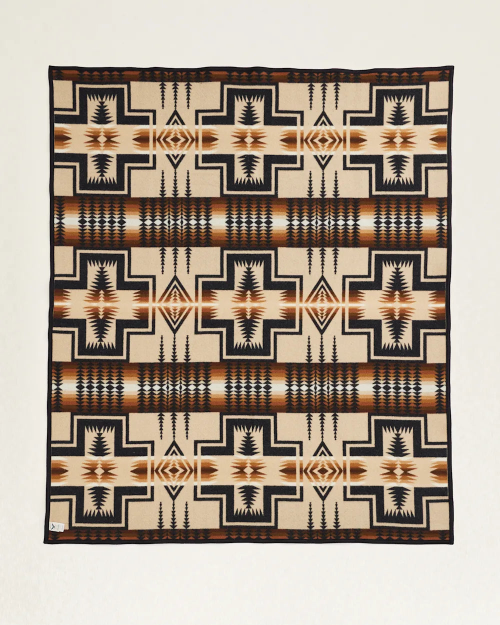 One of our most popular designs ever, crafted of USA-made wool in our Pendleton, Oregon mill. In 1923, President Warren Harding and his wife Florence came west to dedicate a portion of the old Oregon Trail. At the ceremony, local chiefs presented the first lady with a Pendleton shawl inspired by our famous Chief Joseph blanket. This dynamic design was an instant hit and remains in production today. "Absolutely gorgeous," says one customer.