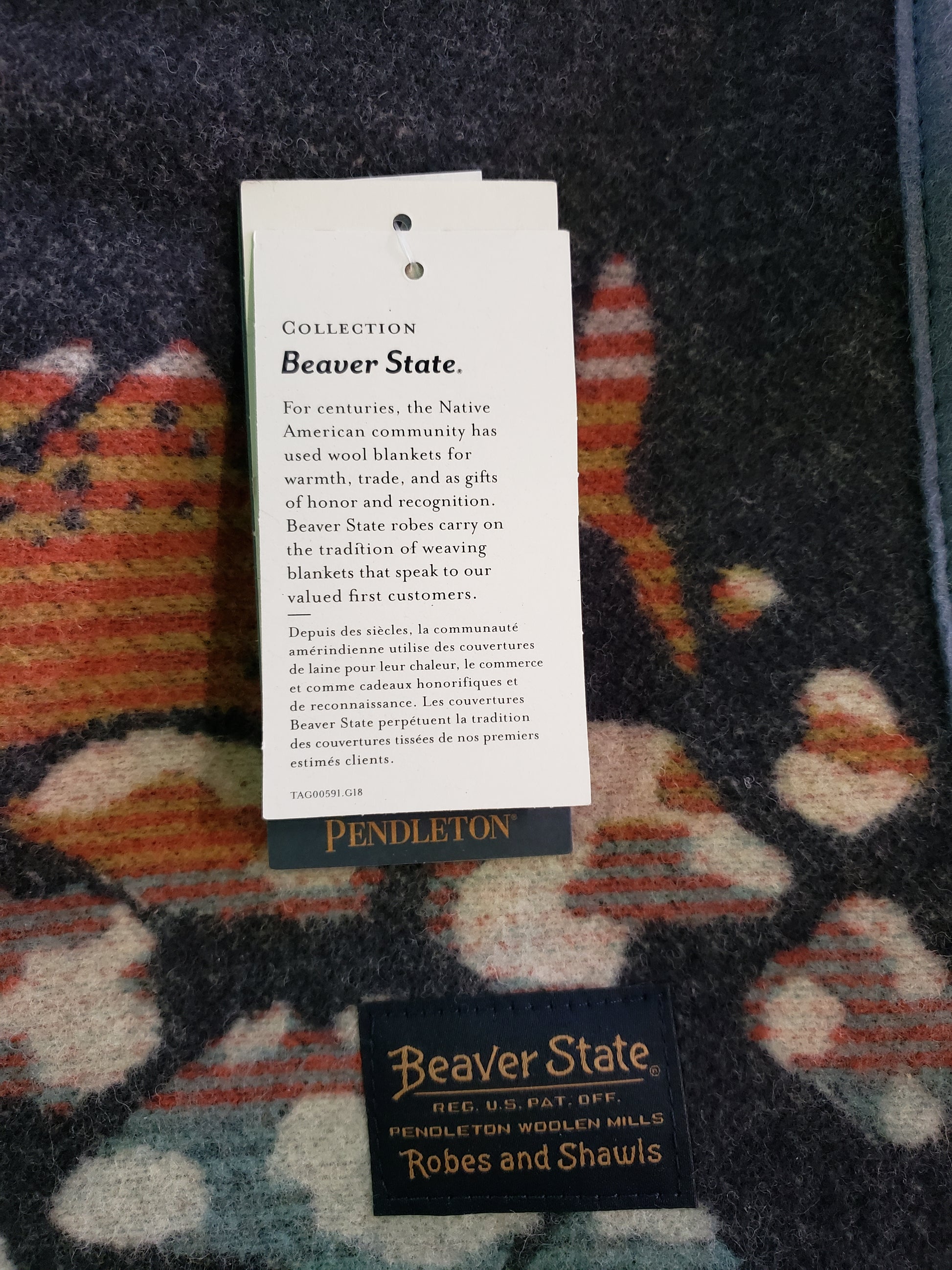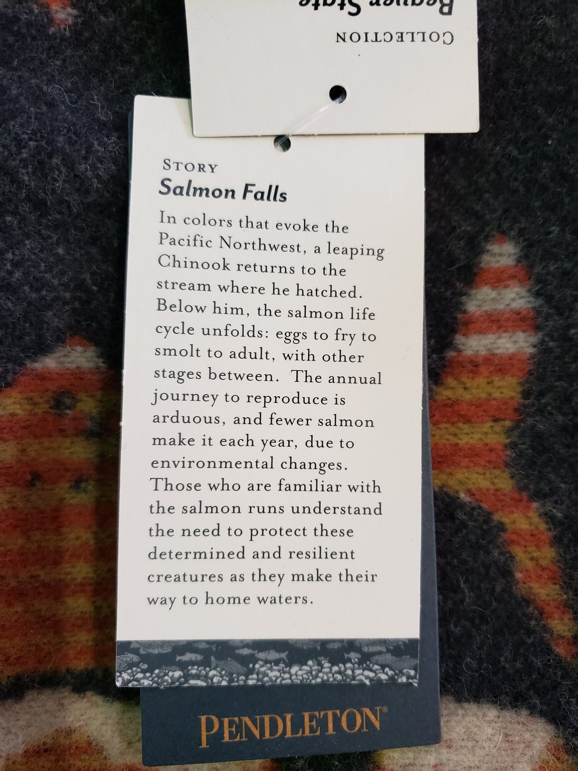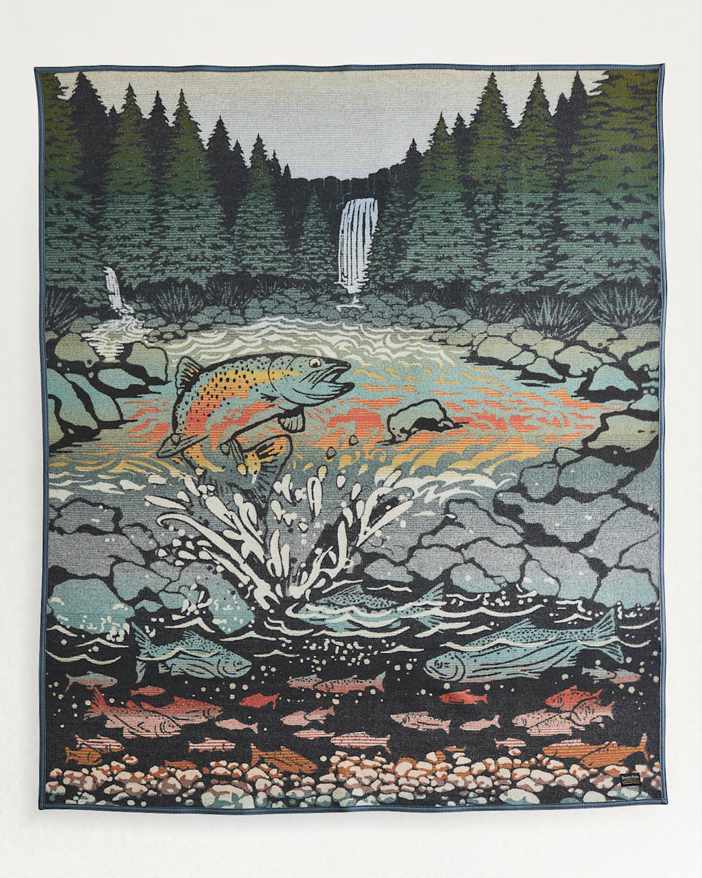 Pendleton Jacquard Robe (Blanket) in Salmon Falls. This blanket is 64 x 80 inches. It is 82% wool and 18% cotton. Part of the Pendleton Beaver State Collection, it is a tribute to the life cycle of the Salmon. Beautiful color palette!