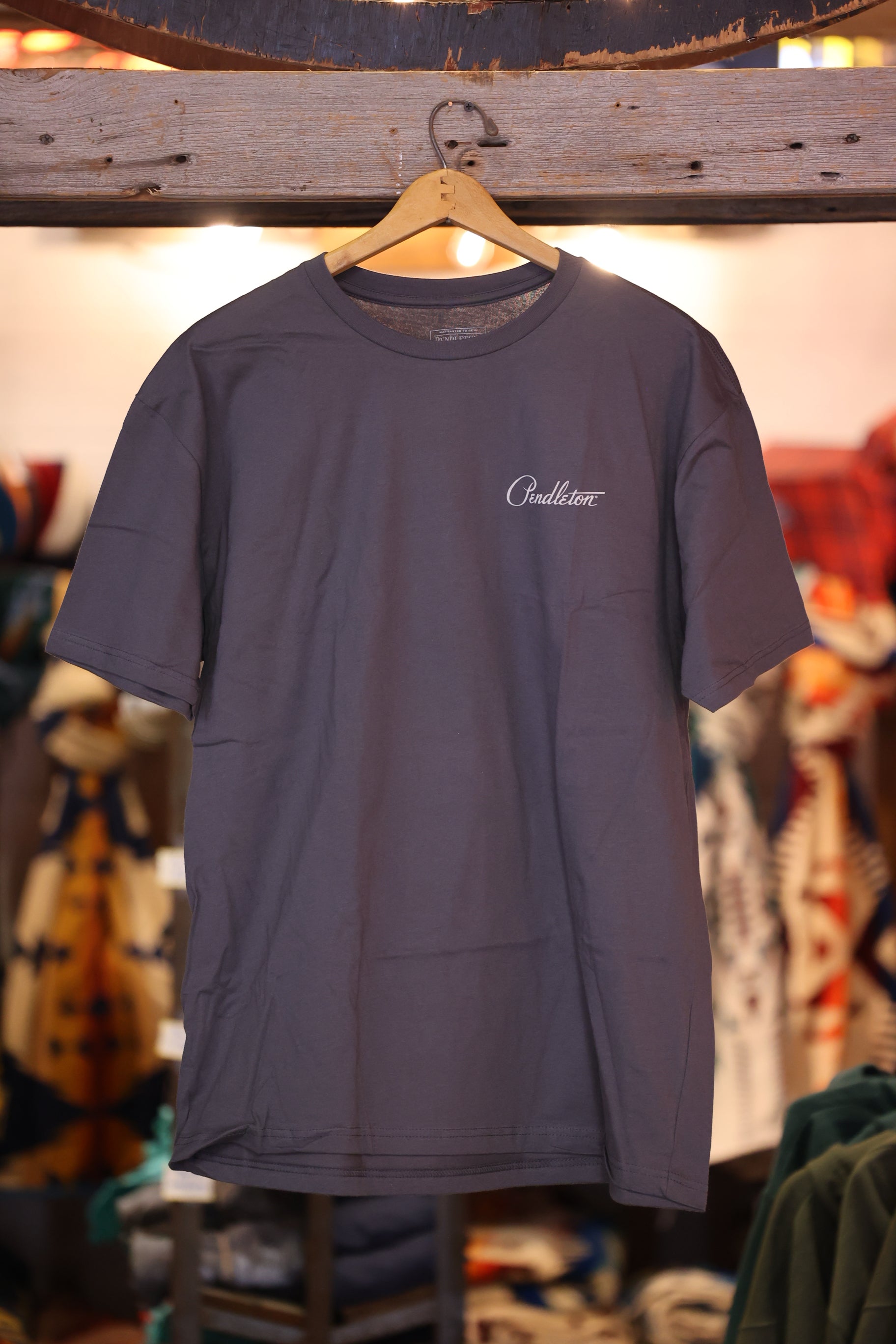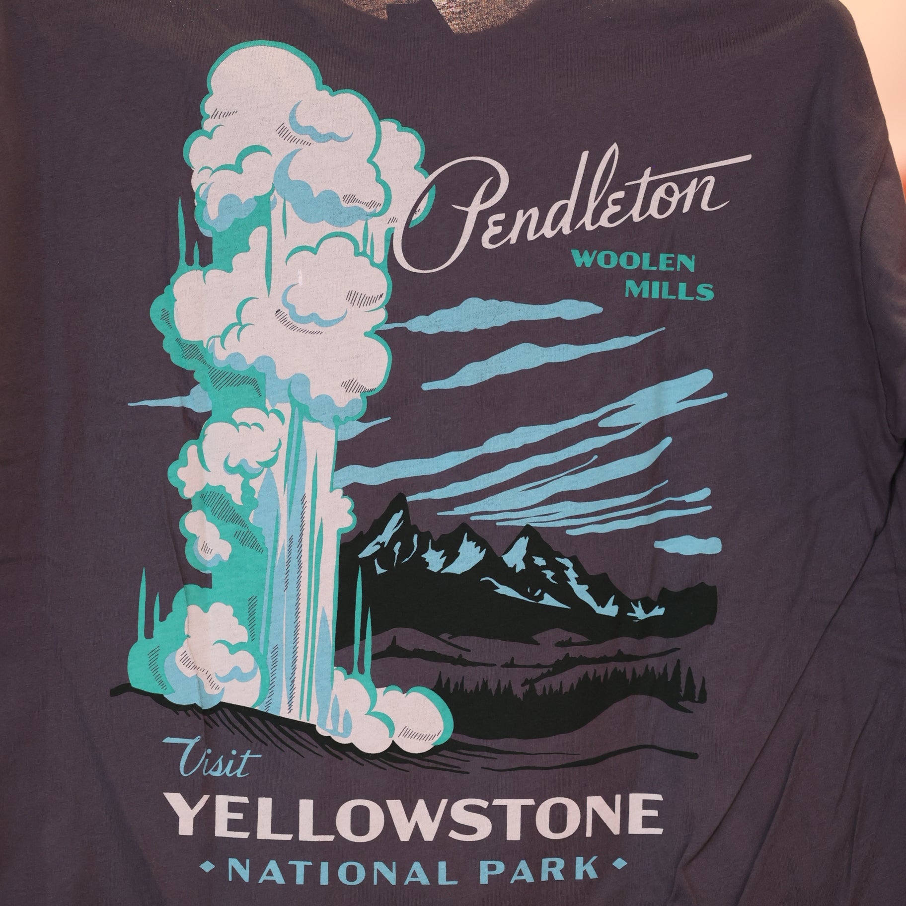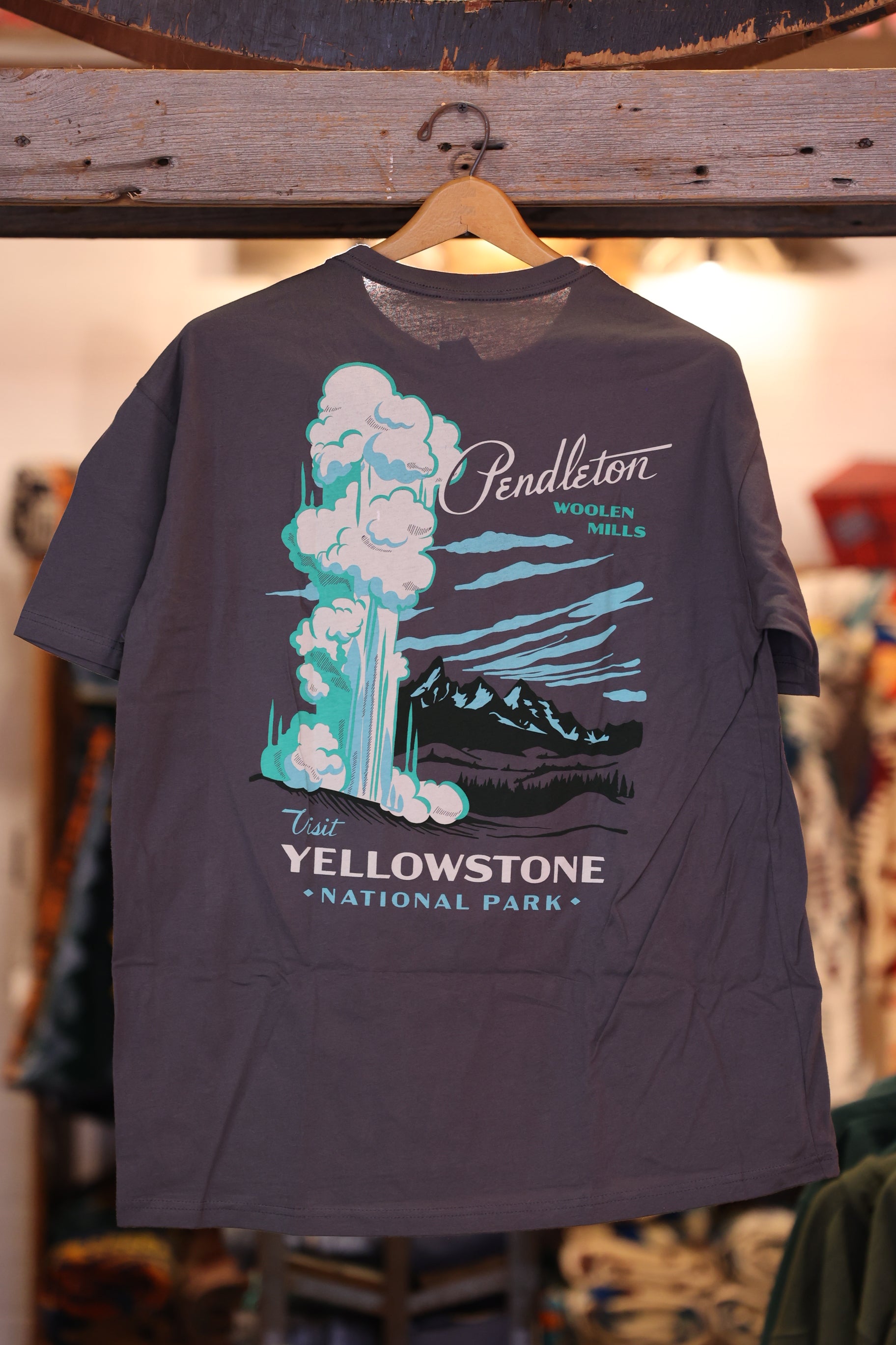 Men's soft dark grey t-shirt with a vintage-inspired scene of Yellowstone National Park's Old Faithful on the back and small Pendleton logo on the front left chest.