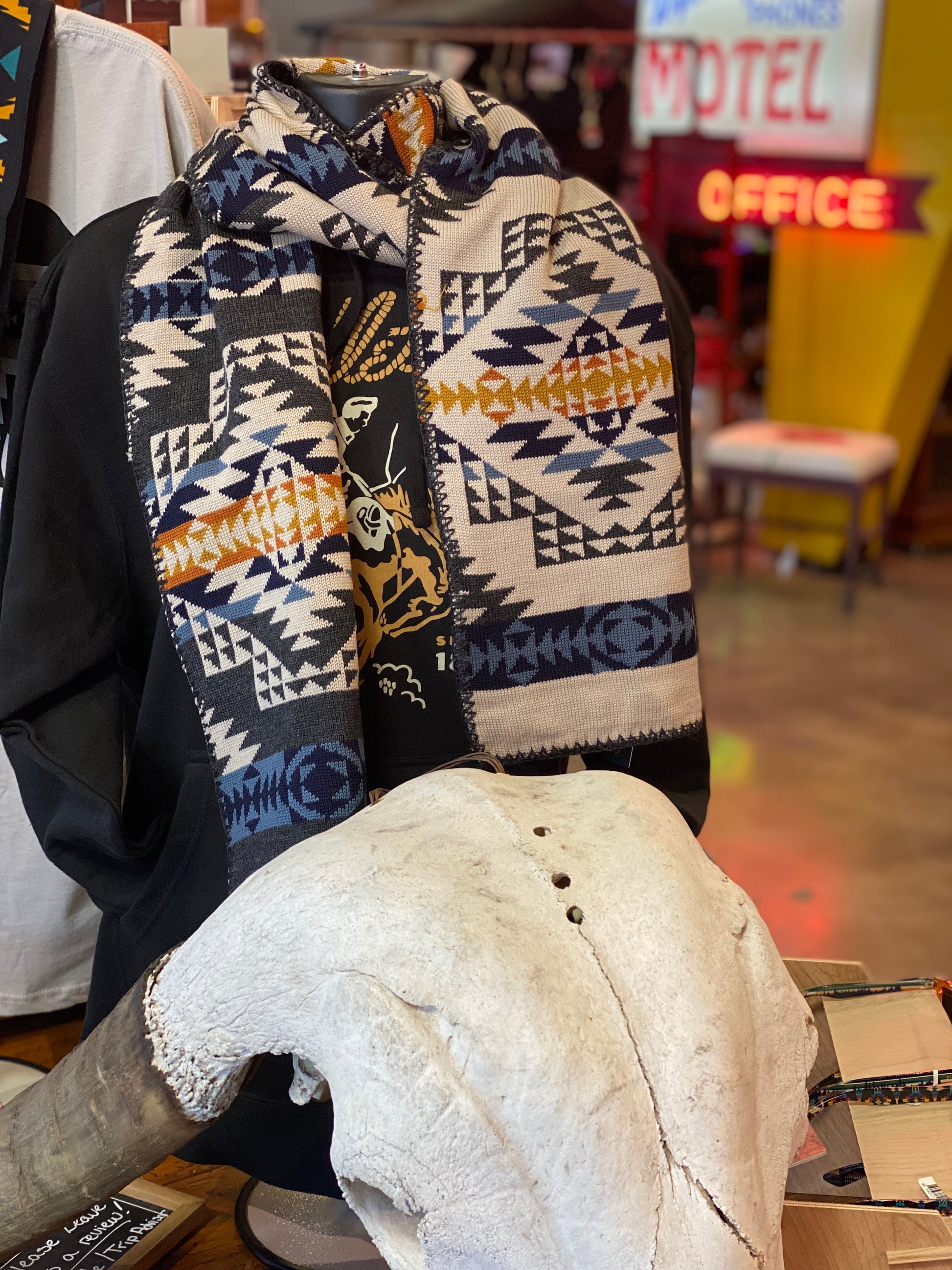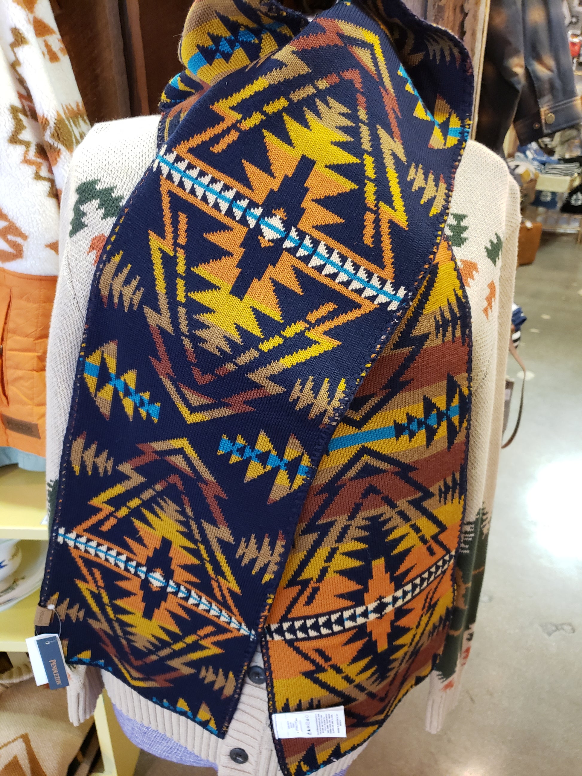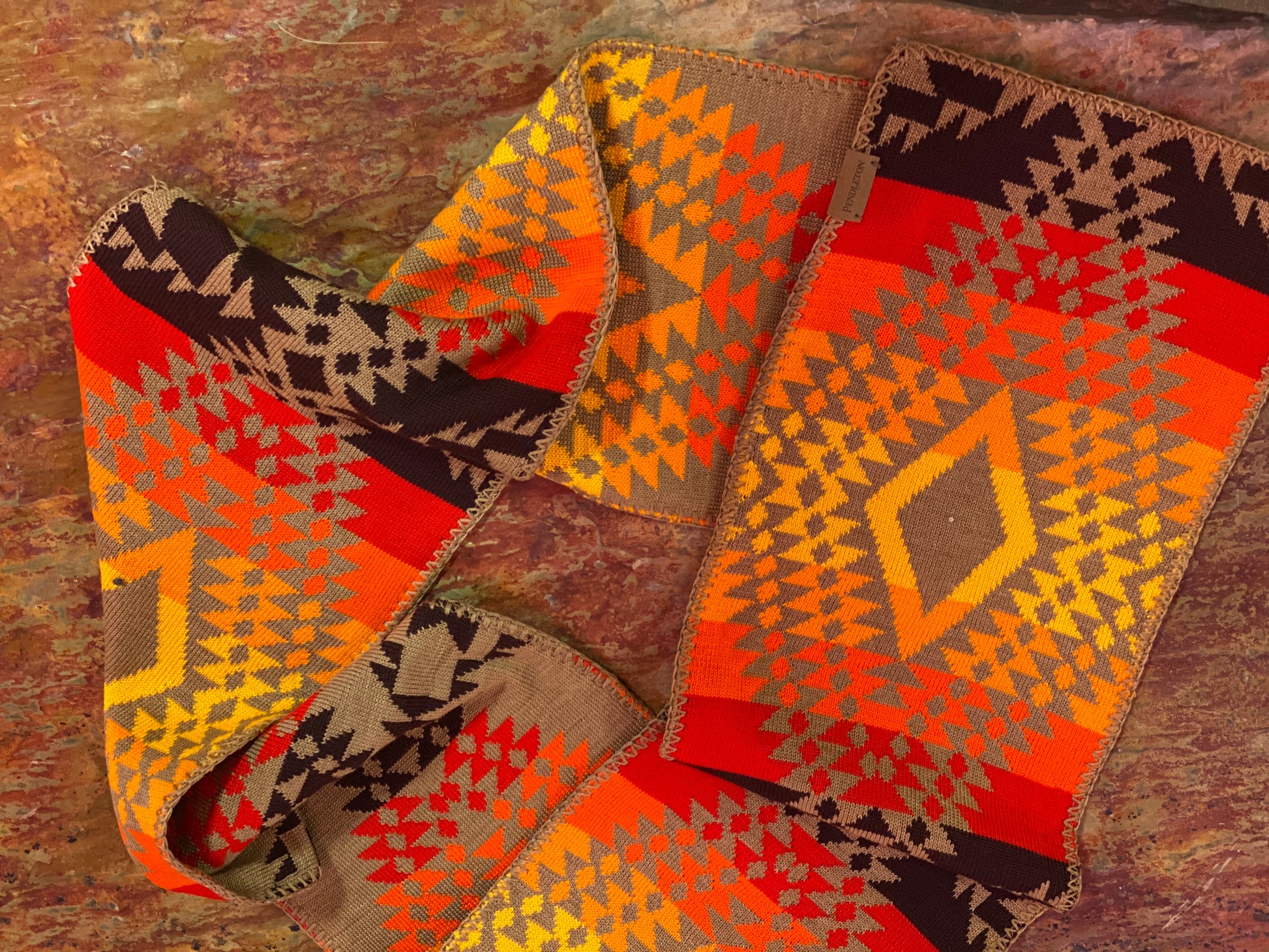 Long, warm 100% Merino wool scarf features a slightly different pattern on each side, like the iconic Pendleton blankets from which the pattern is drawn. This means the scarf is reversible to add flair to any outfit. 9 x 70 inches with a blanket stitch edging, very soft and cozy.
