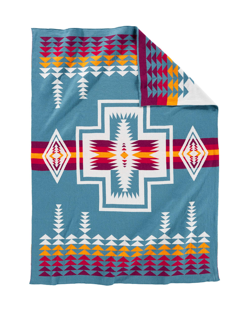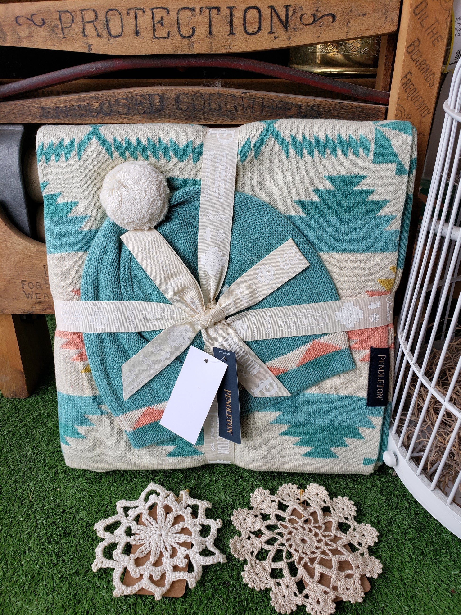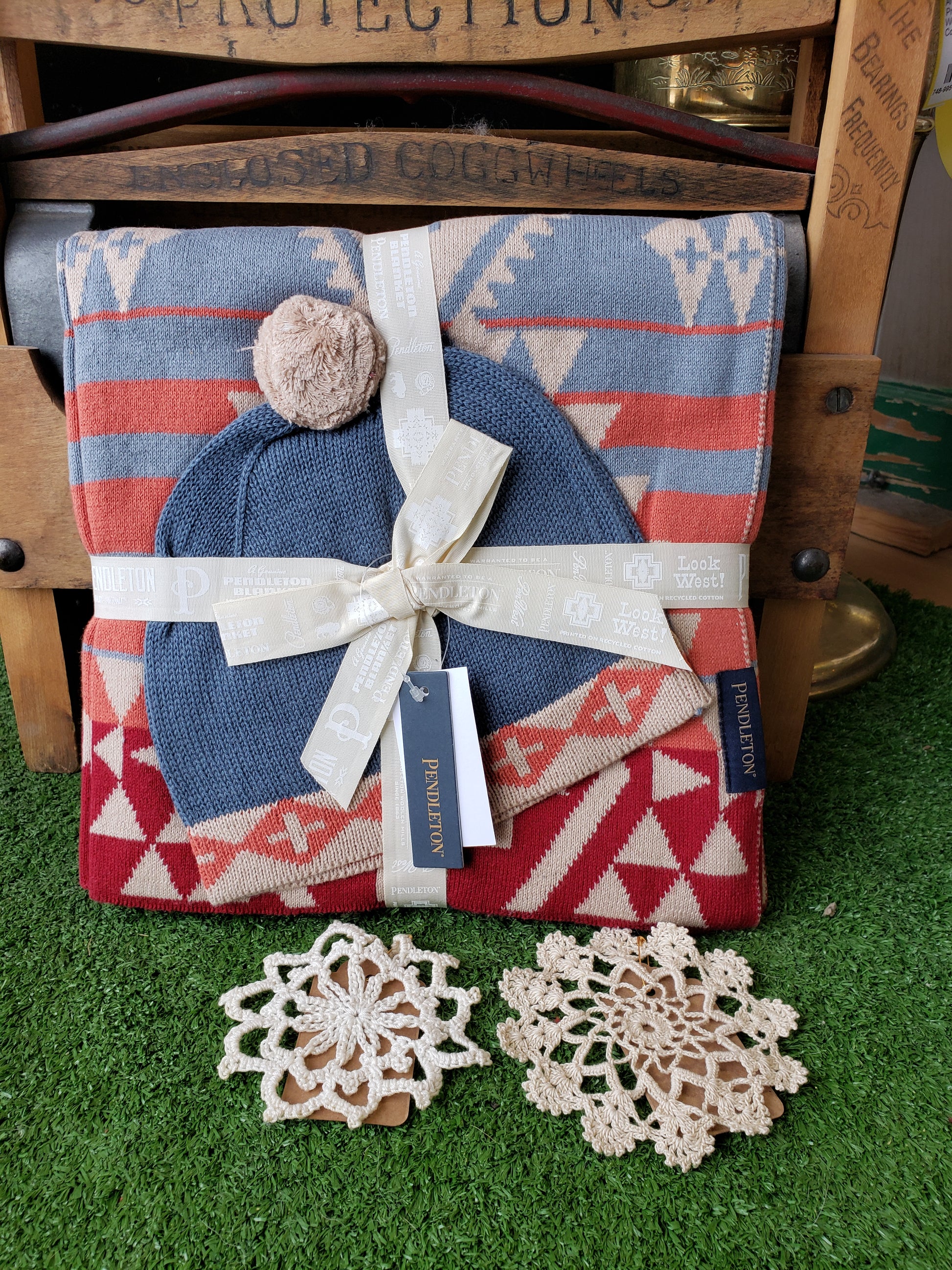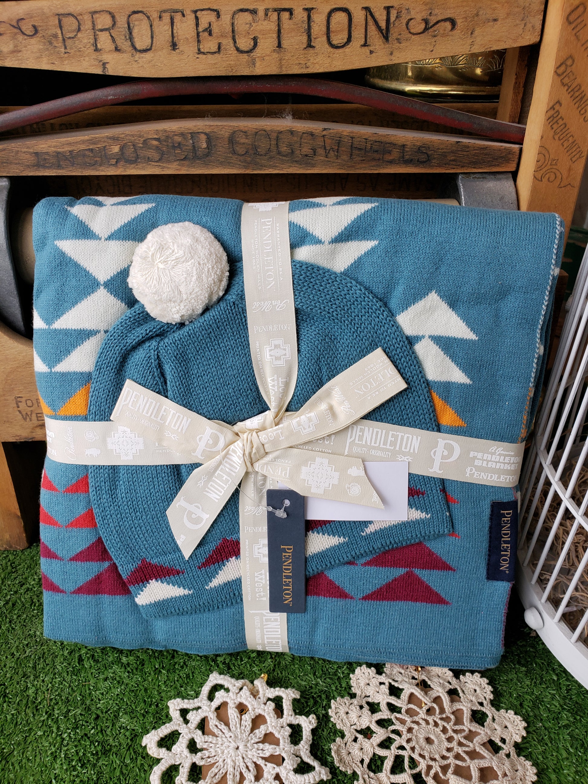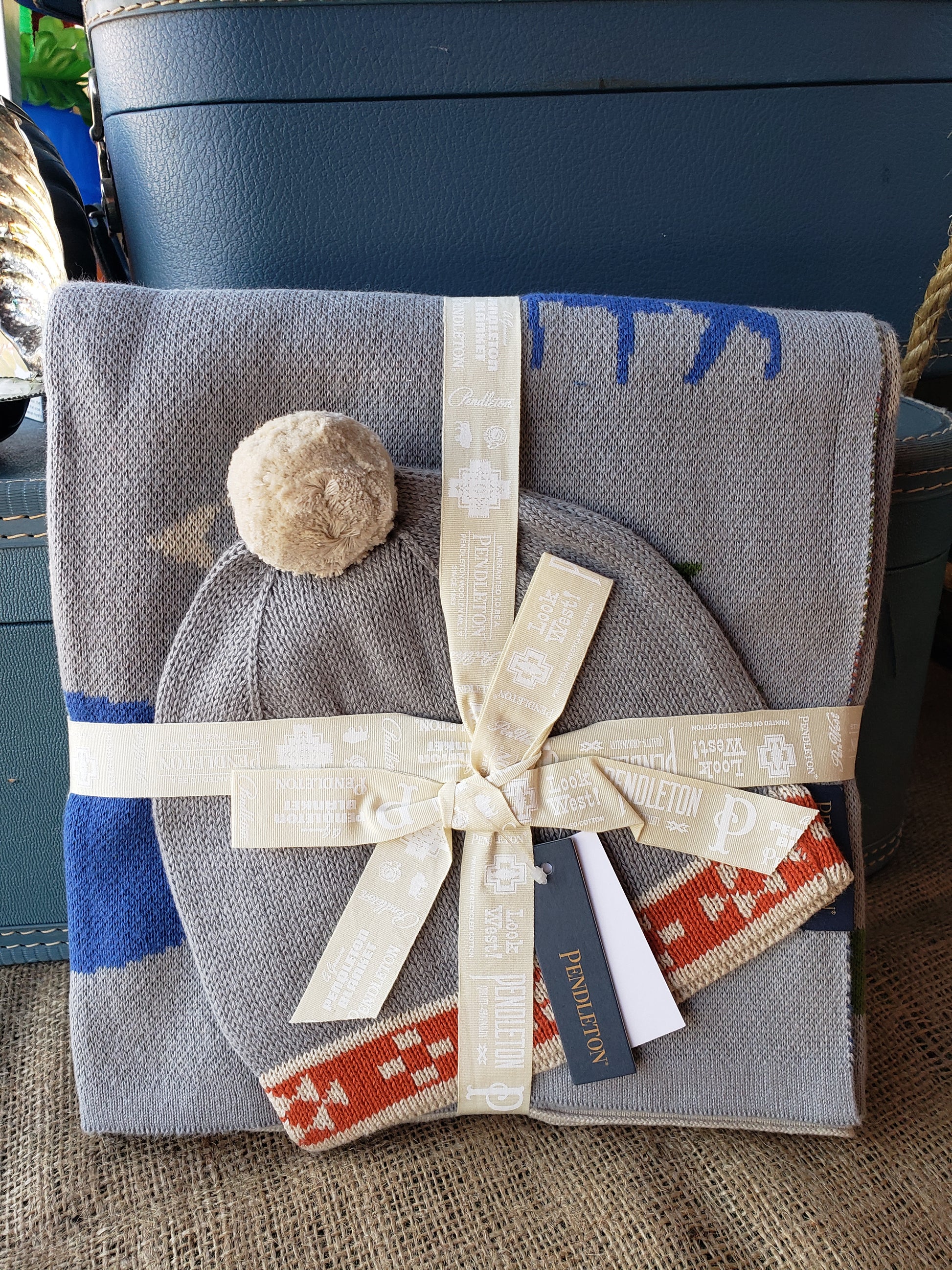 knit blanket, with a matching knit beanie. Styled after the Pendleton
