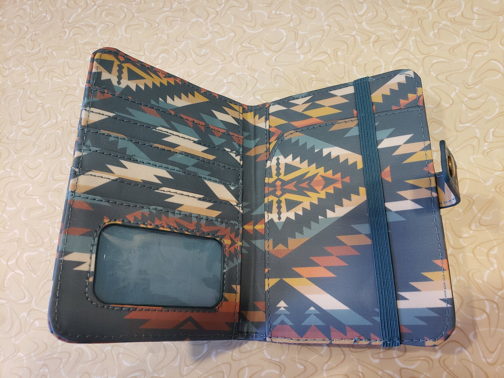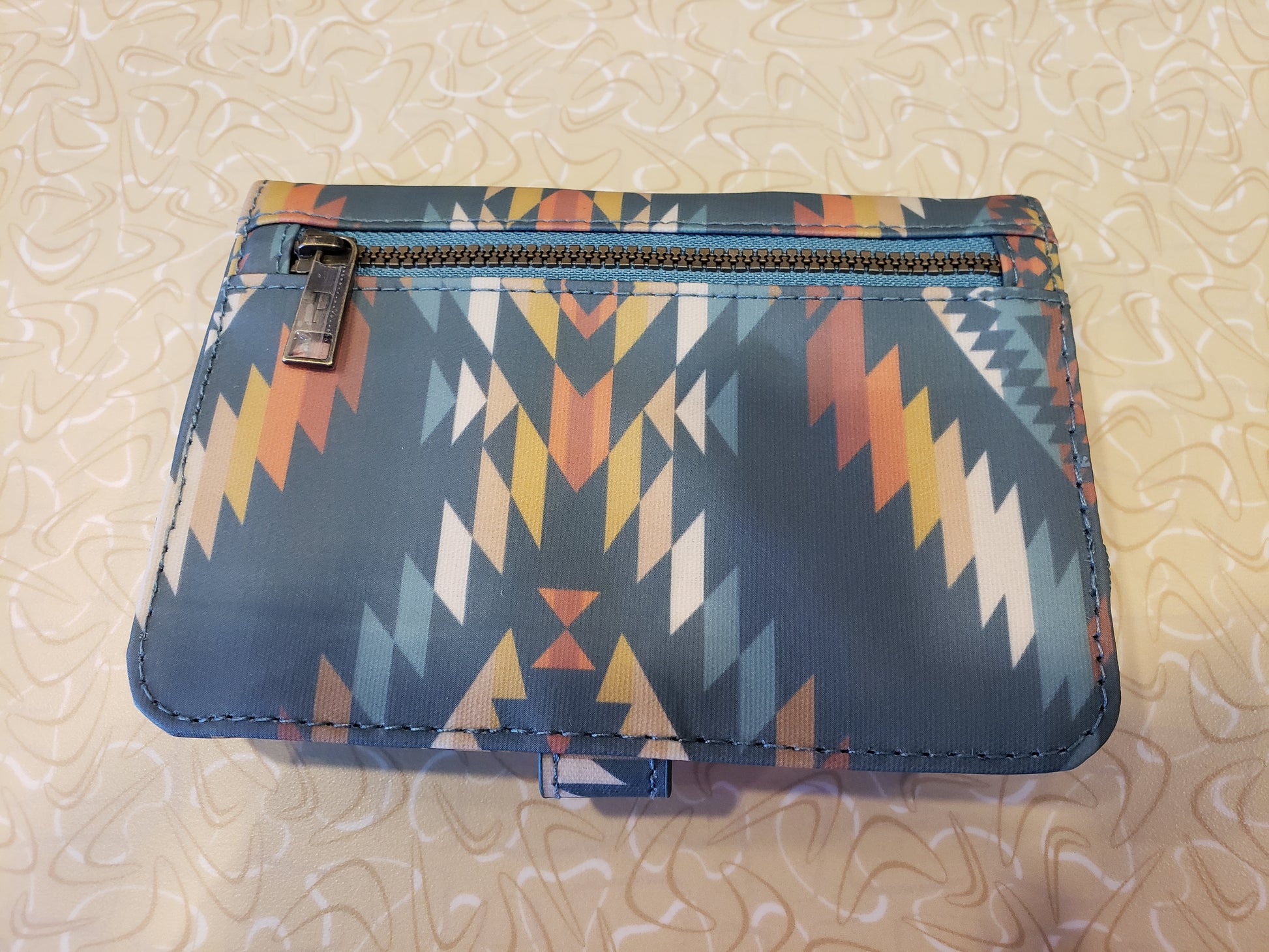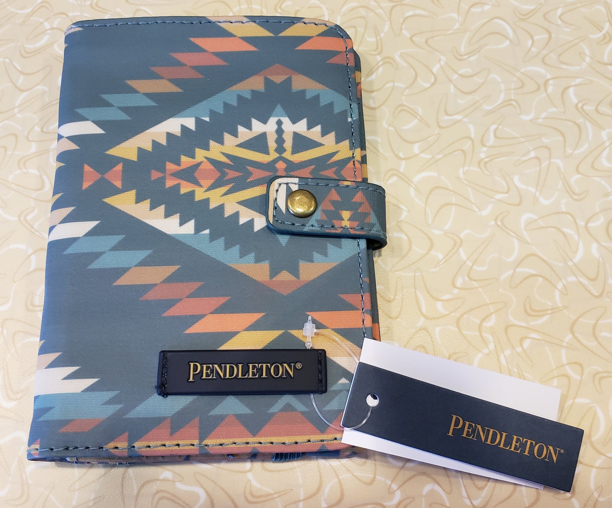 Pendleton Passport case measures 6 x 4 inches. It closes with a sturdy snap, has a clear ID slot and 5 card slots, plus an elastic strap and a slot to hold your passport and paperwork securely. It also has a zip pocket on the back side. Pattern placement may vary.