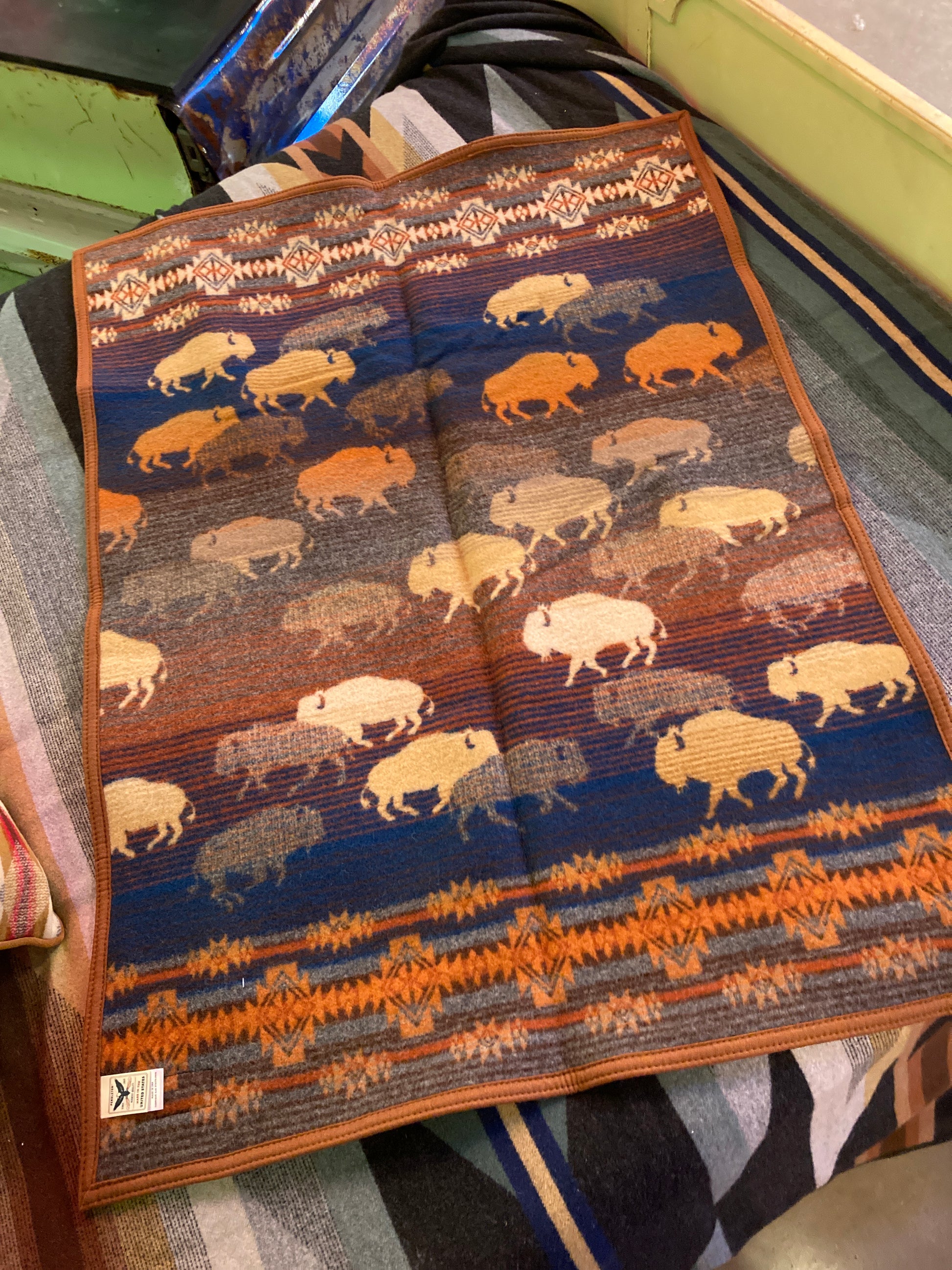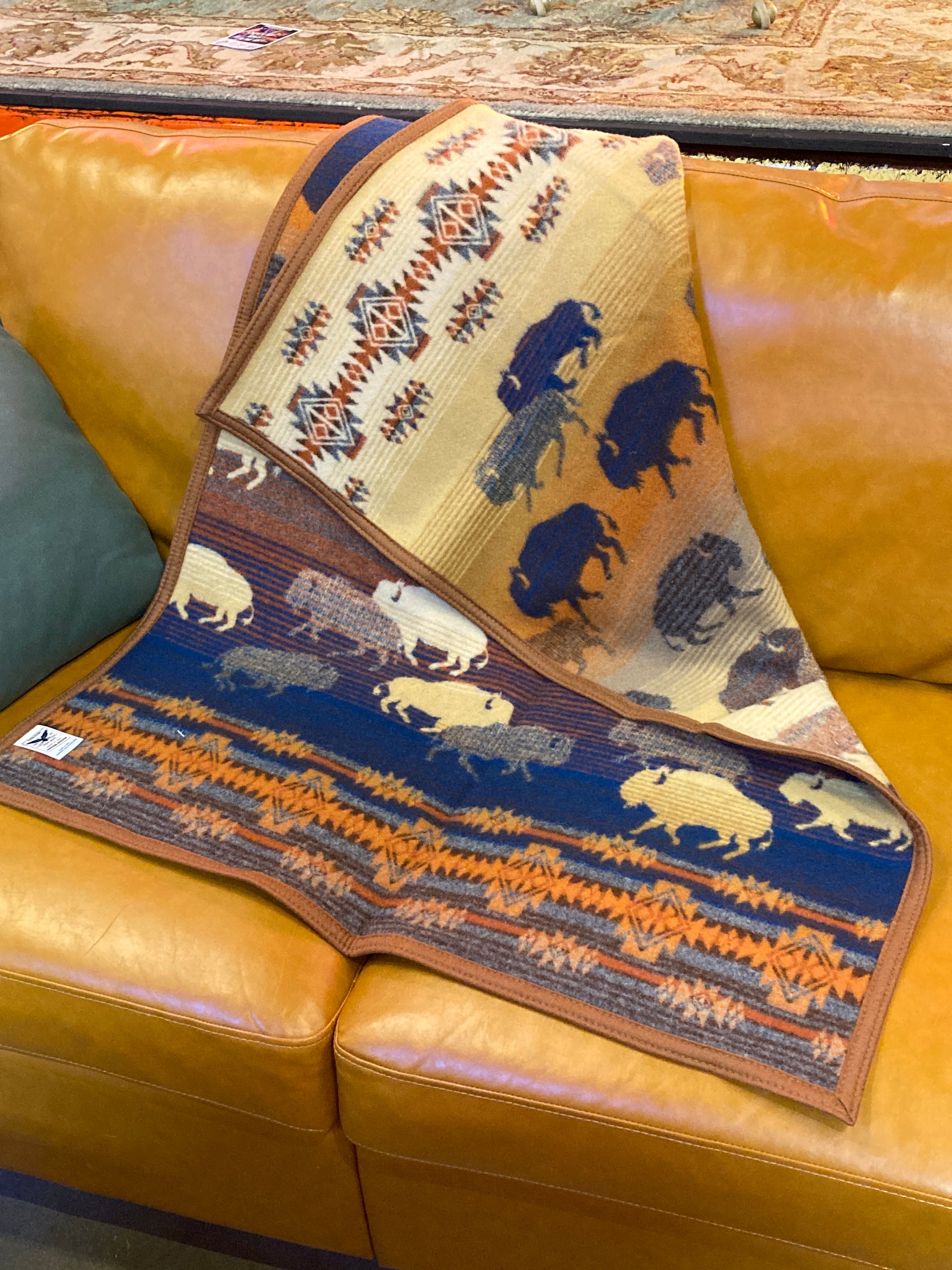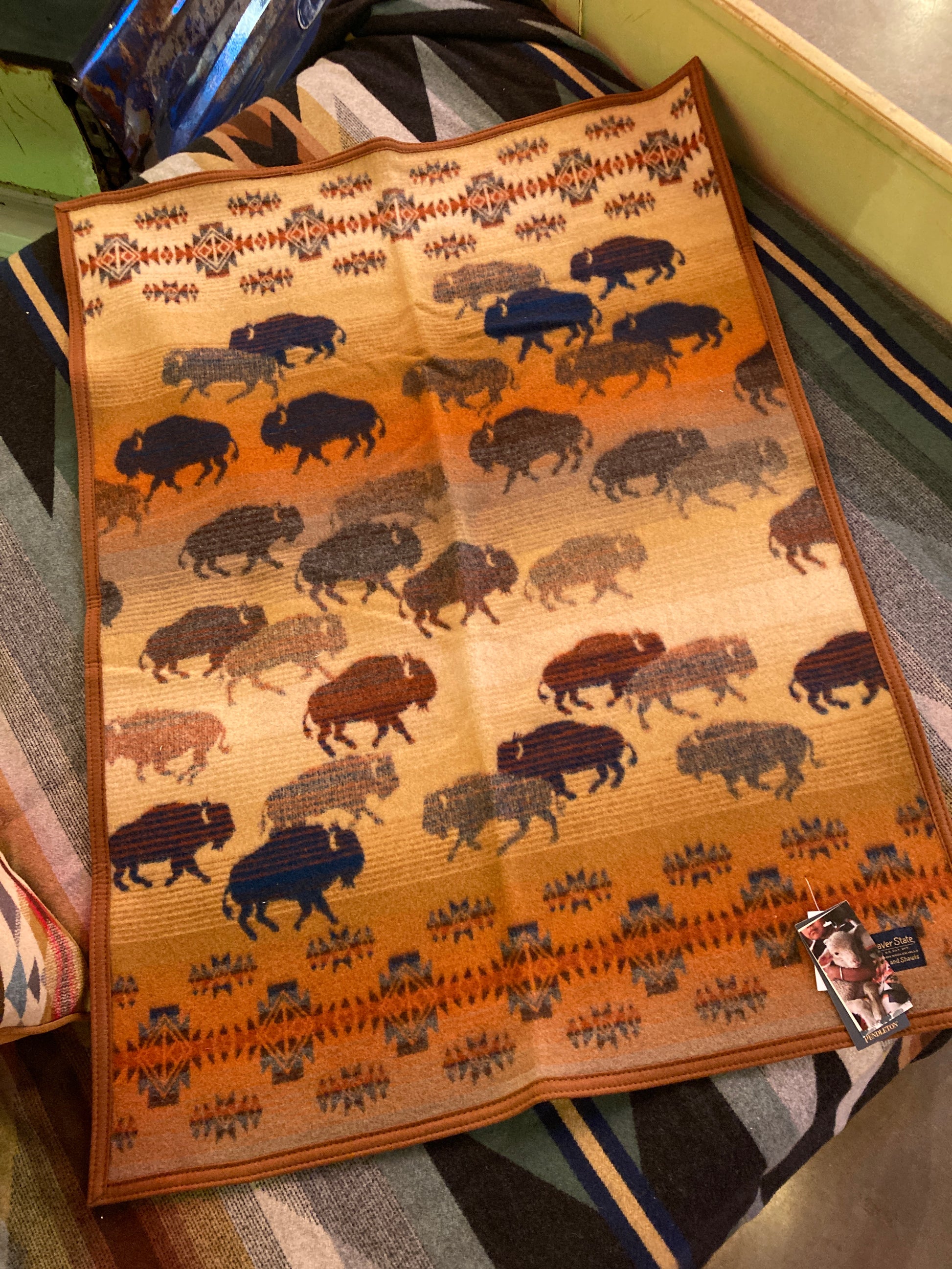 Made in America of our softest pure virgin wool, this baby blanket is a treasured gift Majestic bison roam freely across this keepsake, just as they do today in Yellowstone National Park. Teach the next generation a respect for nature with this vivid pattern in deep desert shades of tan, mahogany and blue. Includes blanket story.