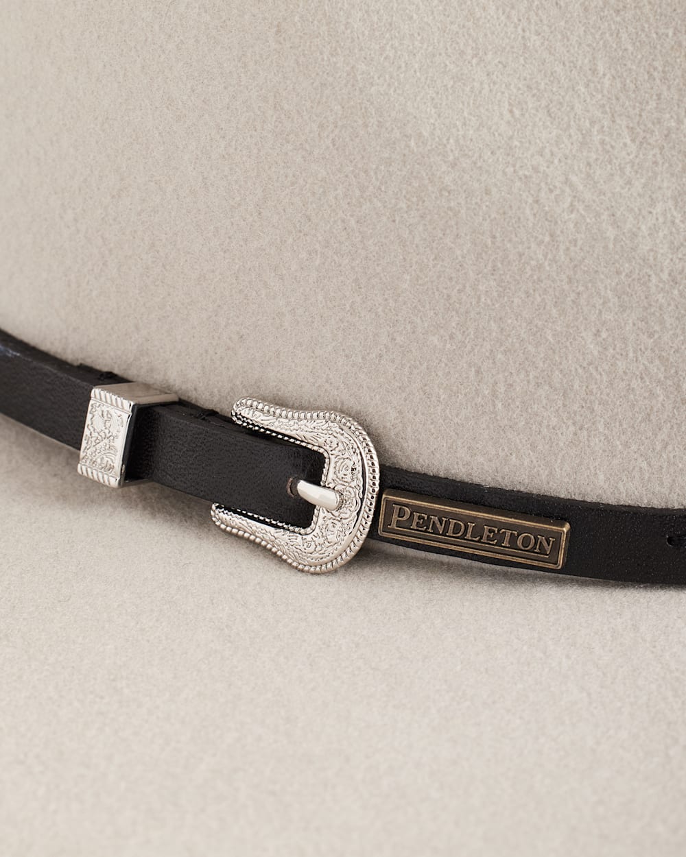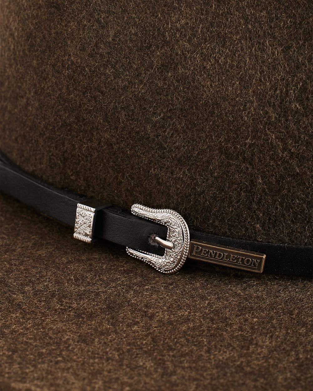 The Jackie Hat features a generous curved brim, center dent crown, stylish hatband, and Pendleton quality. Crafted from naturally water-resistant pure wool.