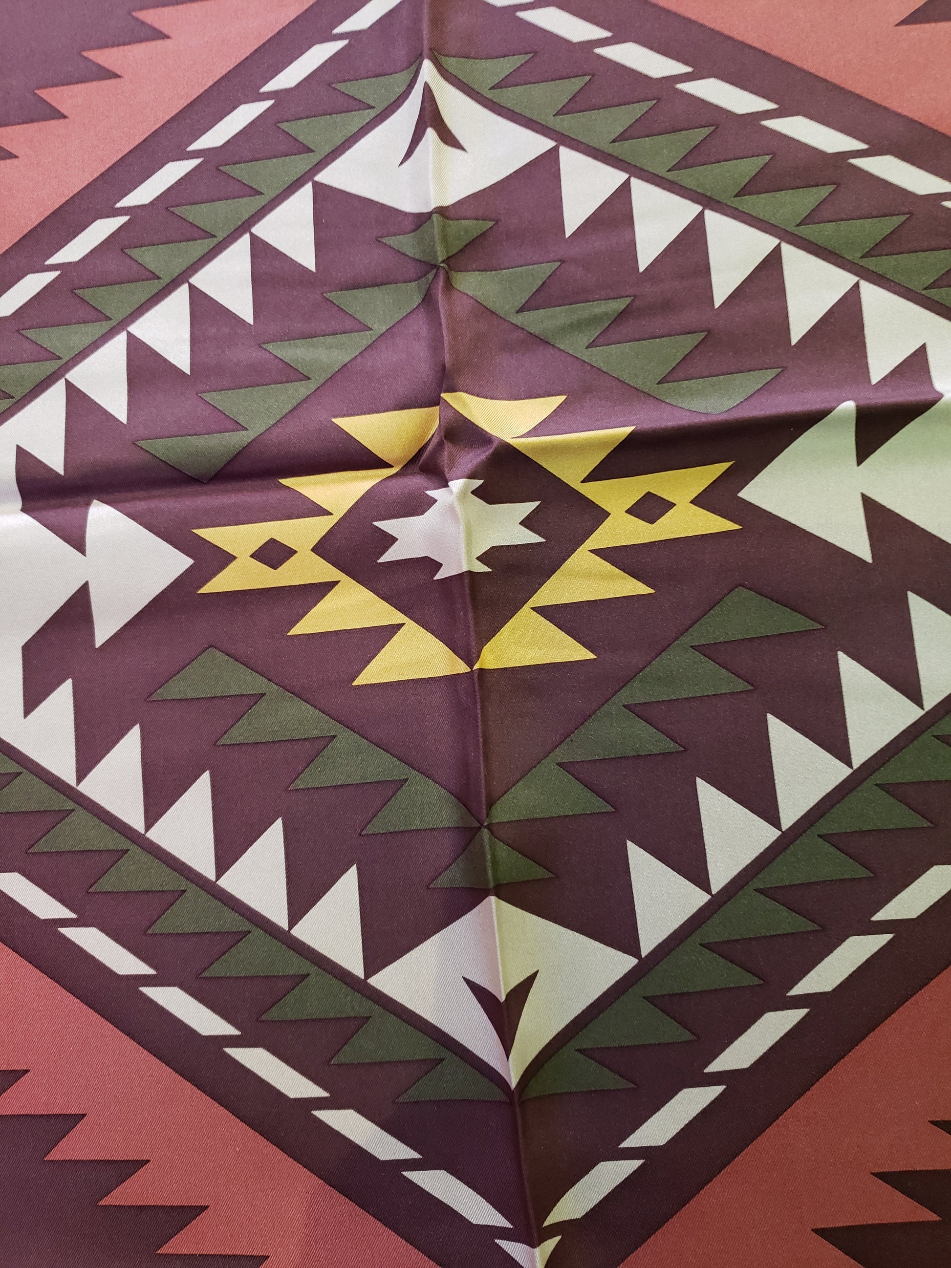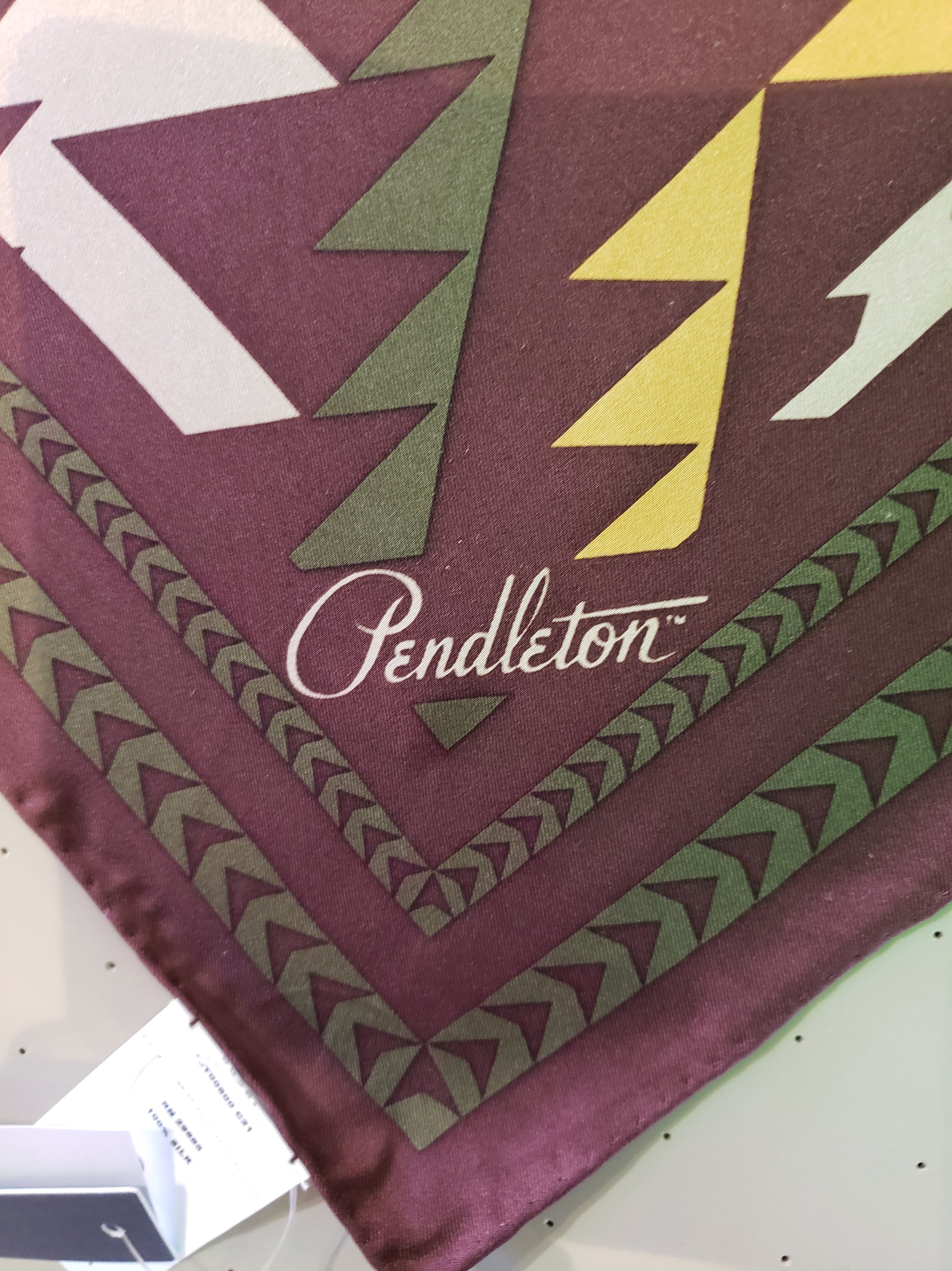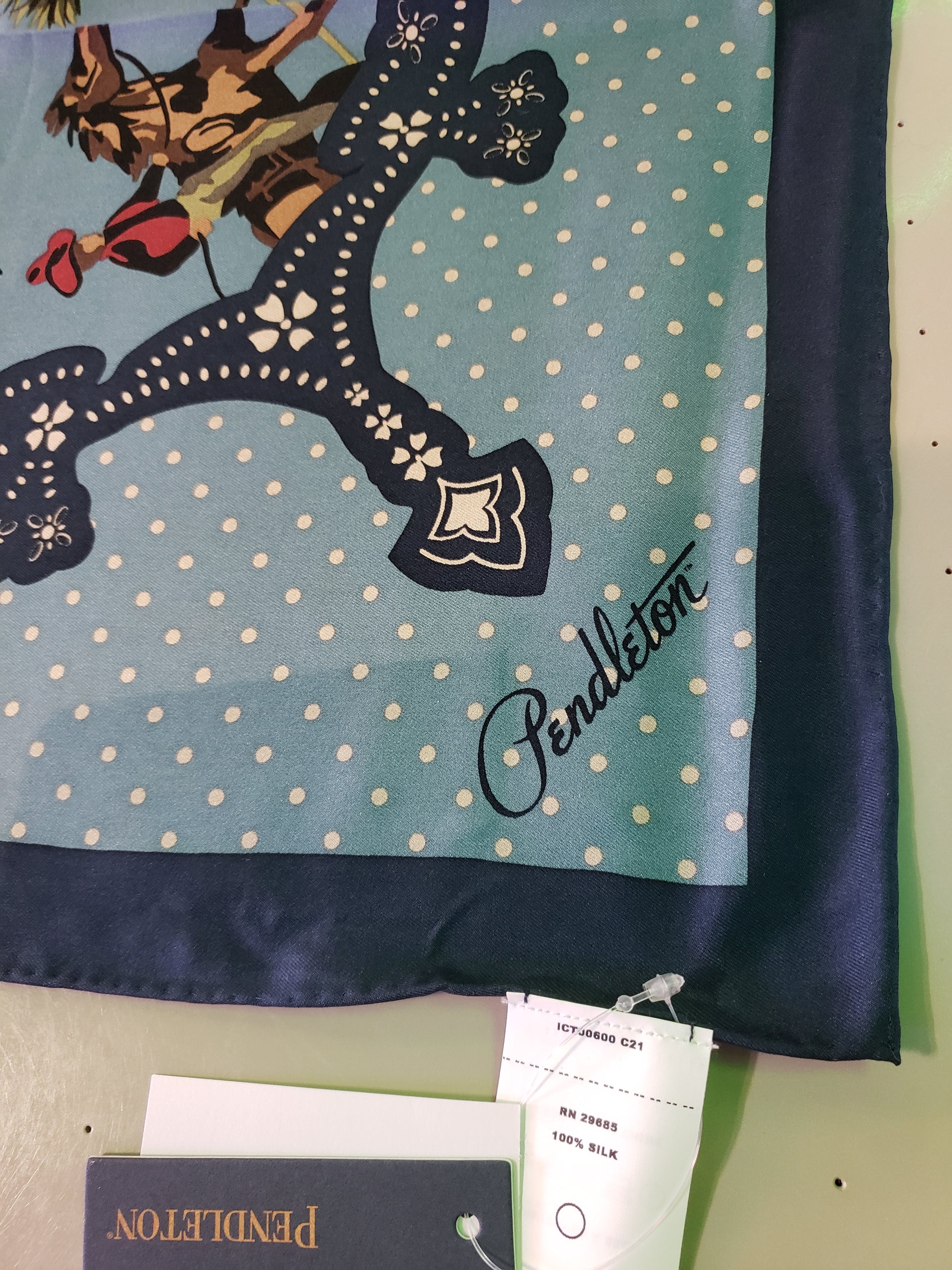 Pendleton Silk Scarf is made of 100% silk, Dry Clean Only. Beautiful scarf to accompany your blouse or jacket in style. It measures 34 inches square. Luxurious Silk drapes beautifully!