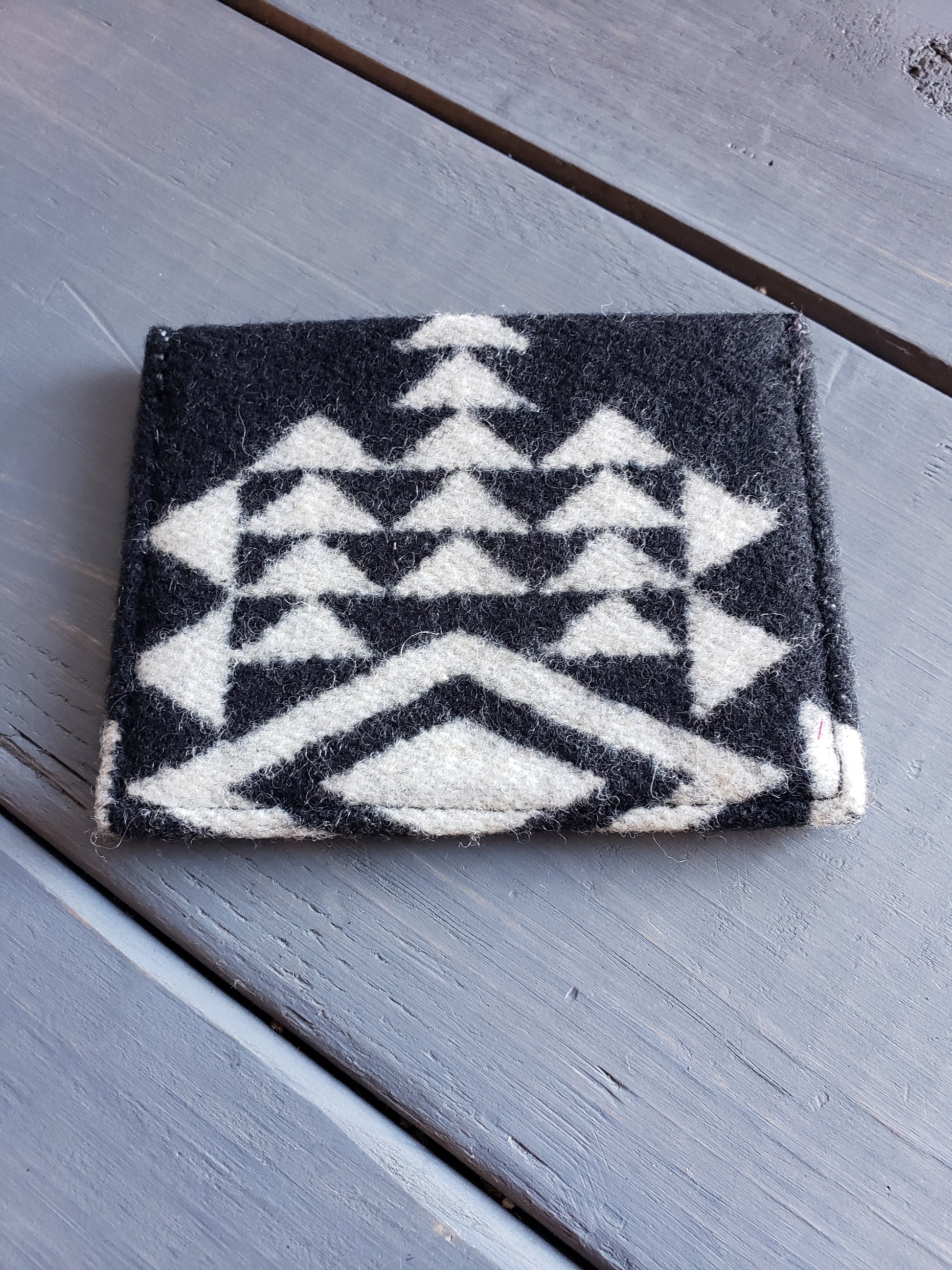 Pendleton Slim Wallet. 3 card slots plus an inner cash slot for folded bills. The front is Wool, the card slots are cowhide leather and the inner lining is nylon. This wallet measures 4 x 3 inches. The pattern placement may vary.
