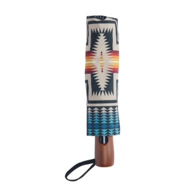 A rainy-day essential with unmistakable Pendleton style. This compact umbrella features our iconic Harding pattern across a durable polyester canopy. Automatic open with a 22" collapsible shaft for easy stowing in bags or backpacks. Velcro close strap and matching fabric cover.