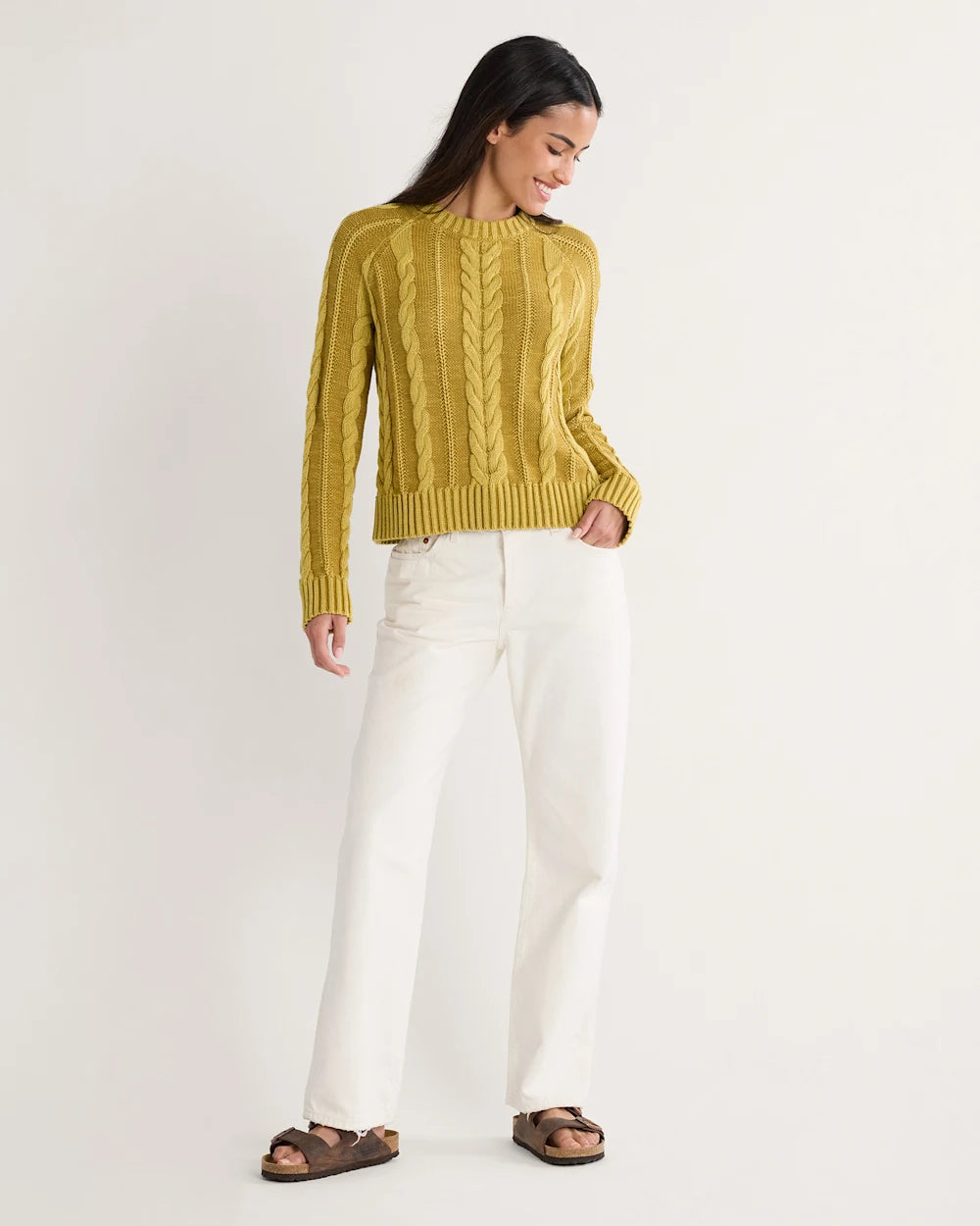 Two slightly contrasting yarns are plaited together to create a depth of sage color in this sweater, giving it a unique, sun-bleached look. All-over cabling, raglan sleeves, and a slightly relaxed neck.