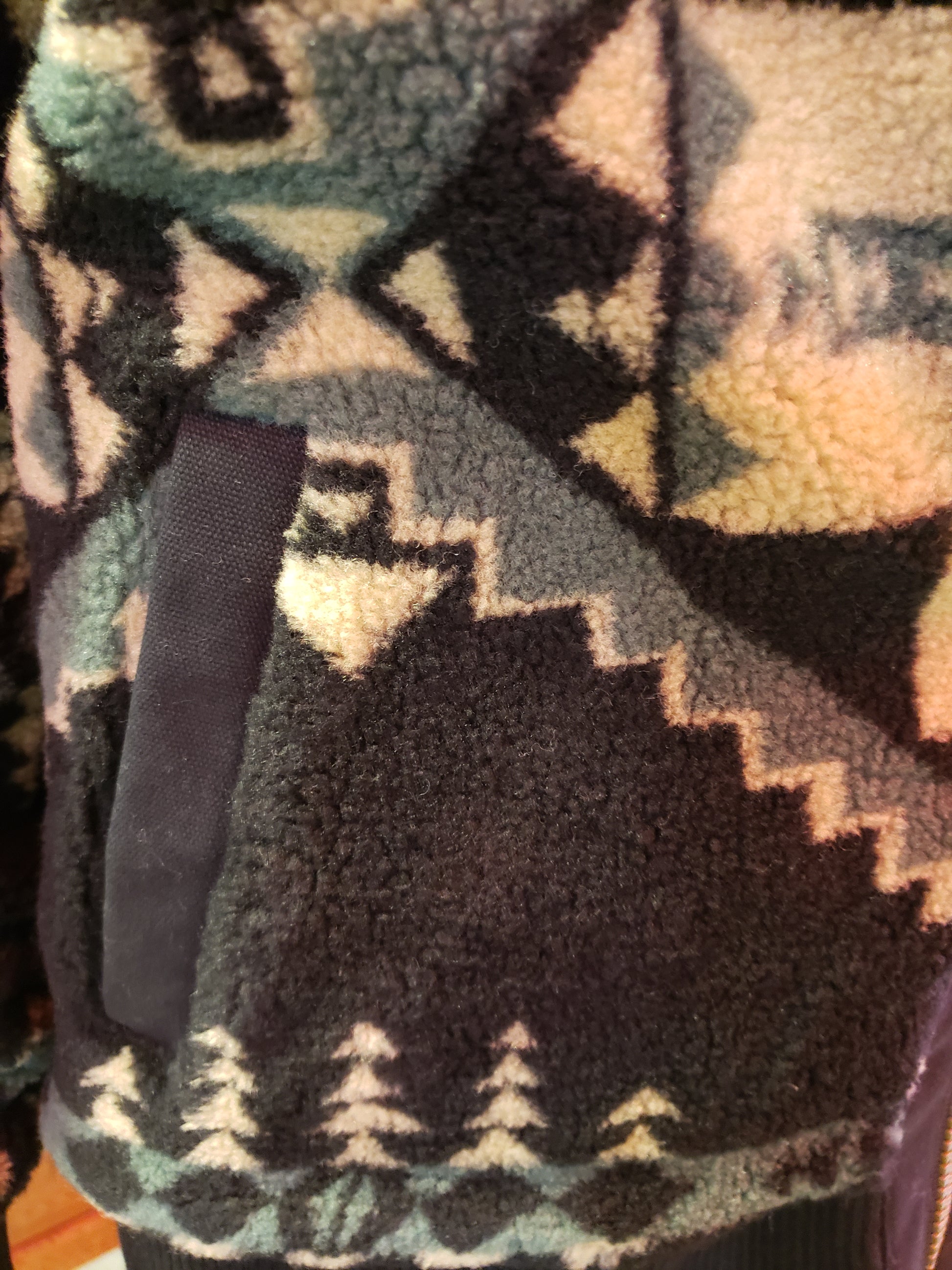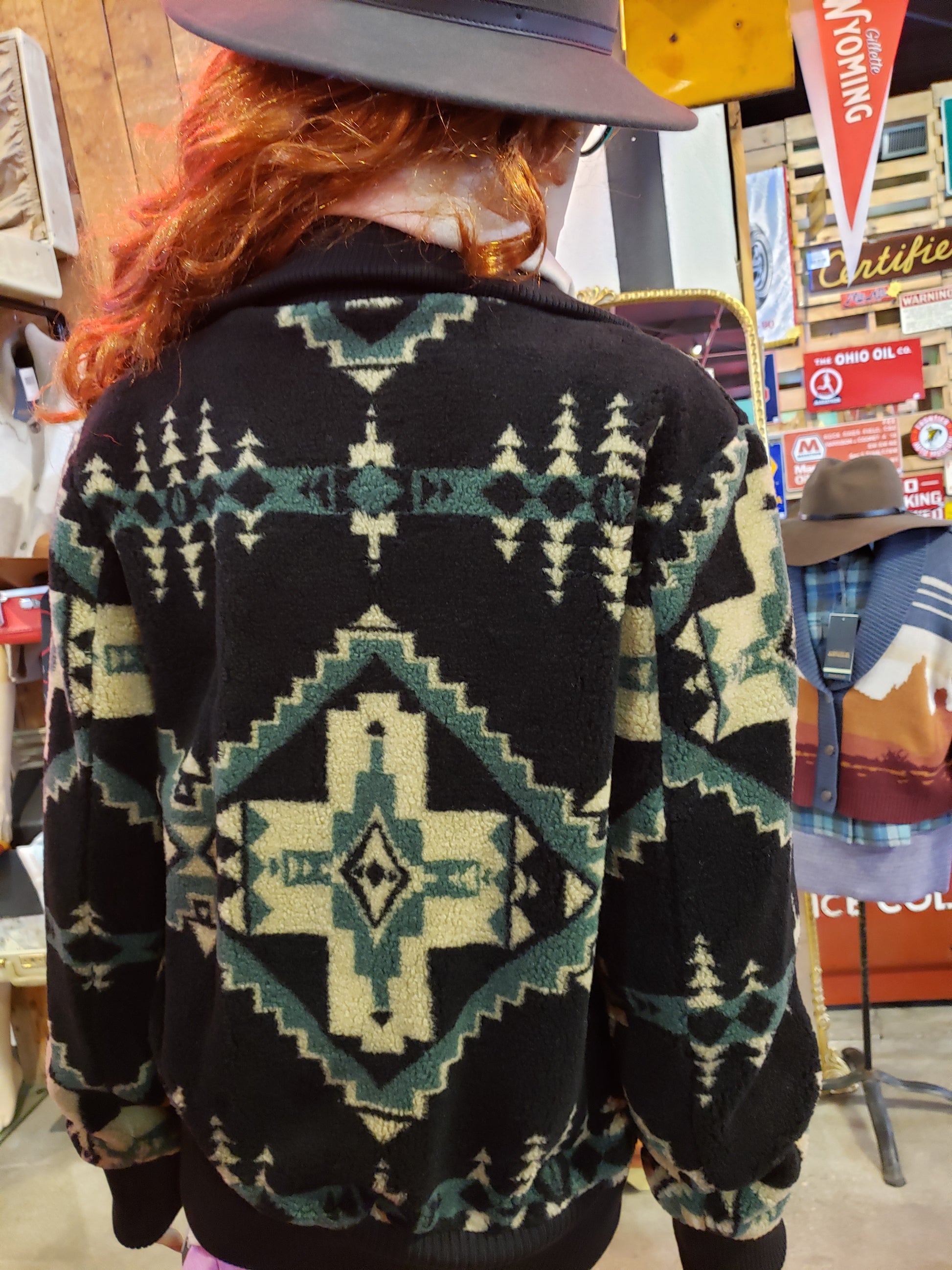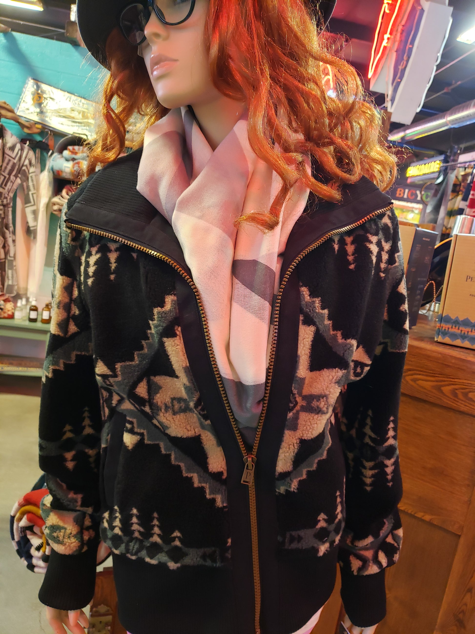 Women's cozy jacket knit from soft, plush Berber fleece in an exclusive pattern drawn from one of our iconic blankets. Wide, solid-color ribbed knit cuffs and hem. Zip front and two side-entry pockets are trimmed in Big Sky cotton canvas. Inside cell phone pocket. Fixed pattern placement.