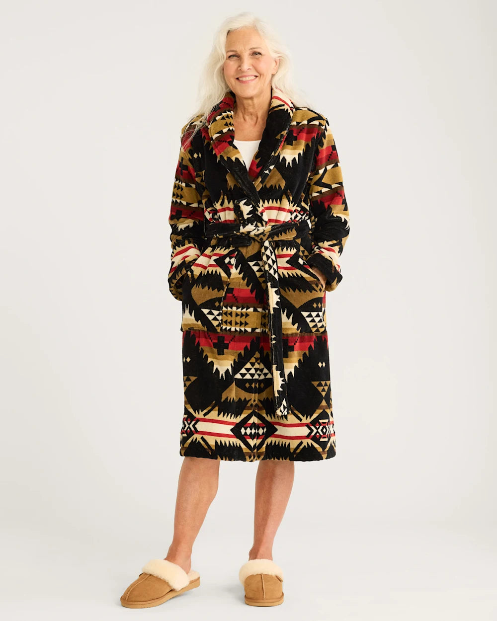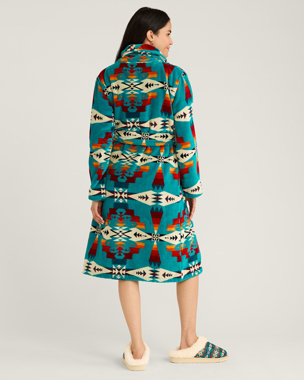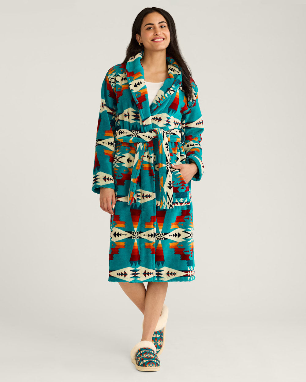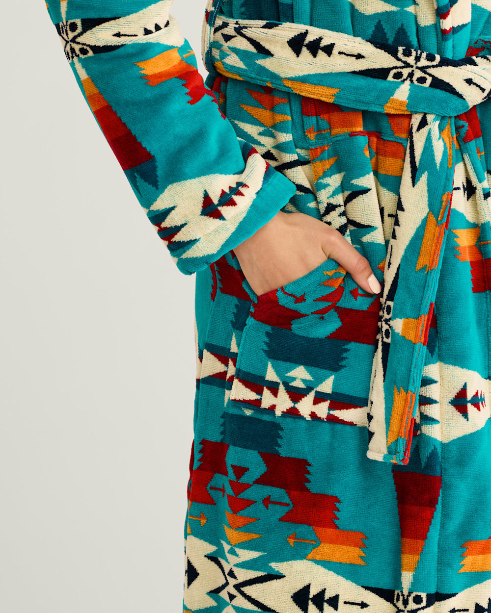 A women's version of our popular unisex pure-cotton wrap robe, featuring our brightly colored Tucson pattern. Plush and velvety soft outside, with absorbent loops inside. Shawl collar, two deep pockets and a self-fabric waist tie.