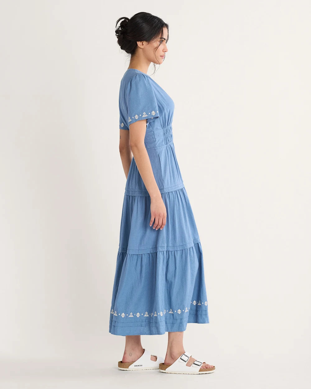 An airy linen blend makes this tiered dress an easy and versatile choice. Band collar with open placket, elasticized gathers at waist, embroidered trim at hems.