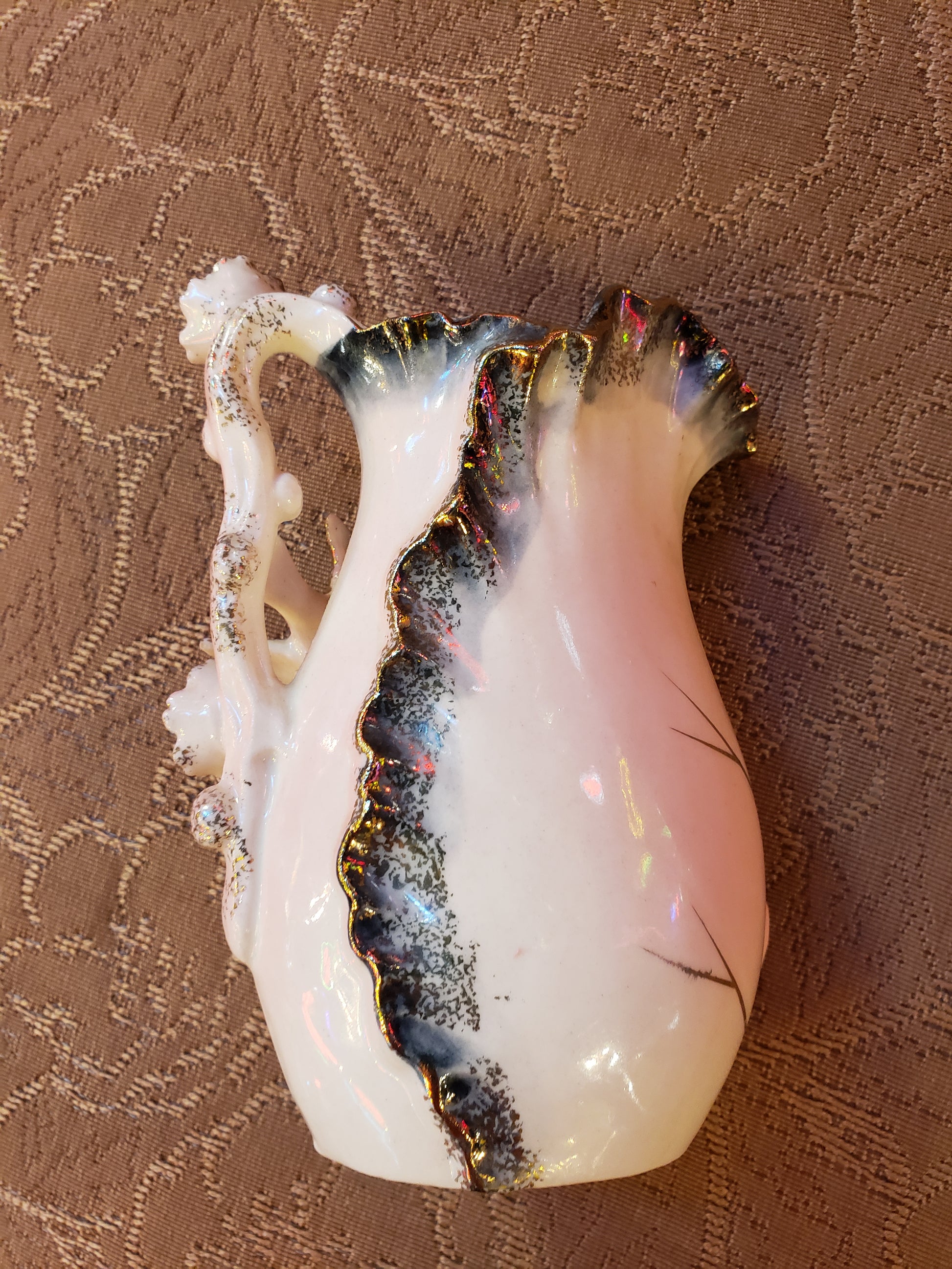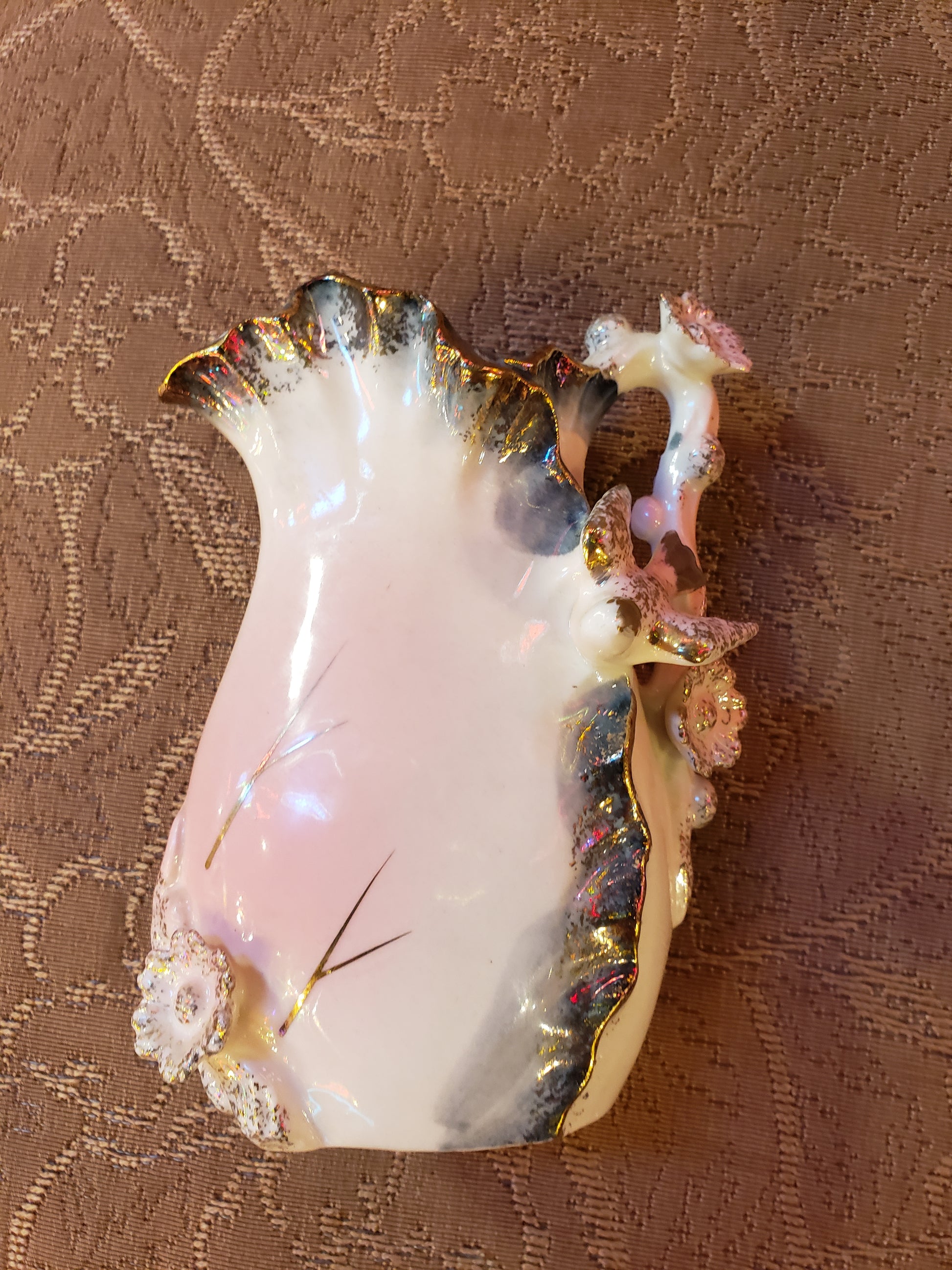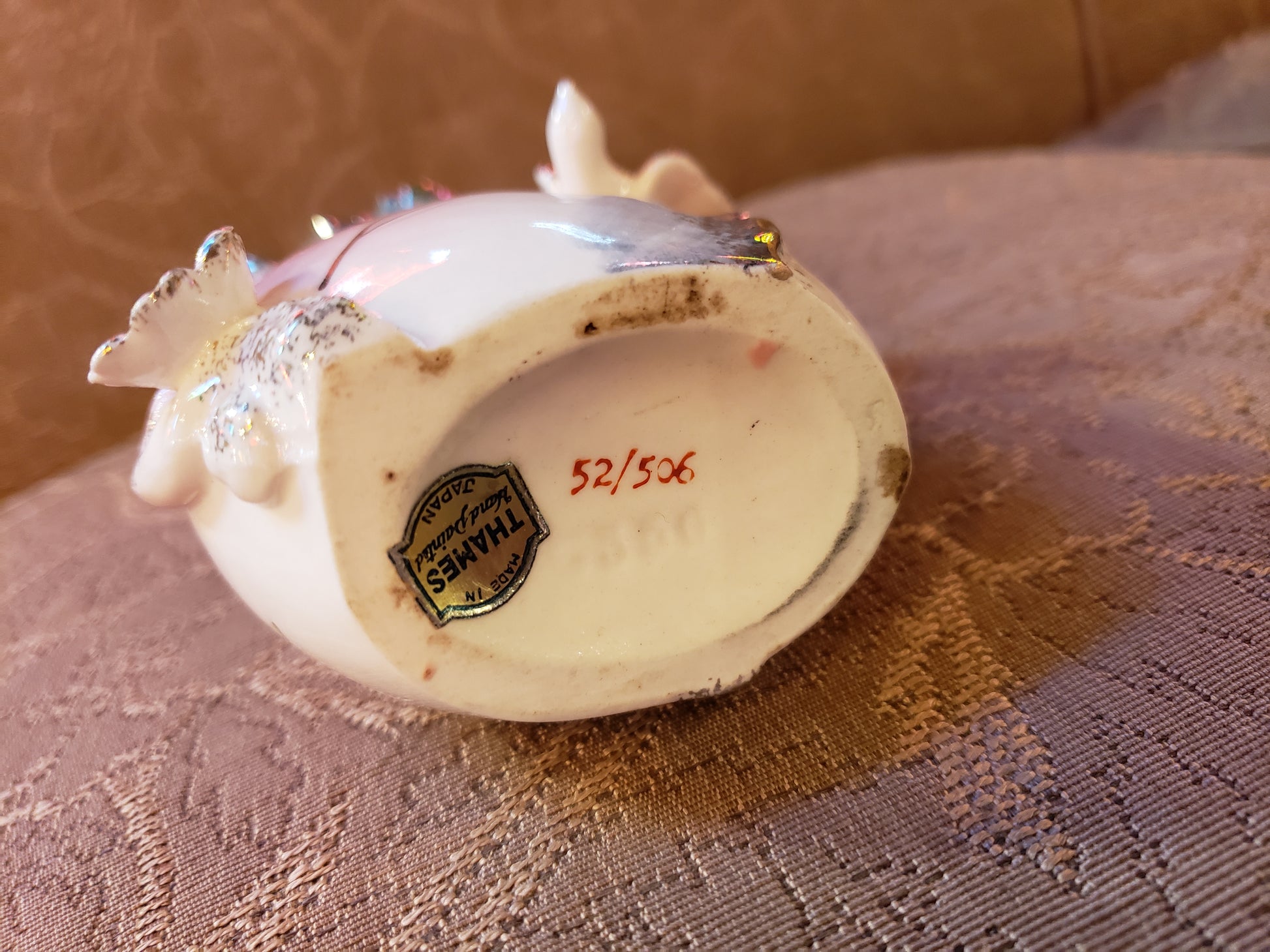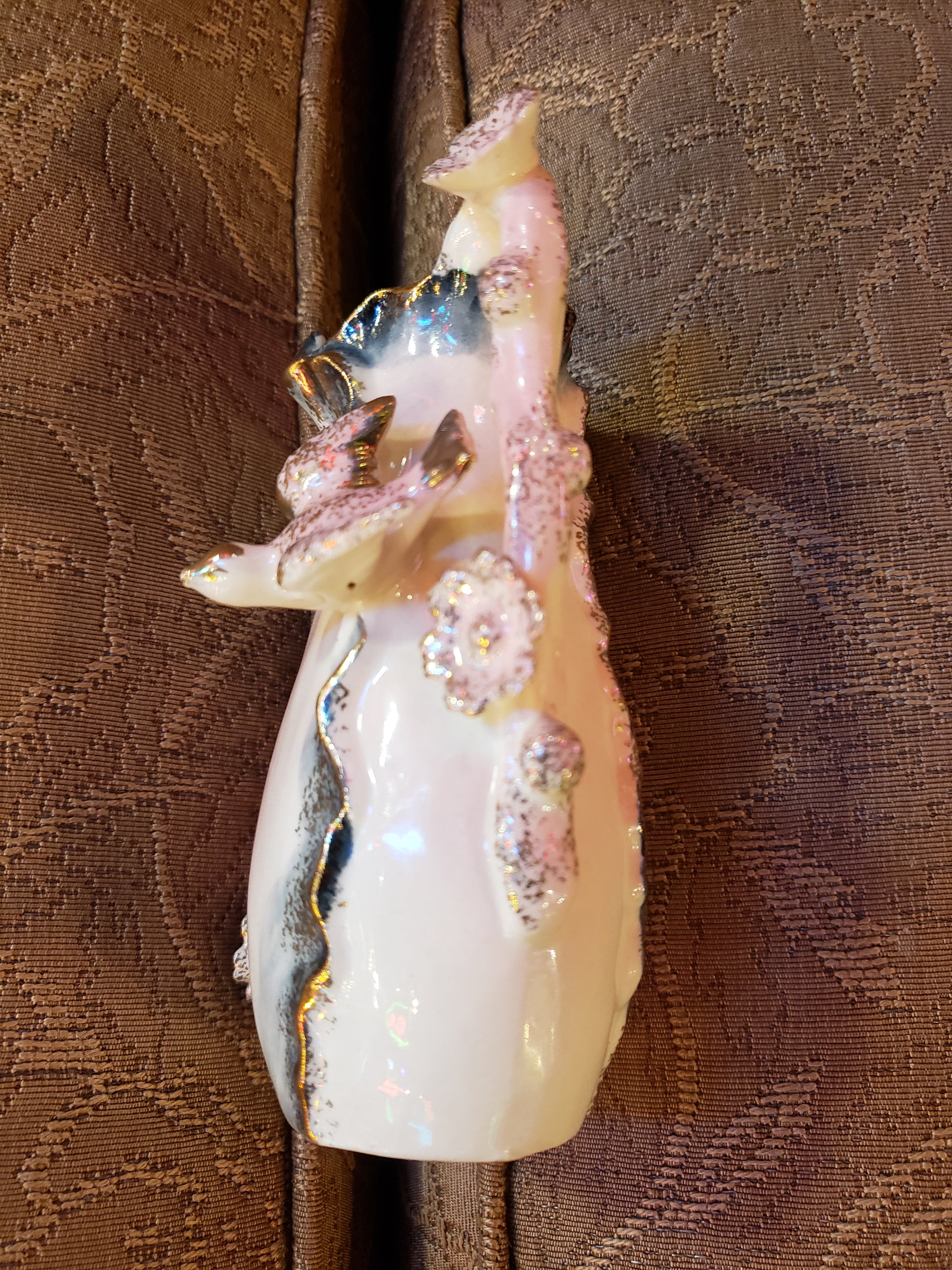 THAMES Hand Painted porcelain vase is Pink and grey with golden accents. On the base is numbered 52/506 . It is a pretty multidimensional vase with uplifted flowers and birds. A lovely mid century vase in fair vintage condition.