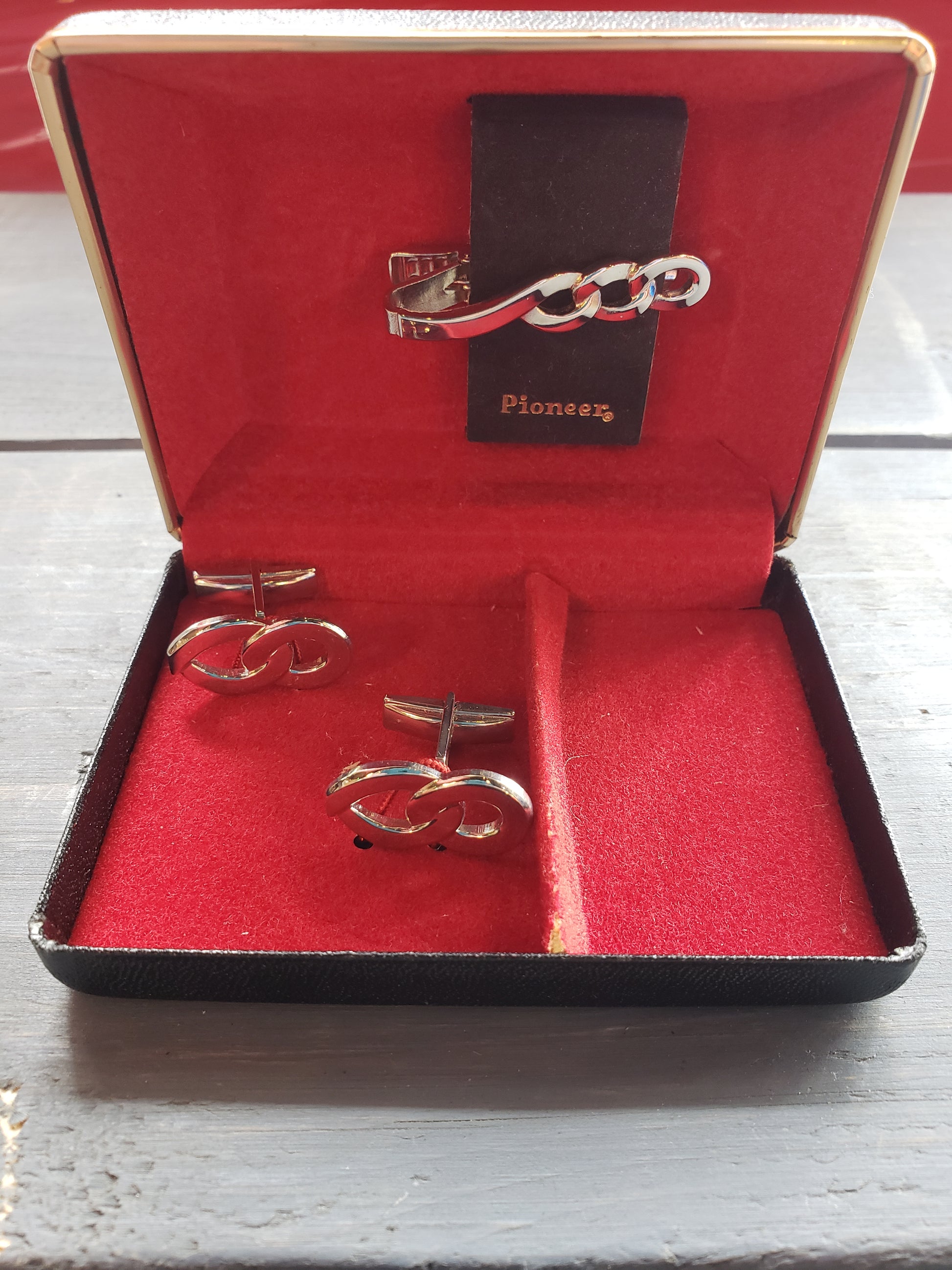 Elevate your style with the Pioneer brand cuff link and tie bar set, designed to add a refined touch to any outfit. Crafted for durability and elegance, this set ensures you make a confident impression at every occasion. Perfect for professionals and trendsetters alike, it combines functionality with timeless sophistication. Fair vintage condition.
