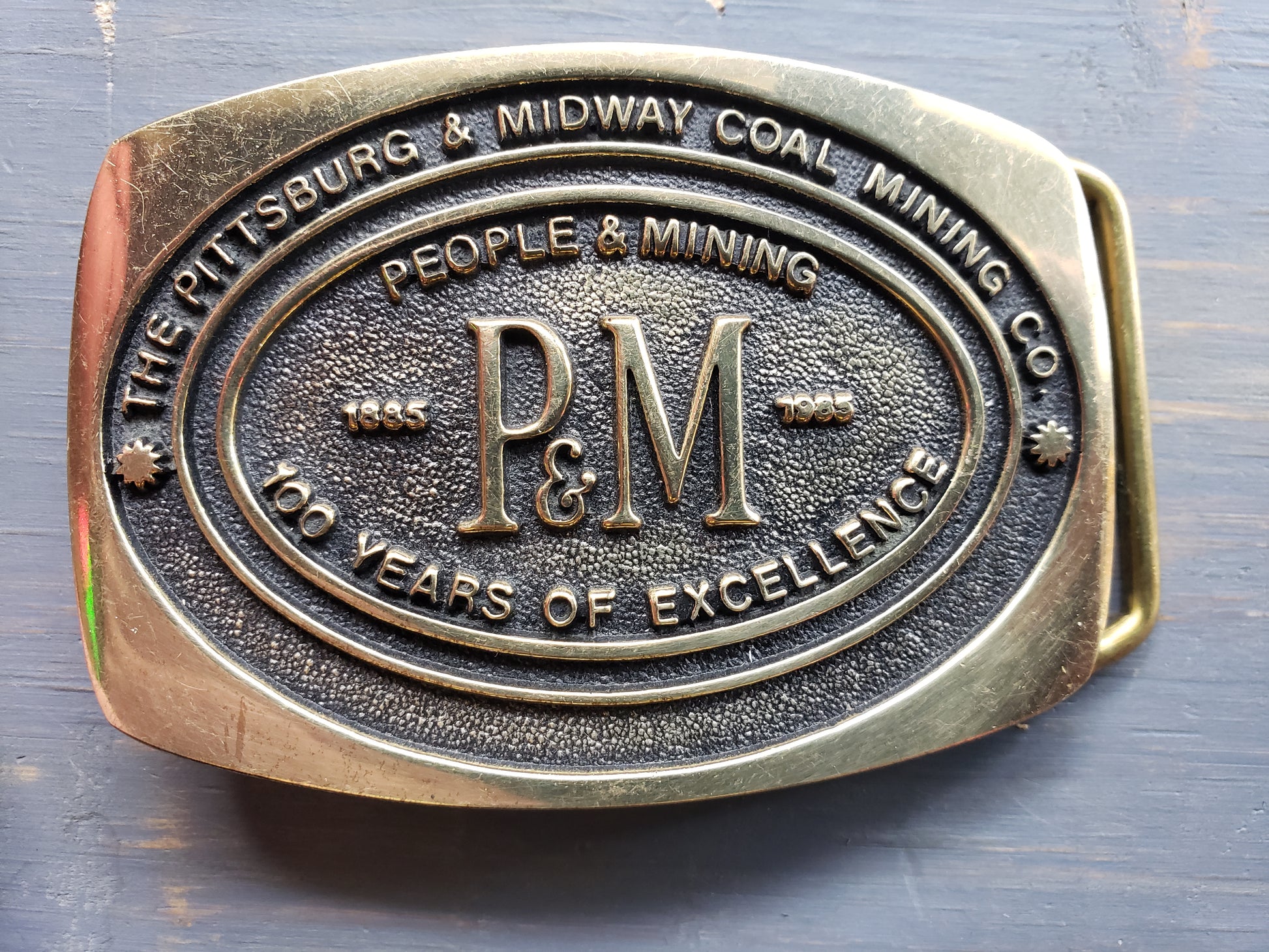 Solid Brass belt buckle advertising Pittsburgh & Midway Coal Mining belt buckle, the "People & Mining" company. Commemorates 100 years of excellence. Rare belt buckle in fair vintage condition.