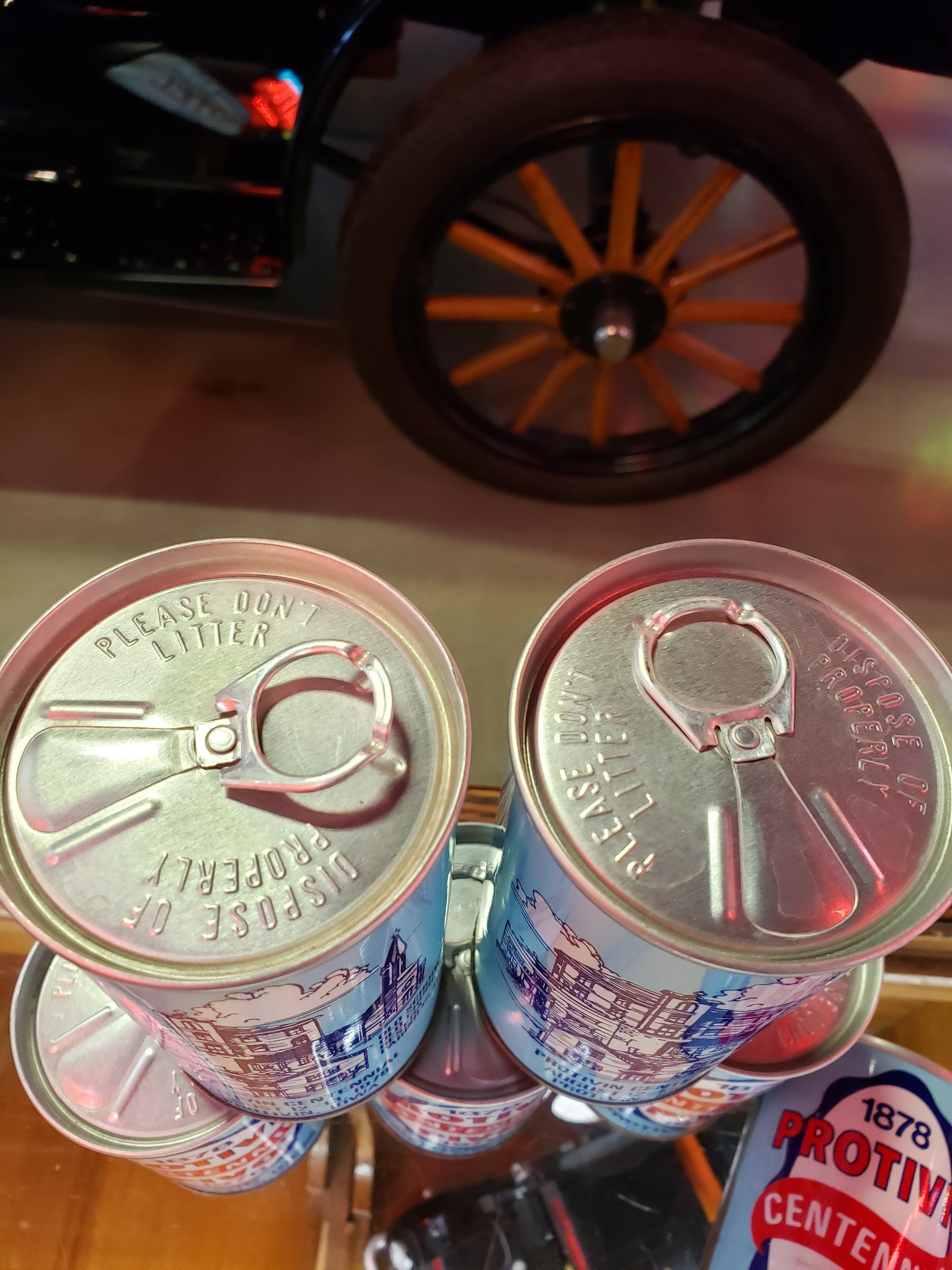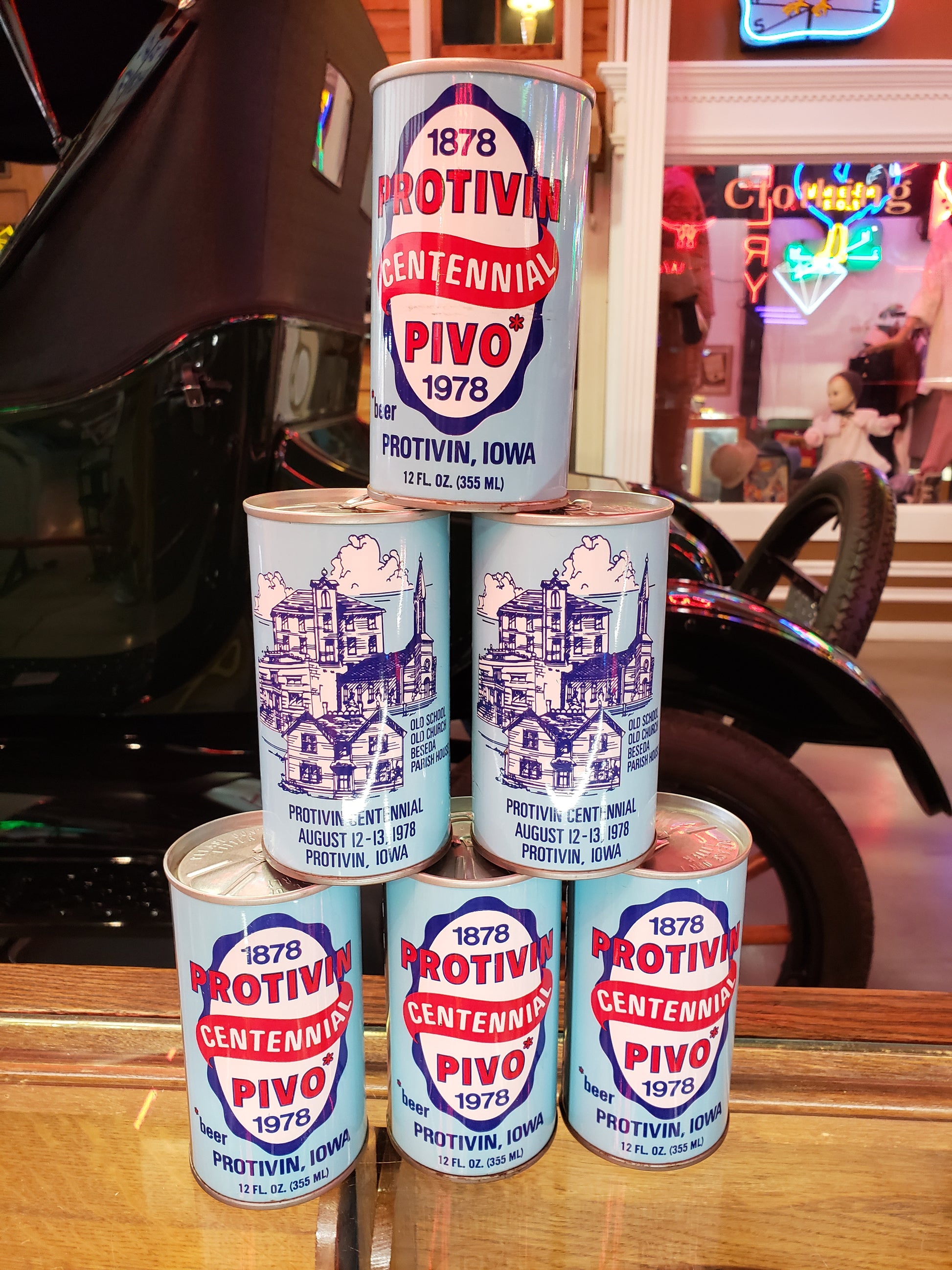 PIVO is the Czech word for "Beer" these cans were made in 1978 to celebrate the centennial of the town of Provitin, Iowa. Brewed and filled by Walter Brewing Company of EU Claire, Wisconsin. The cans were opened on the bottom, the tops remain sealed but there are two puncture holes on the bottom of each can. Selling the cans individually, they are all in the same condition.