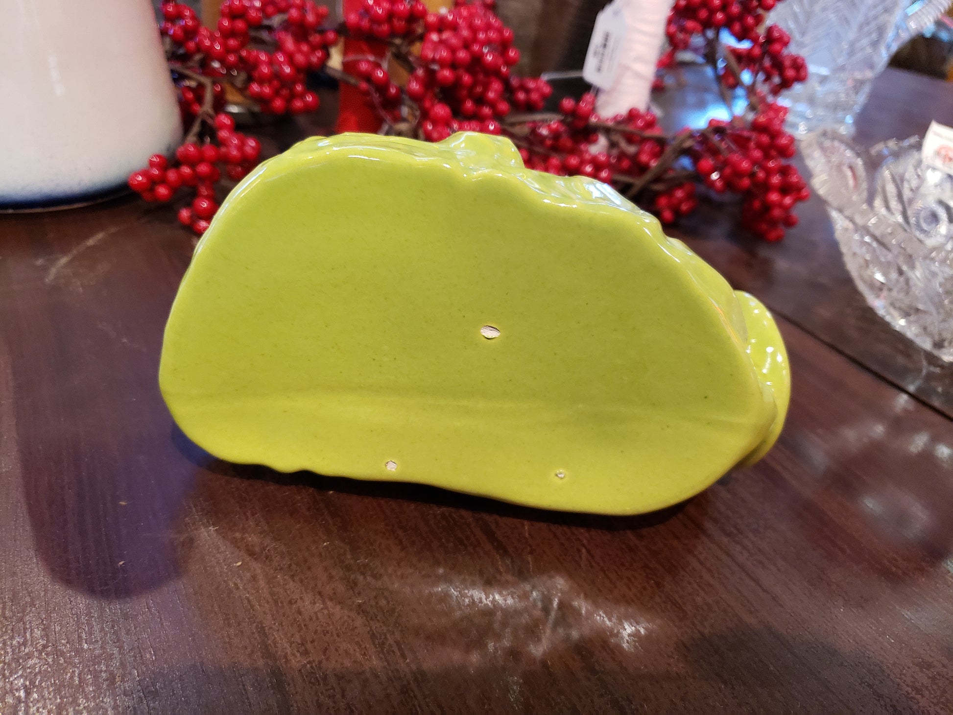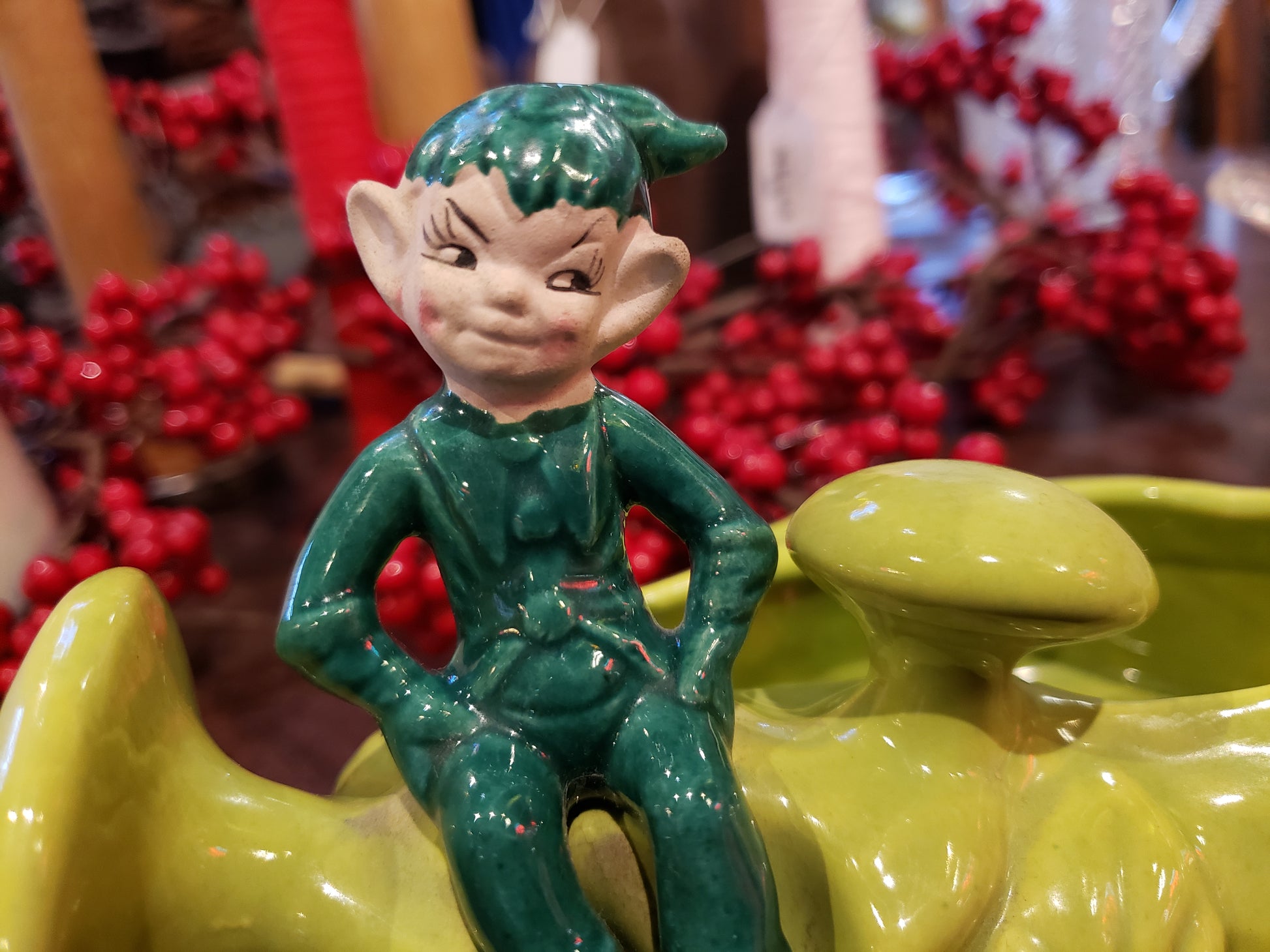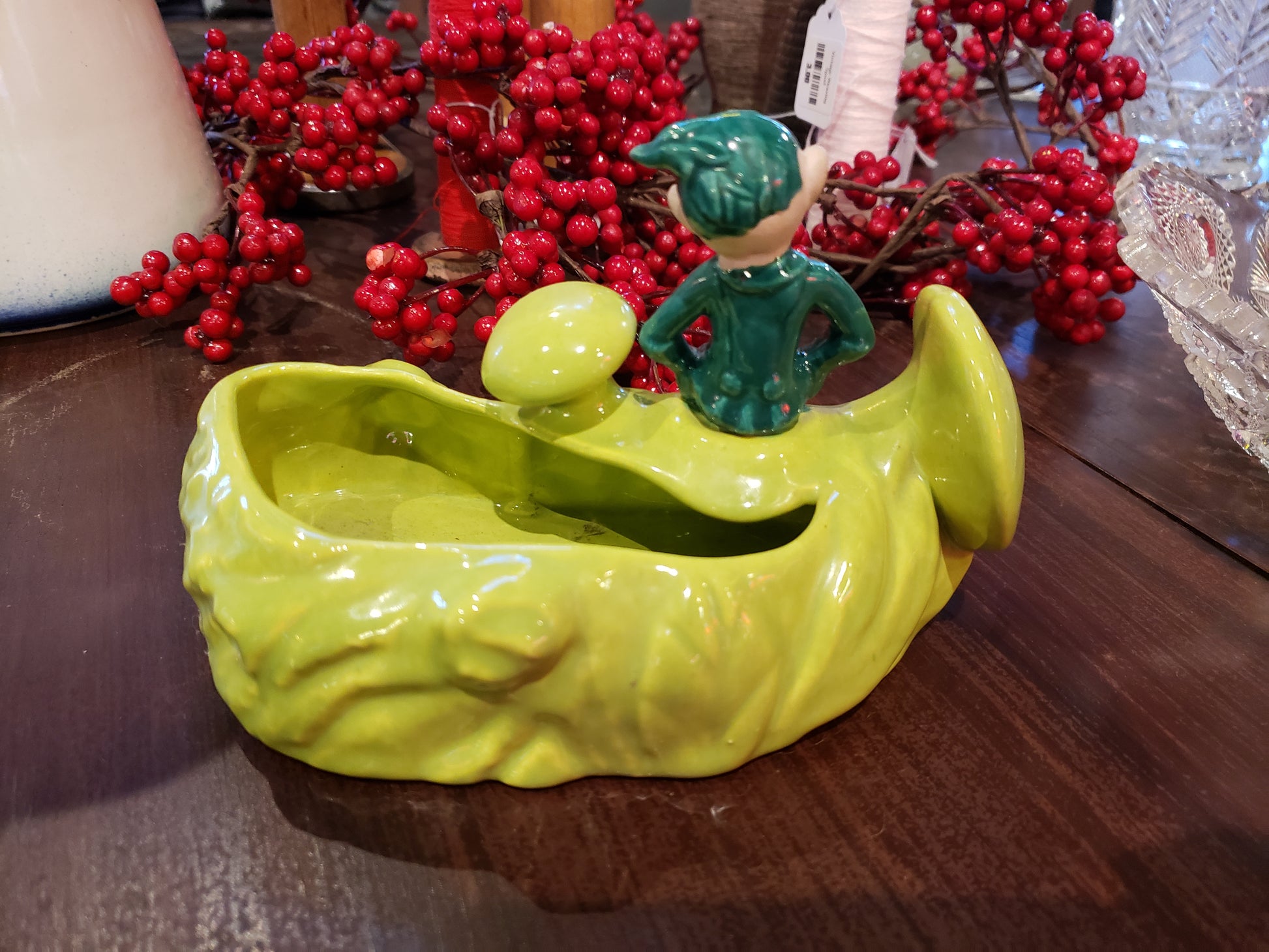 Get ready to add a touch of whimsy to your home with the Pixie Planter! This charming little planter features a mischievous grin that will bring a smile to your face every time you see it. Perfect for adding a playful and unique touch to your indoor space. Light green planter holds a pixie in a glossy green glazed outfit. It's face is unglazed and the hand painted facial features are quite adorable. 4.5 inches tall, 7 inches across and 4 inches wide. A cute mid century decoration in fair vintage condition.
